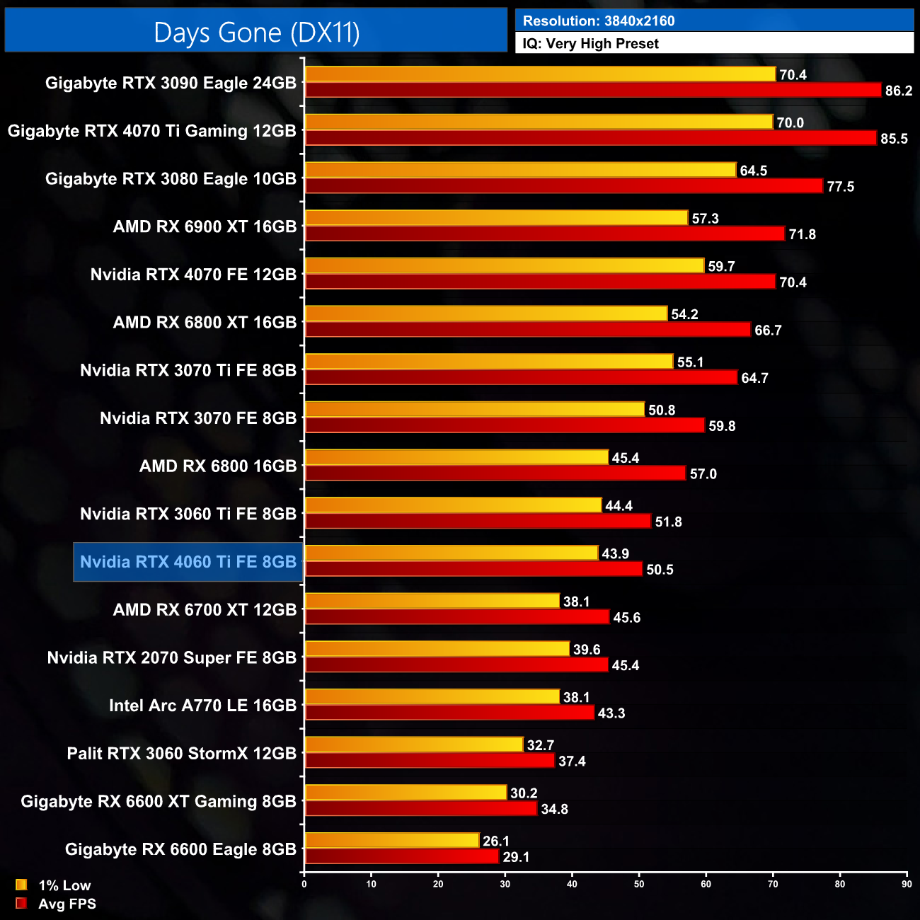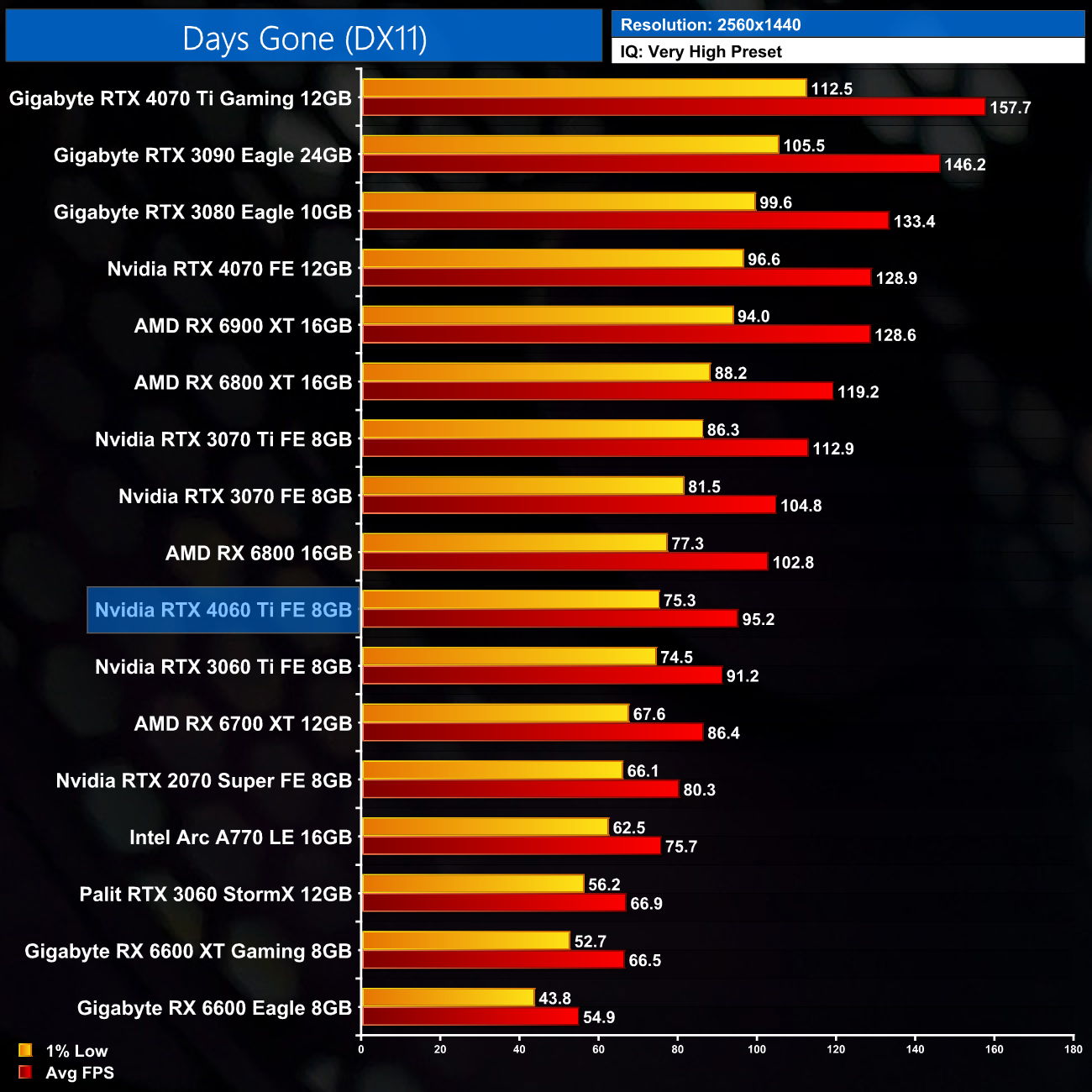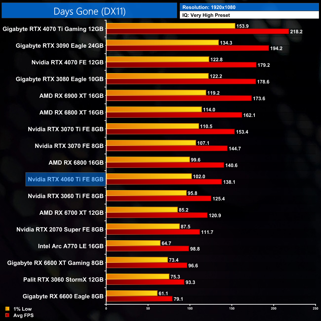Days Gone sees similar gains for the 4060 Ti over the 3060 Ti at 1080p, with the Ada GPU 10% faster on average, delivering 138FPS. Nvidia GPUs do better in this DX11 title than their AMD counterparts, resulting in a 14% victory for the 4060 Ti versus the 6700 XT.