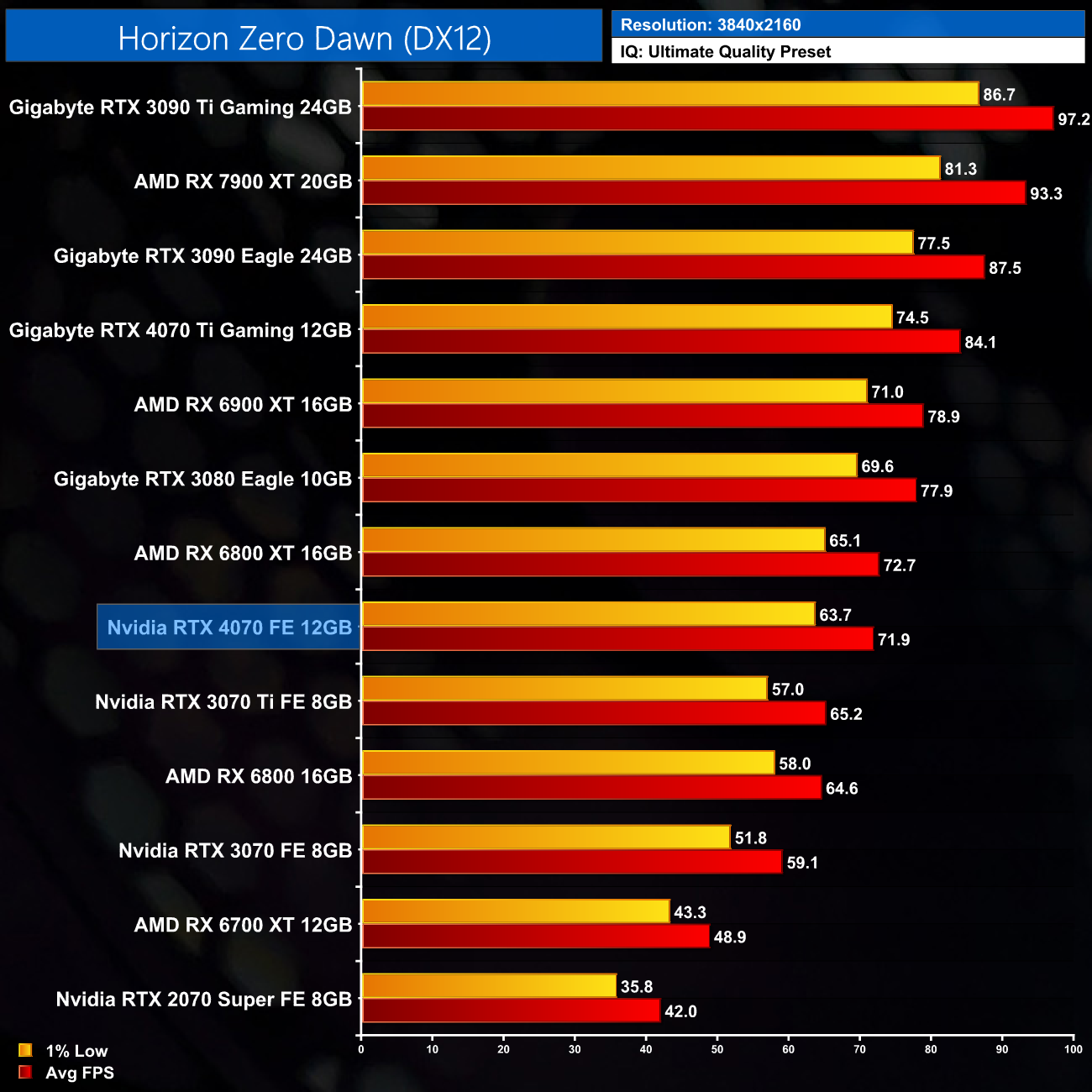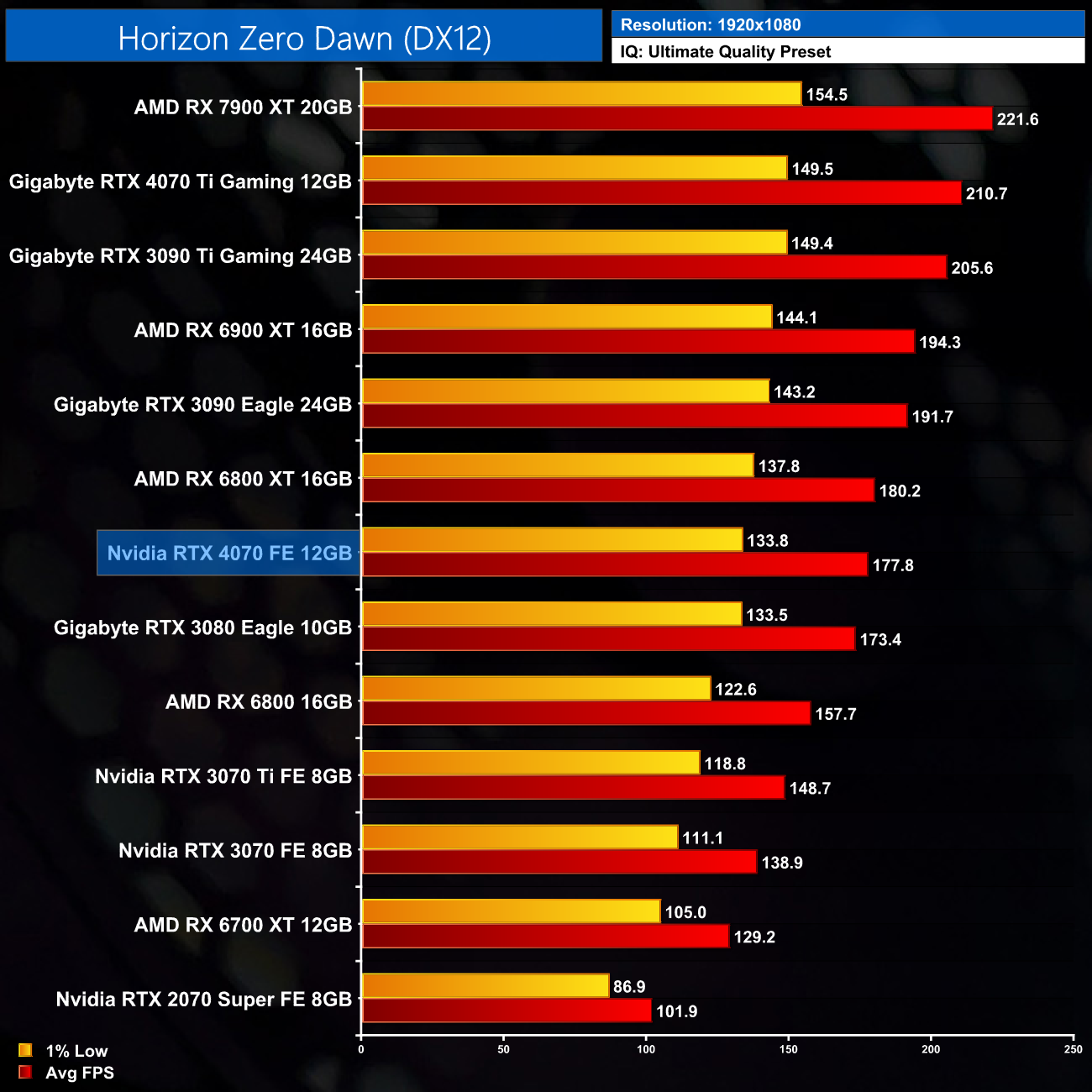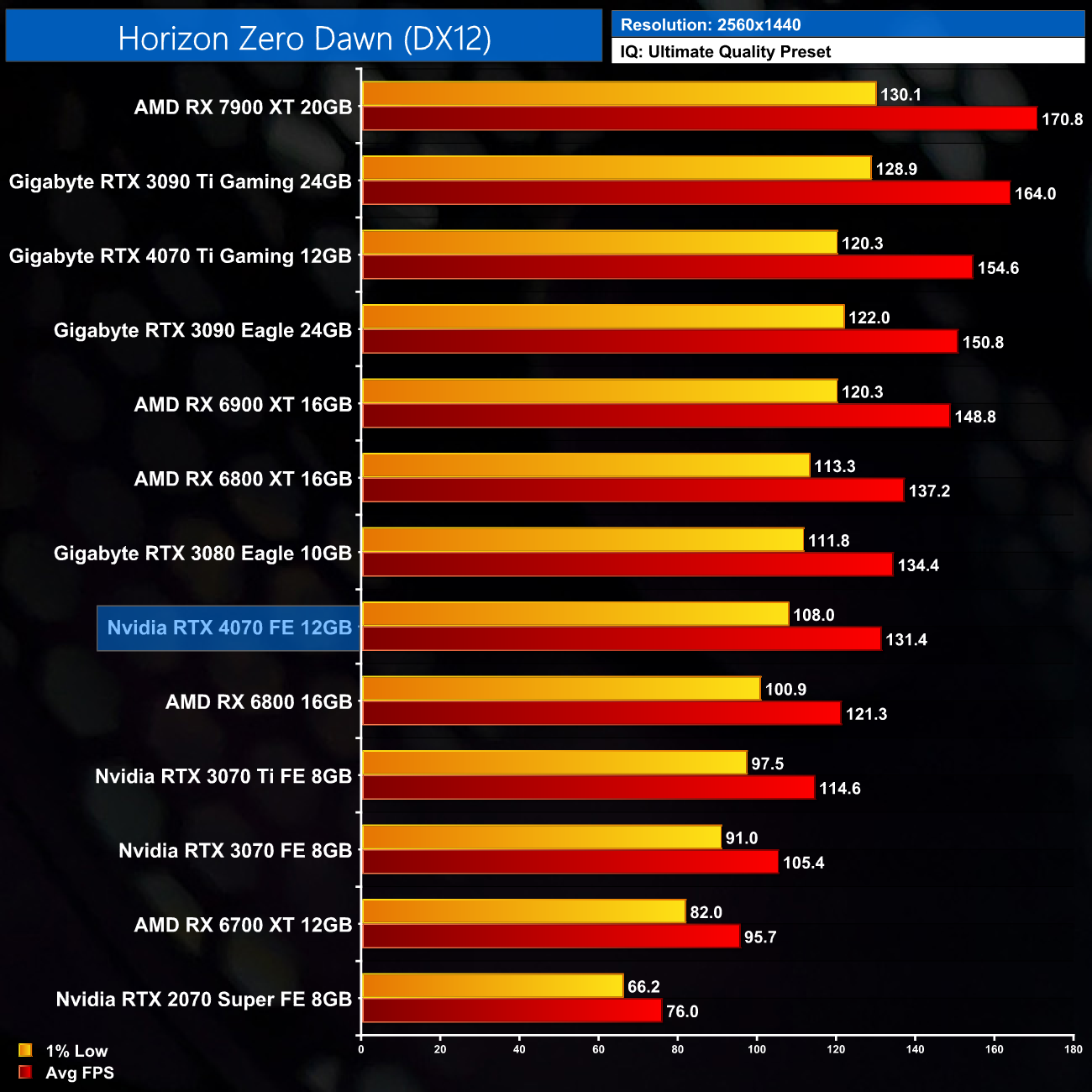 Horizon Zero Dawn is another title that sees very similar performance from the 4070 to the RTX 3080 and 6800 XT. The 4070 is just 4% slower than the latter card at 1440p, delivering a 15% boost over the RTX 3070 Ti.