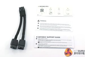 Inside, we find a few support guides and pieces of documentation, along with a dual 8-pin to 16-pin 12VHPWR adapter.