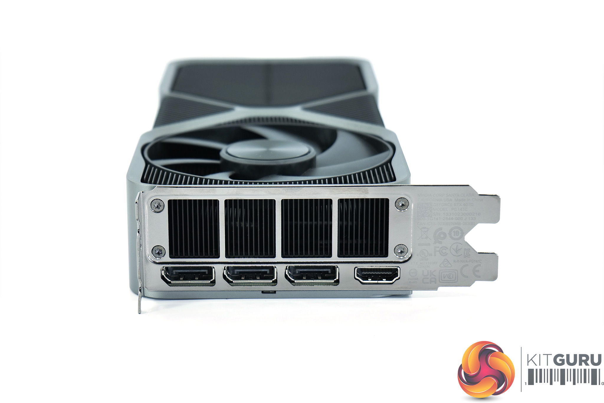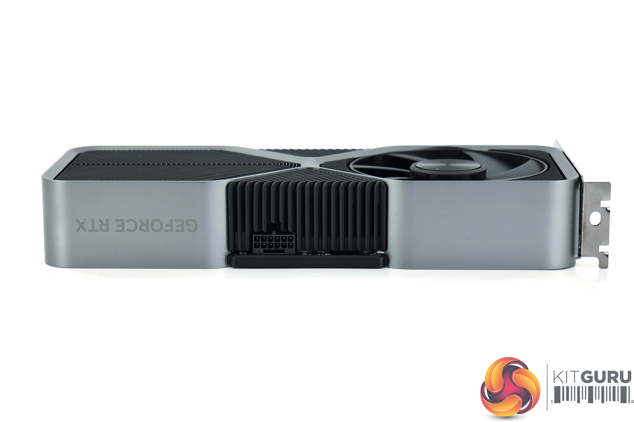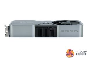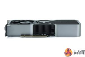 The side of the card is fairly plain, with the grey metal frame on show, along with some aluminium heatsink fins. The GeForce RTX branding is also present here towards the end of the card.