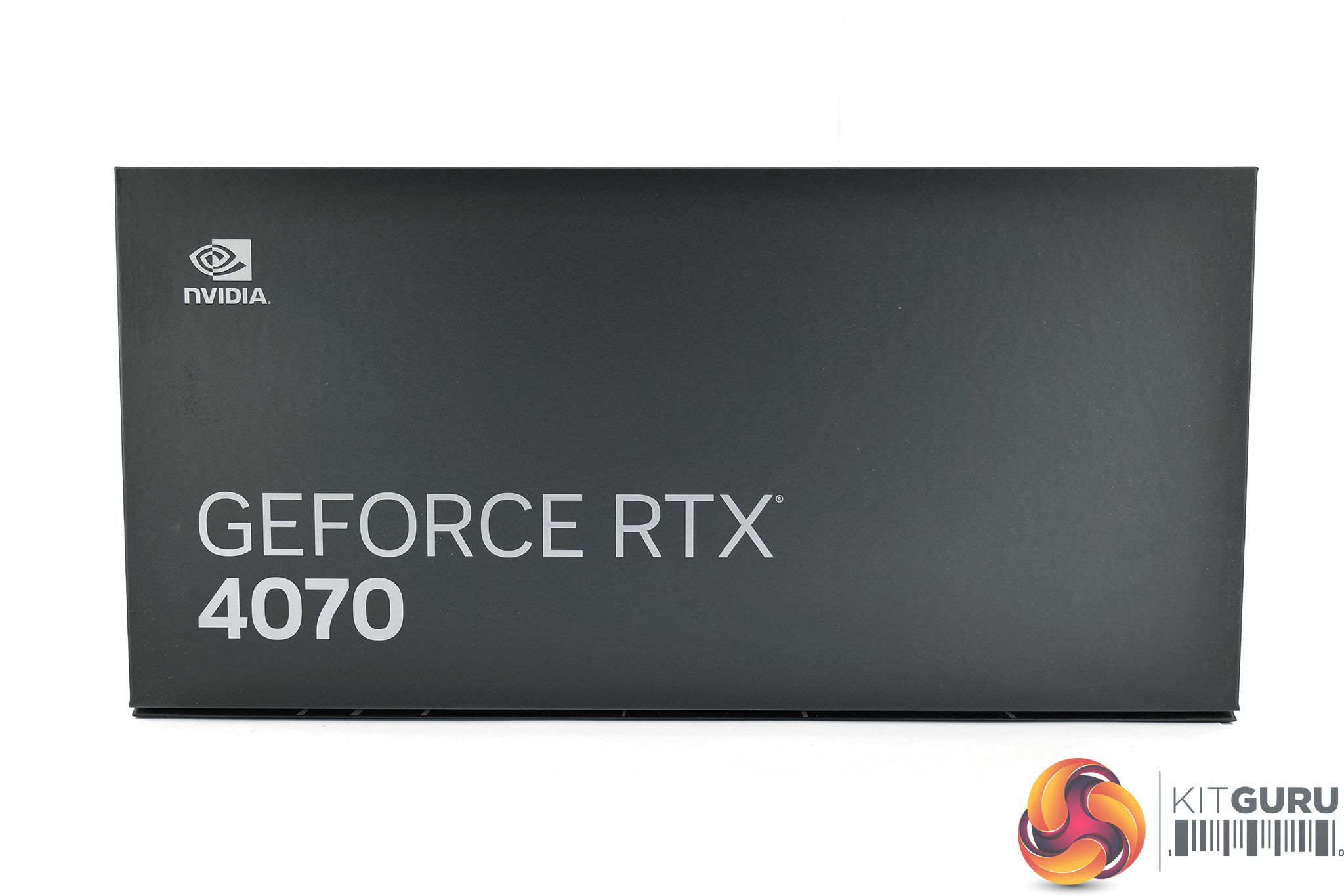 The RTX 4070 Founders Edition ships in identical packaging to the RTX 4080 or 4090 Founders. The front of the box opens up to reveal the card sitting in the middle of the cardboard surround.