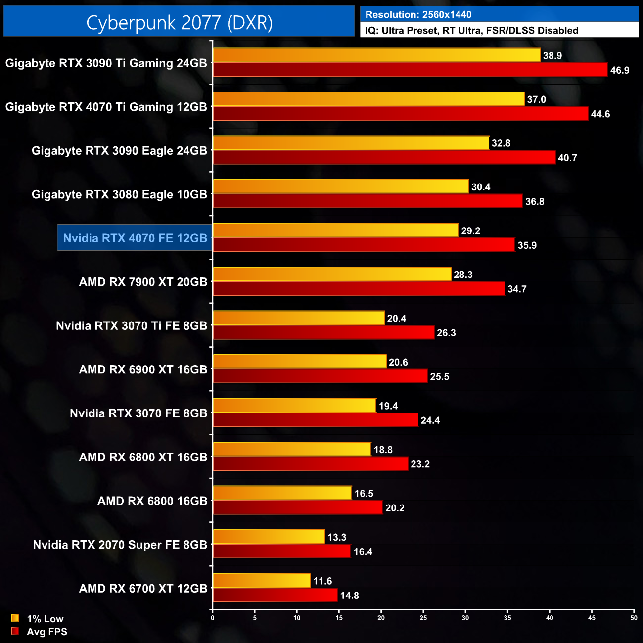 Cyberpunk is one of the most taxing ray traced games currently – and that's without even touching on the new RT Overdrive mode! At 1080p the 4070 delivers just under 59FPS, where it is on par with the RTX 3080, but impressively 9% faster than AMD's much more expensive RX 7900 XT.