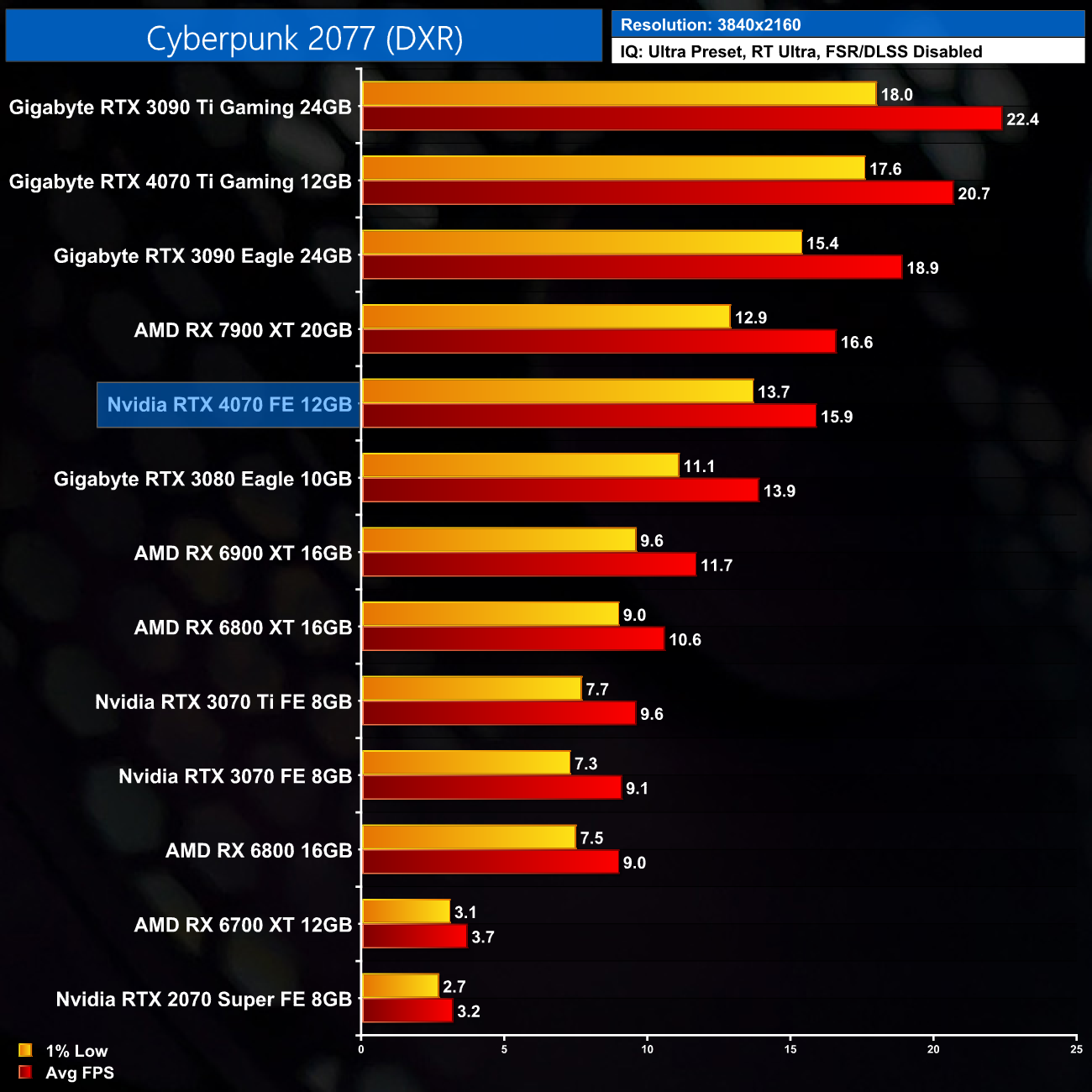 At 1440p you'd likely want to engage DLSS (which we benchmark later in this review), with 36FPS at native resolution it's not overly smooth, but the 4070 is still roughly level with the RTX 3080, but now a hefty 37% faster than the RTX 3070 Ti, with VRAM again a possible factor there.