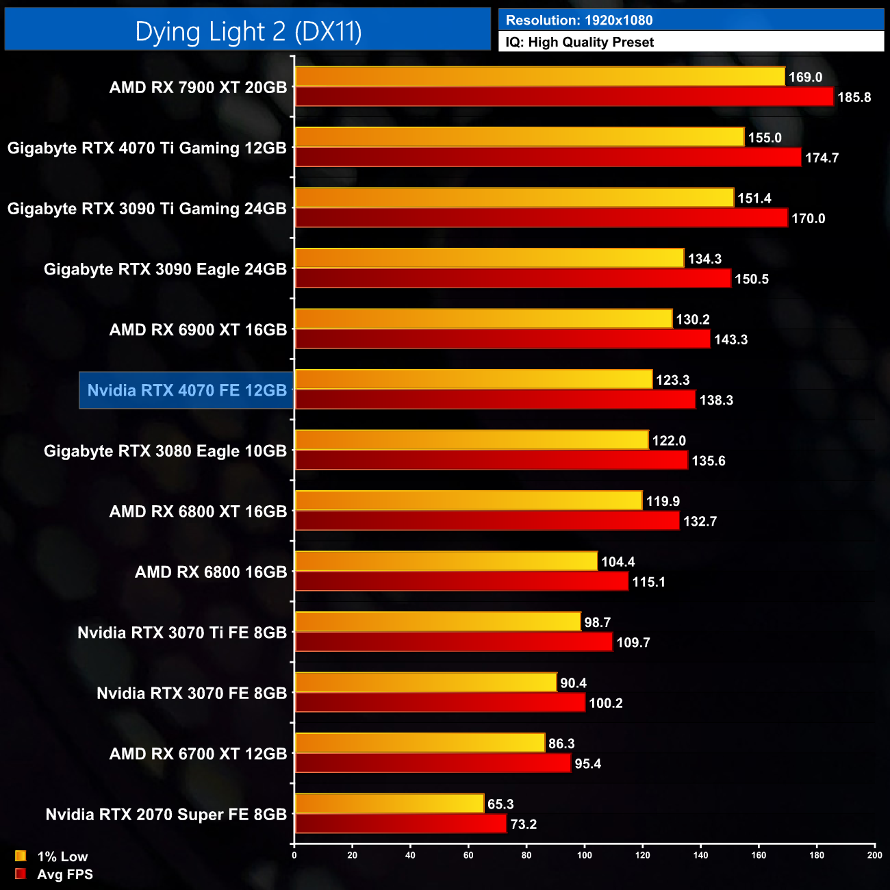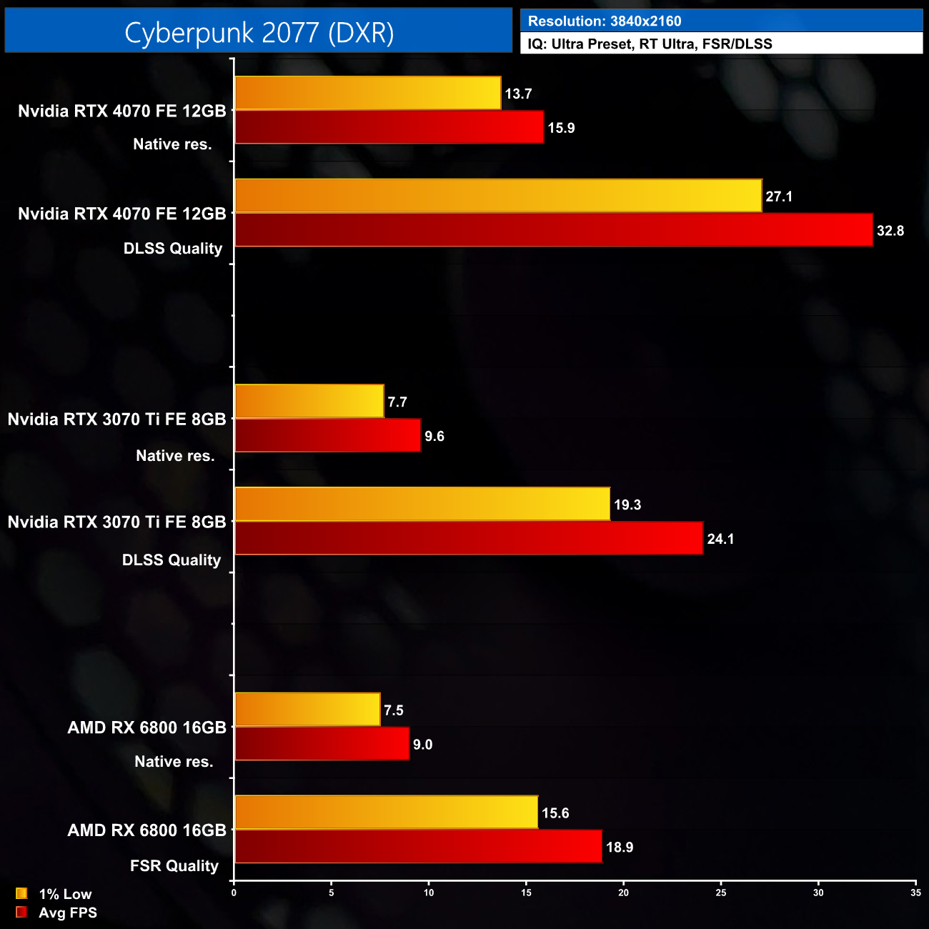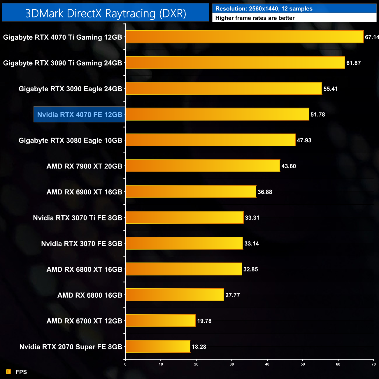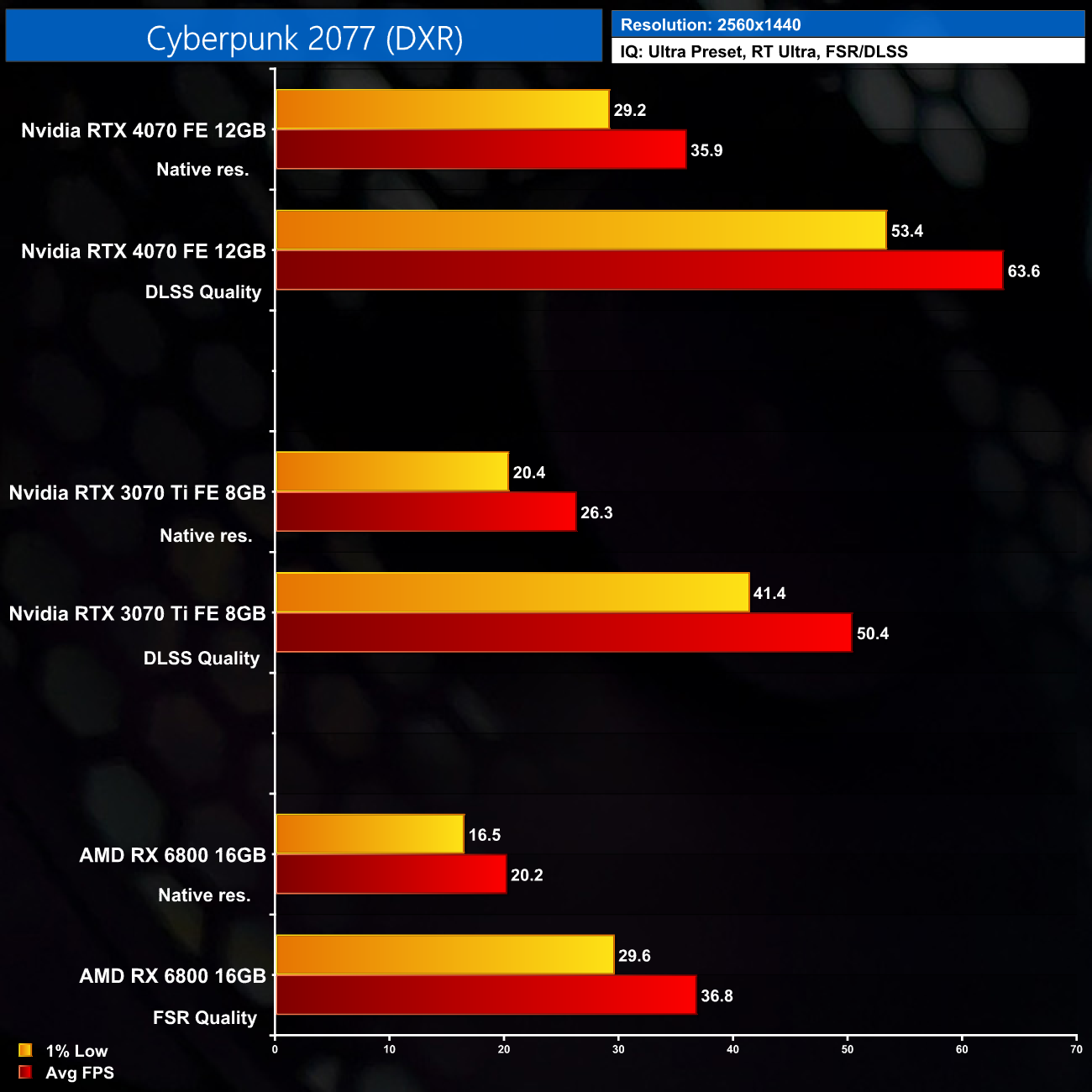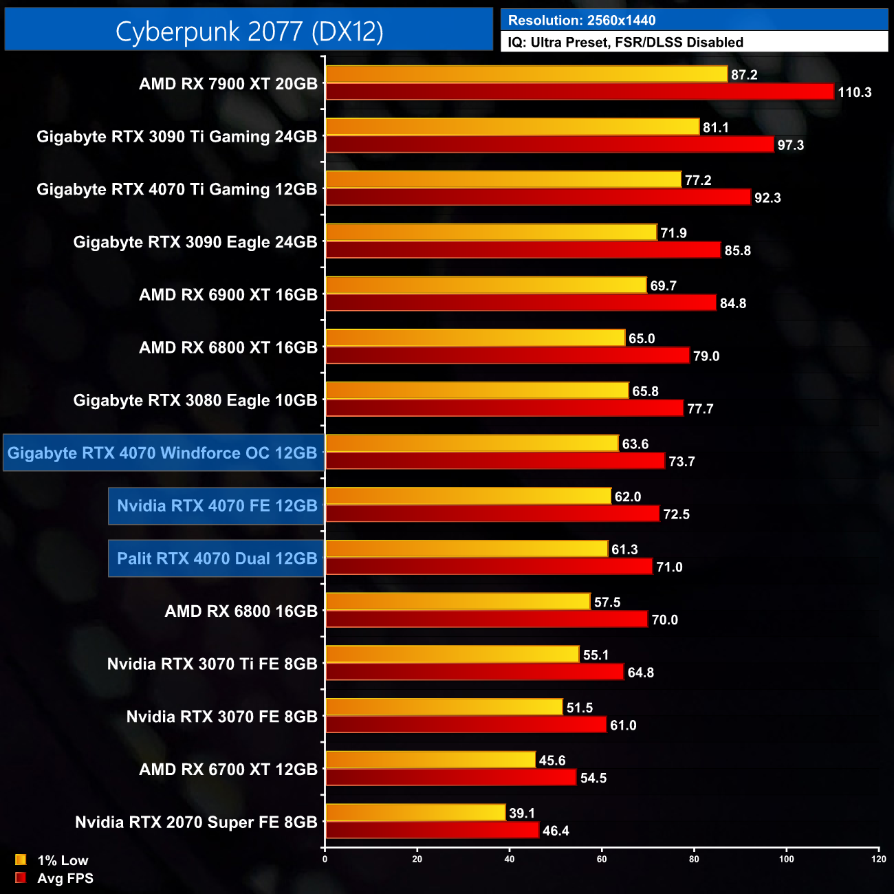 At 1440p the 4070 is still good for 63FPS on average, and that's before enabling DLSS (which we benchmark on the next page of this review.) It's still 5% slower than the RTX 3080, but also still 17% ahead of the RX 6900 XT, while that margin increases to 22% versus the RTX 3070 Ti.