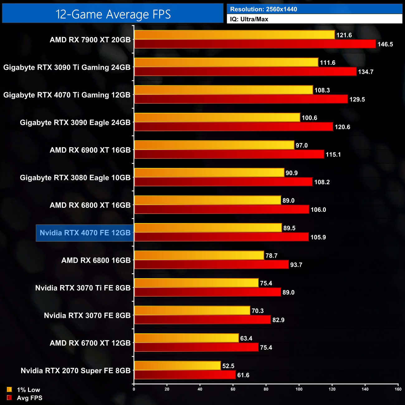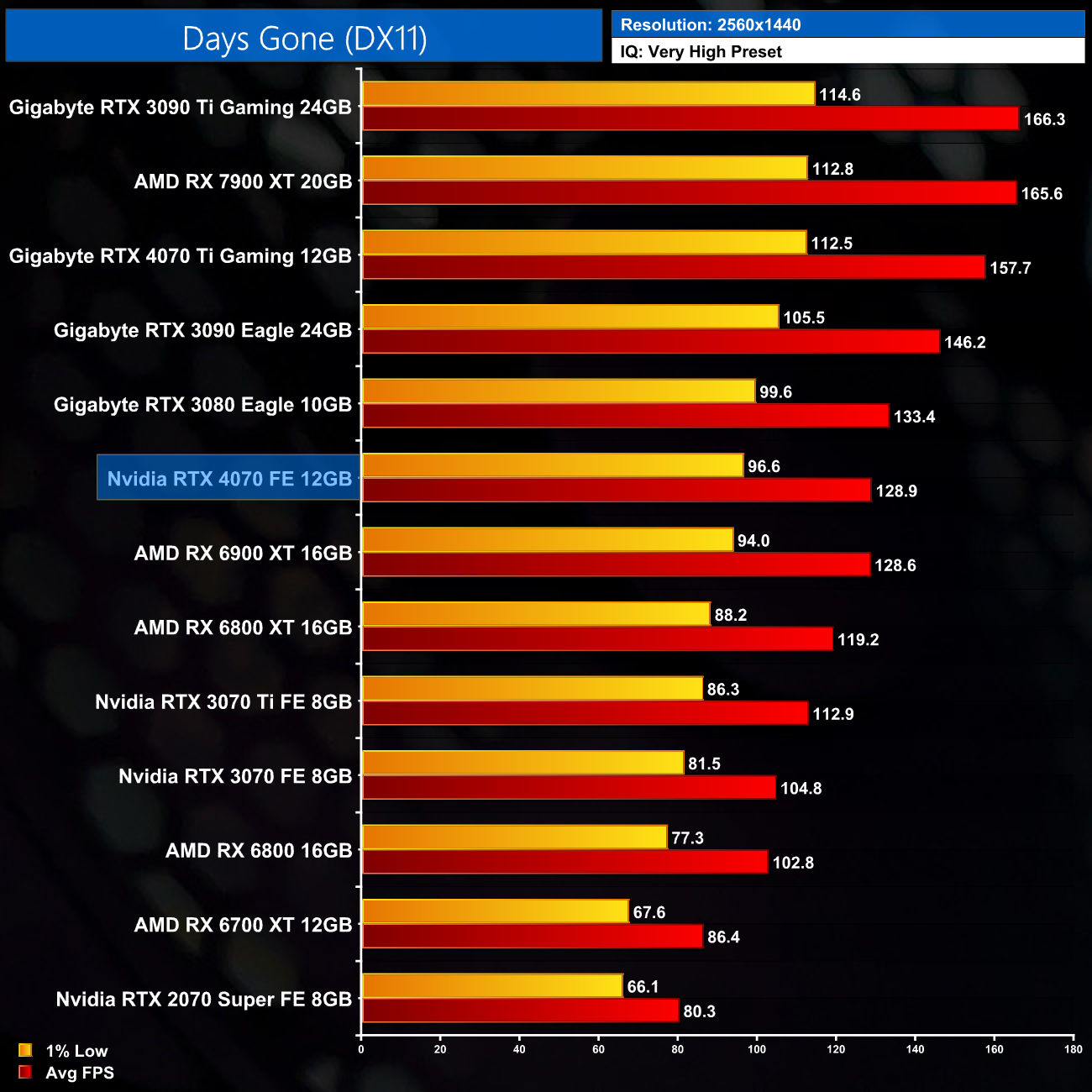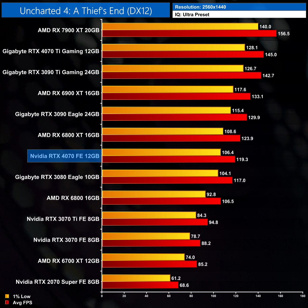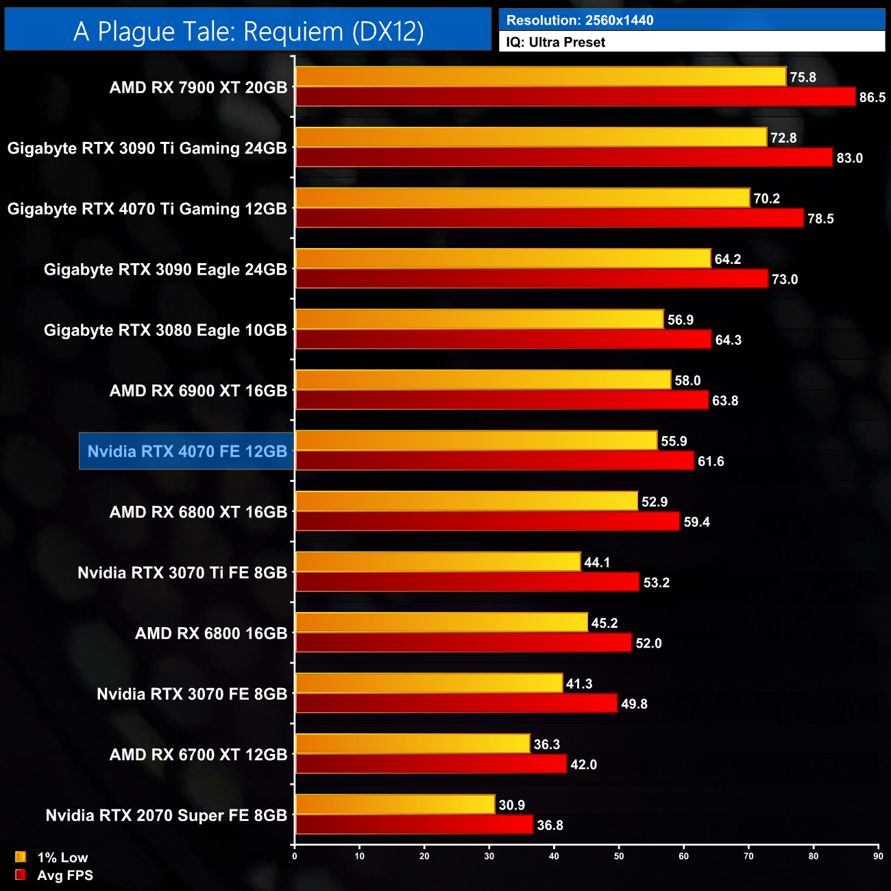 Even at 1440p we see a frame rate north of 87FPS, with the 4070 now just 5% slower than the 7900 XT – although its 1% lows aren't quite so smooth. Versus the 3070 Ti, we're looking at a 22% margin of victory for the Ada GPU.