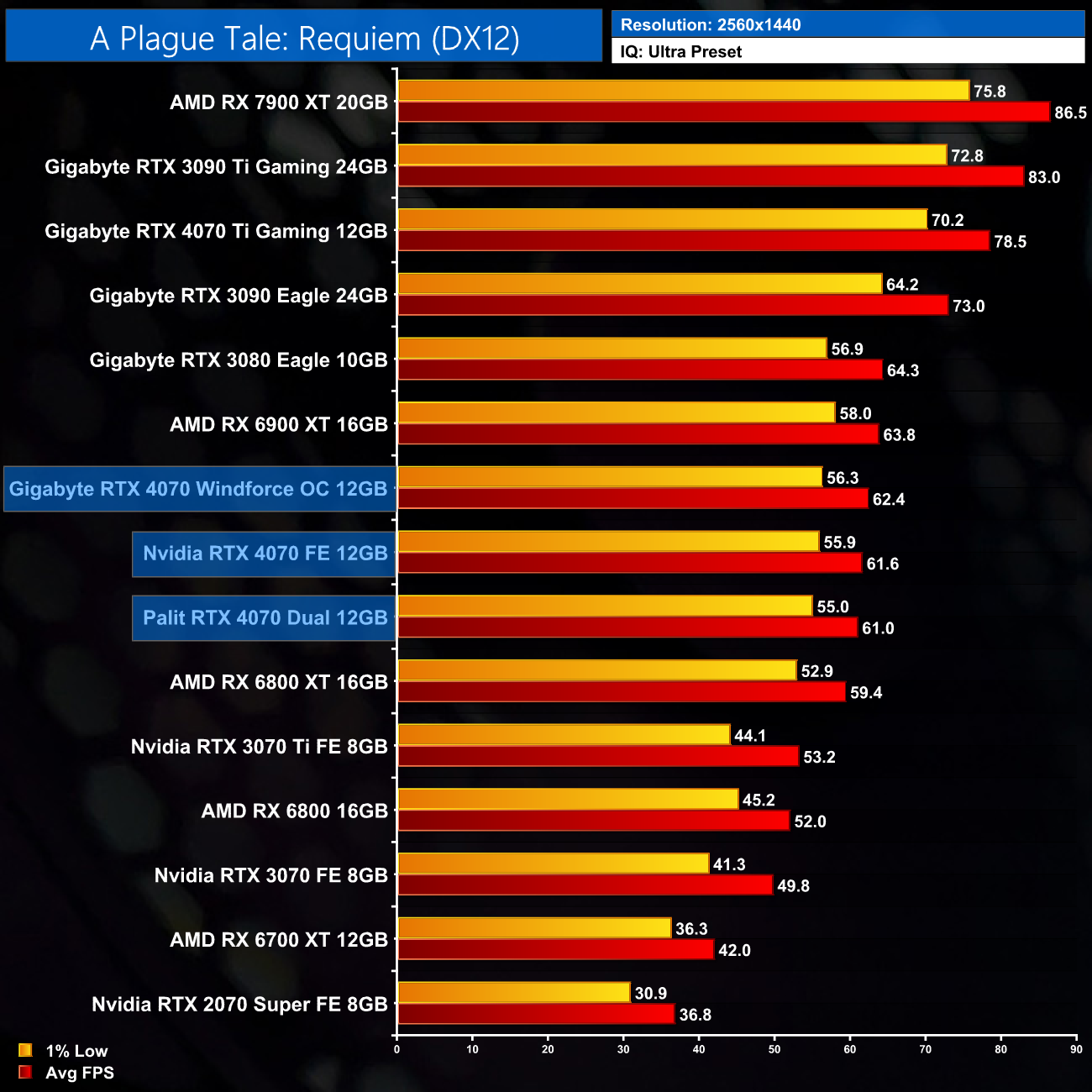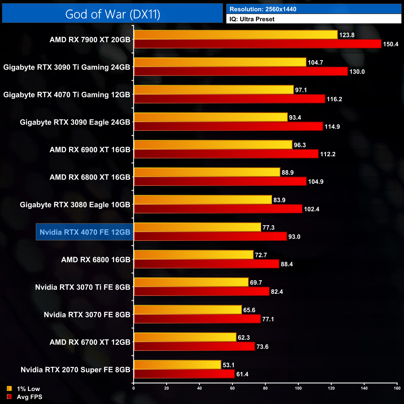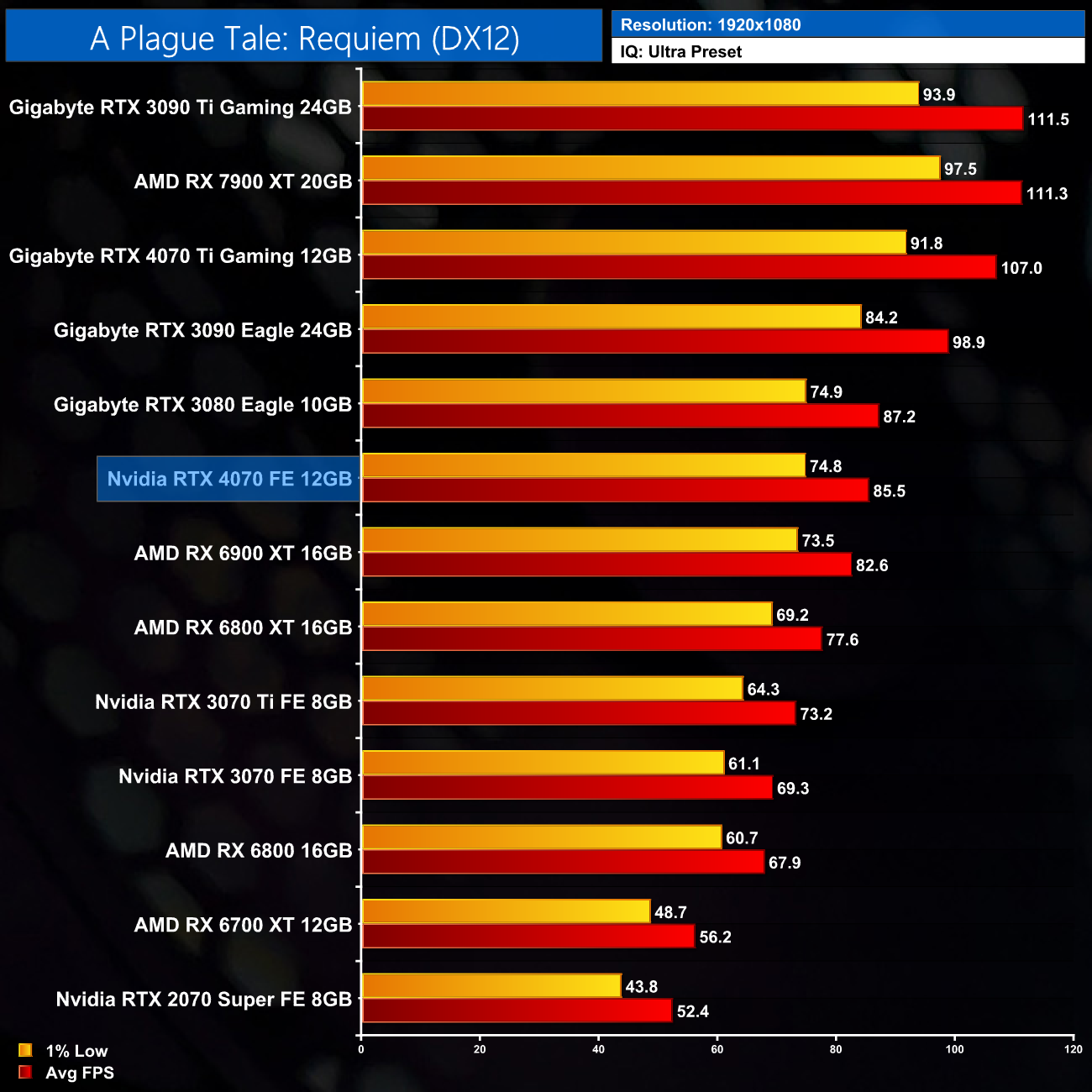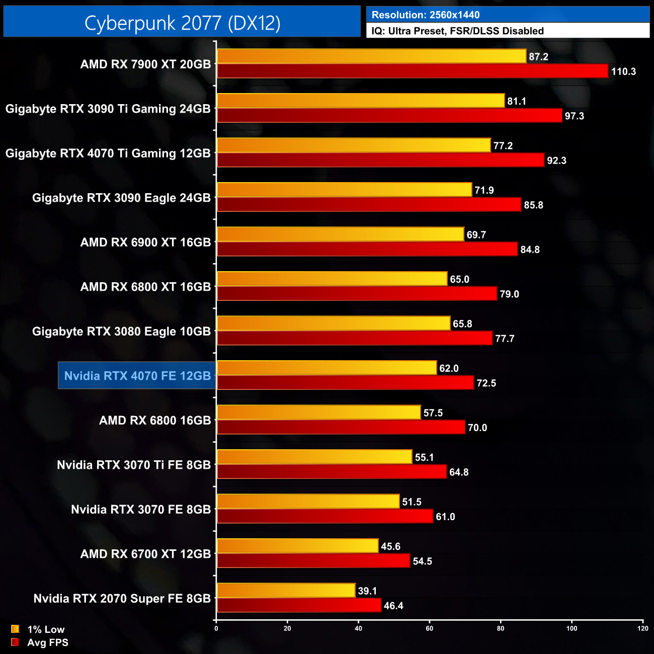Even at 1440p we see a frame rate north of 87FPS, with the 4070 now just 5% slower than the 7900 XT – although its 1% lows aren't quite so smooth. Versus the 3070 Ti, we're looking at a 22% margin of victory for the Ada GPU.