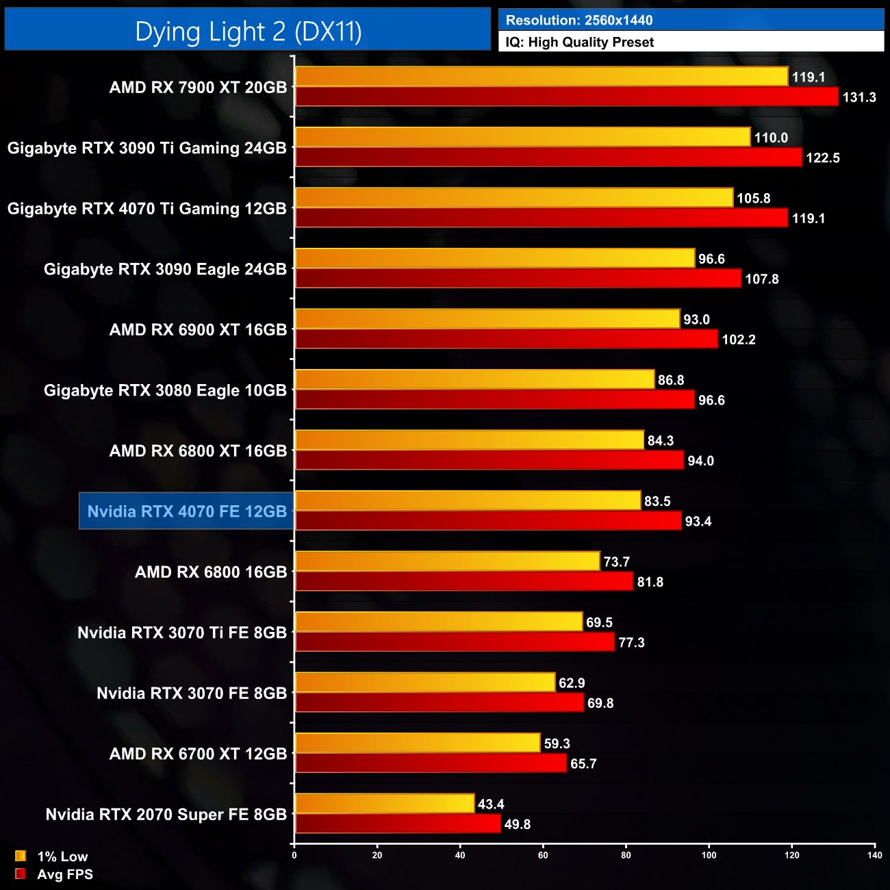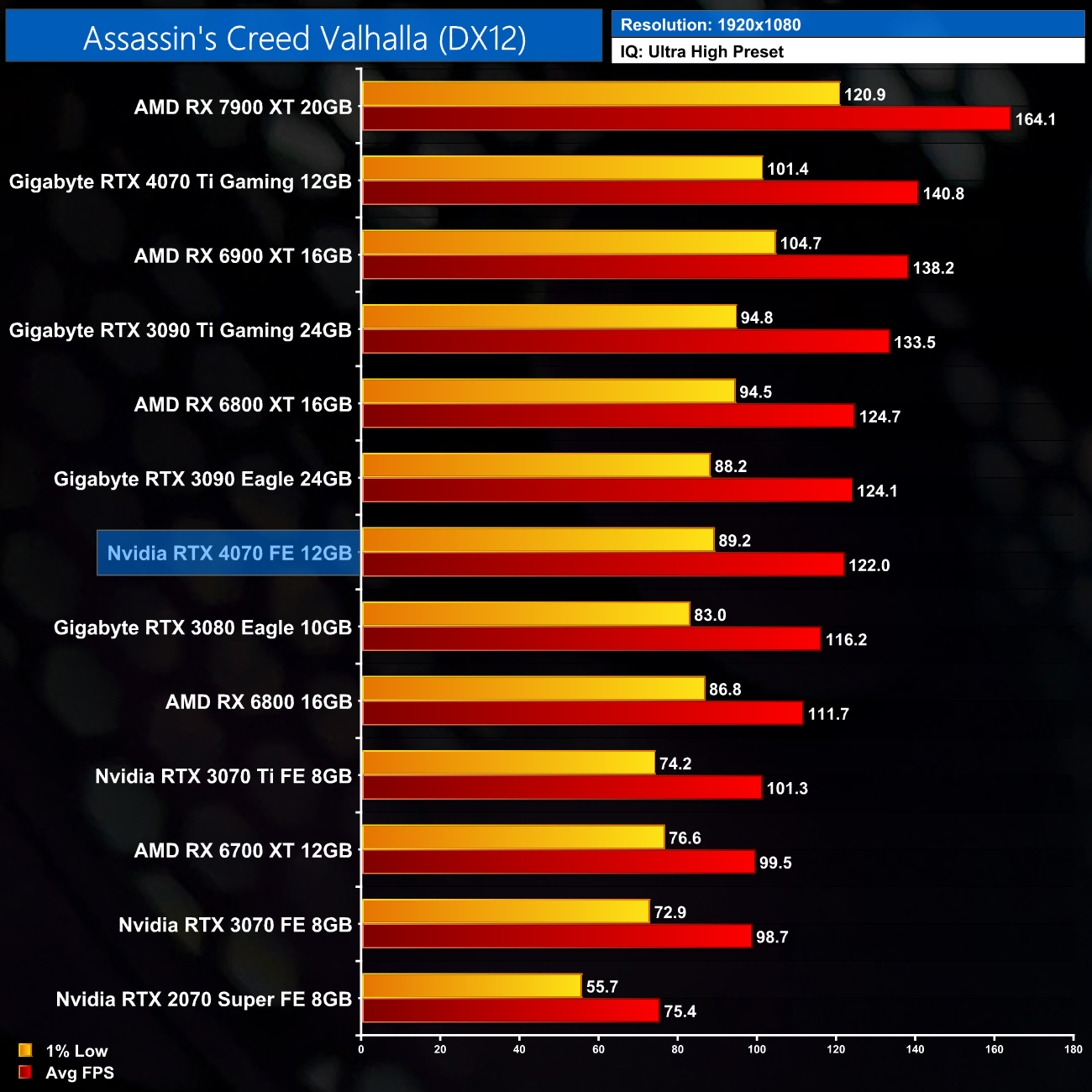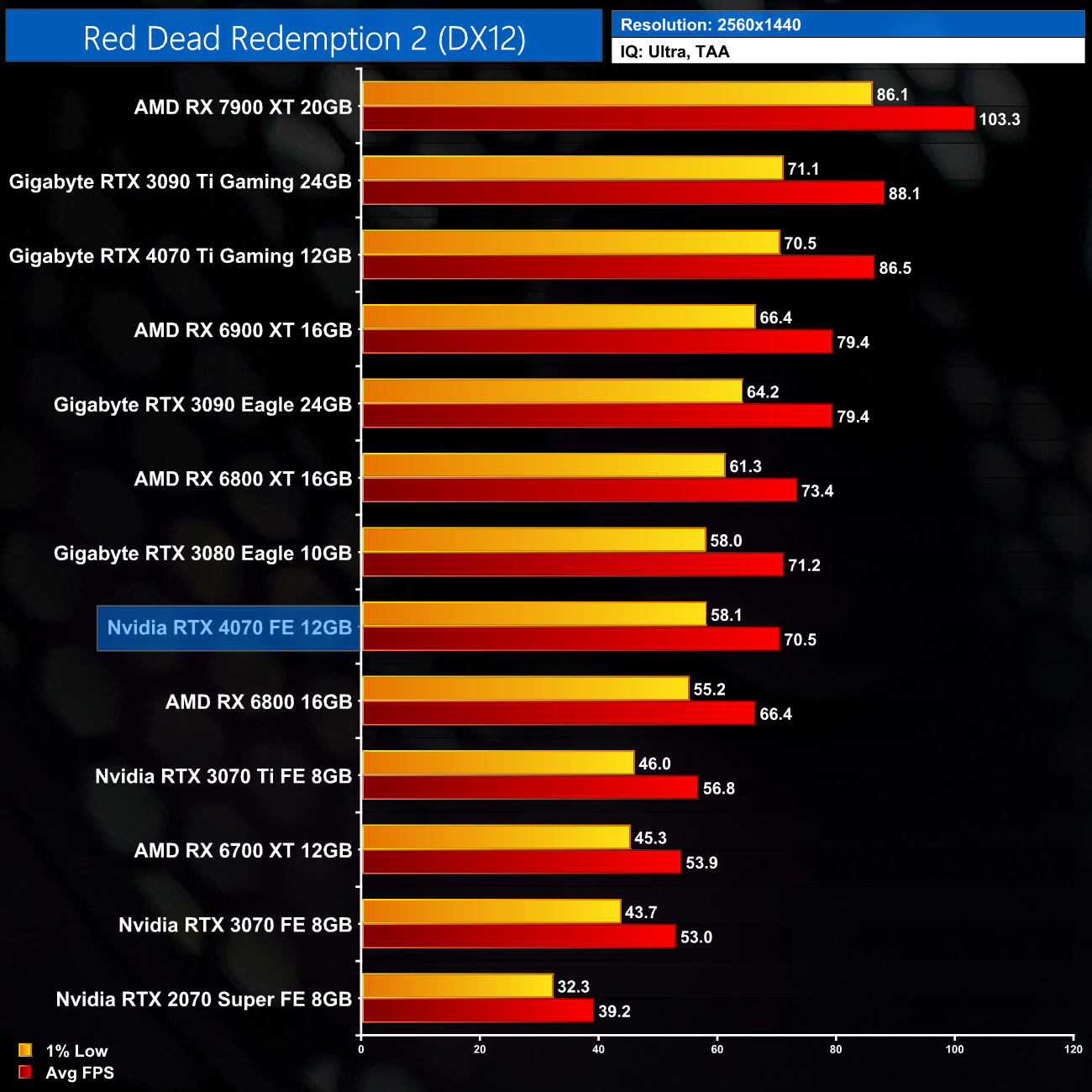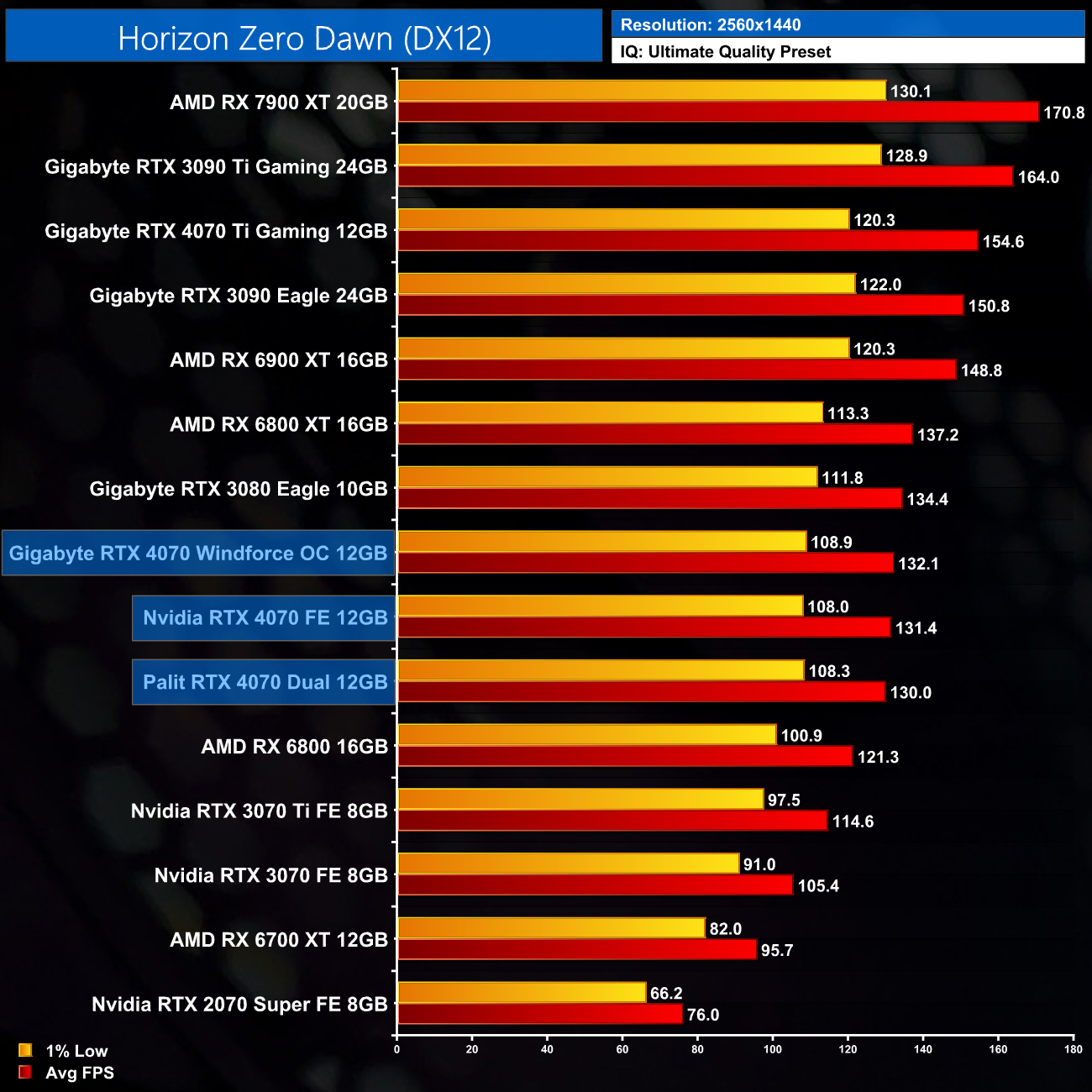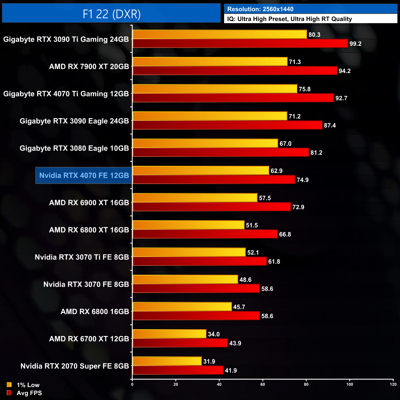 Even at 1440p we see a frame rate north of 87FPS, with the 4070 now just 5% slower than the 7900 XT – although its 1% lows aren't quite so smooth. Versus the 3070 Ti, we're looking at a 22% margin of victory for the Ada GPU.