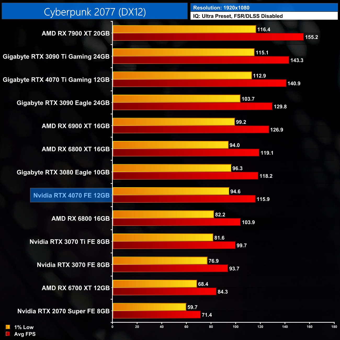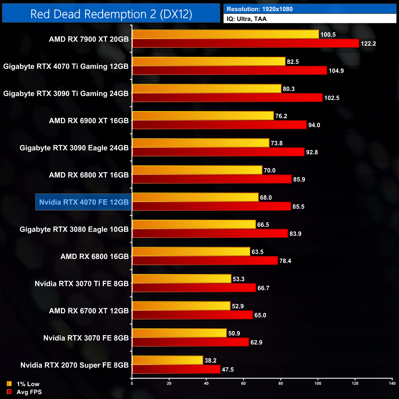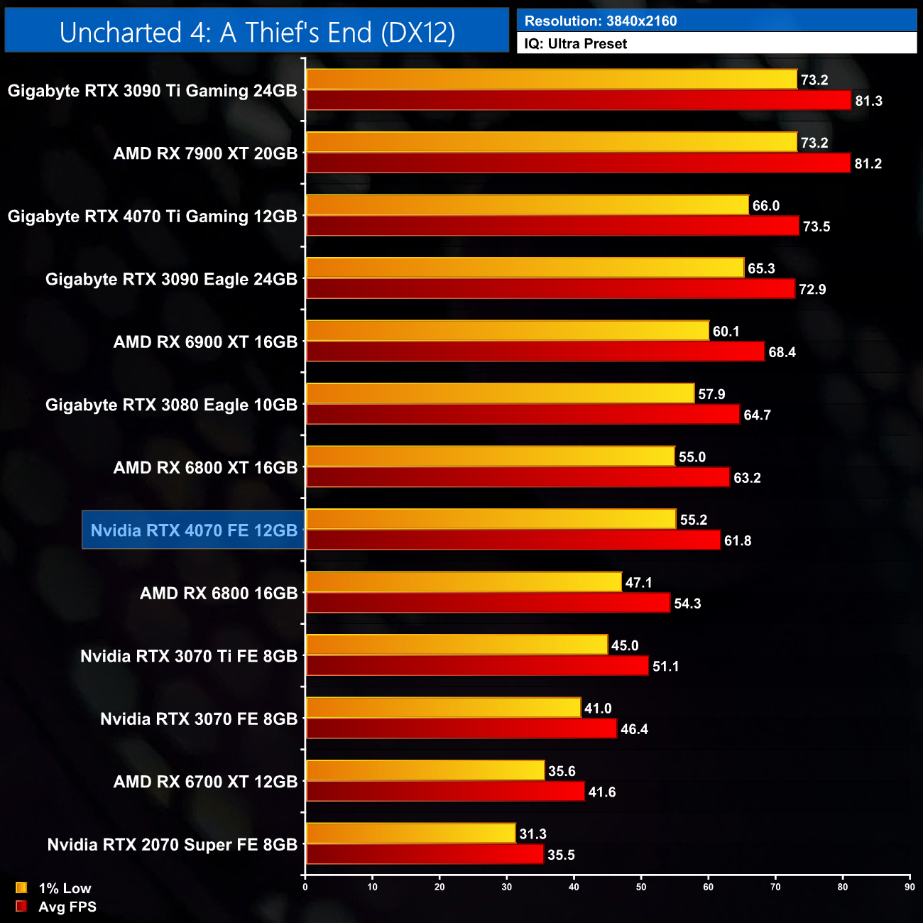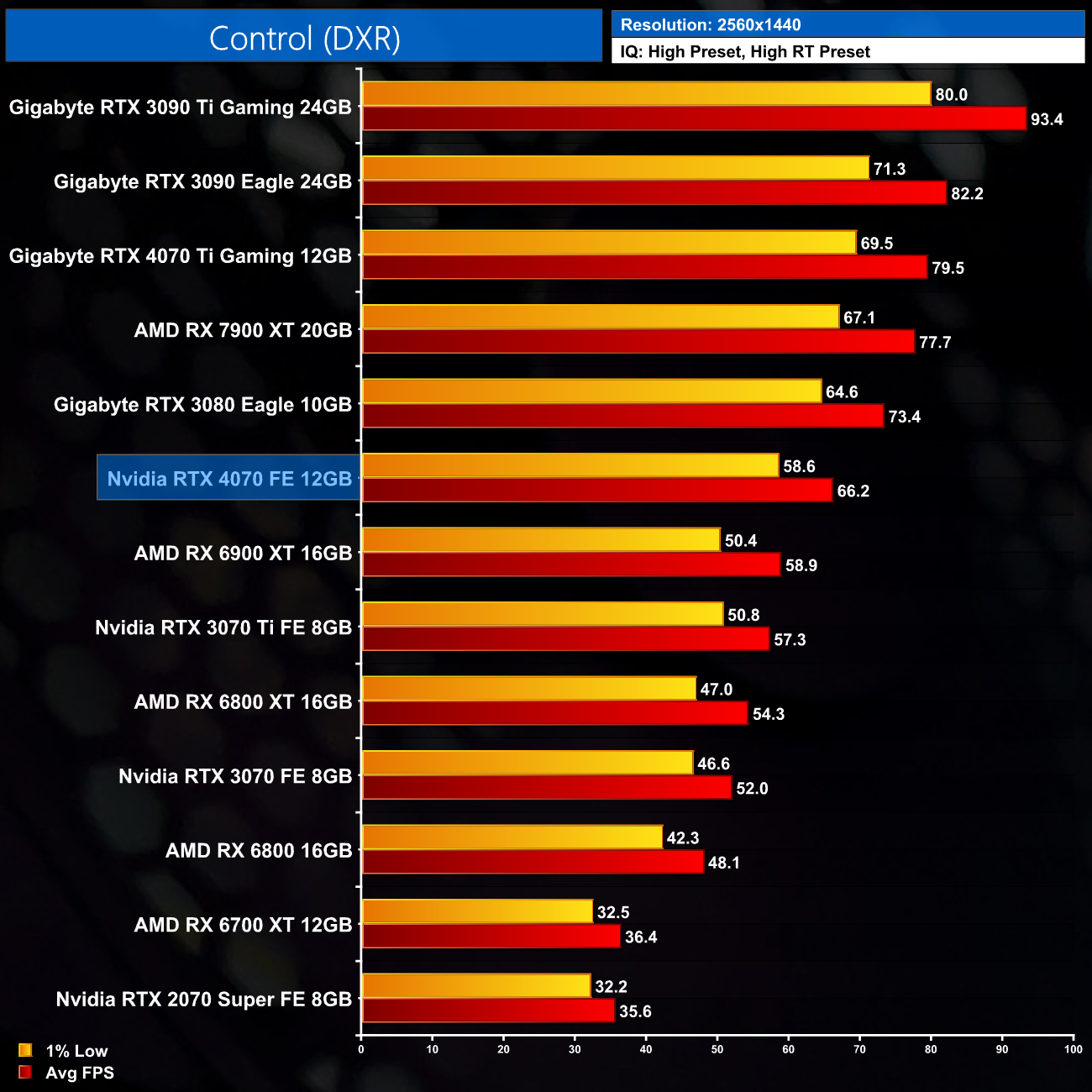 Even at 1440p we see a frame rate north of 87FPS, with the 4070 now just 5% slower than the 7900 XT – although its 1% lows aren't quite so smooth. Versus the 3070 Ti, we're looking at a 22% margin of victory for the Ada GPU.