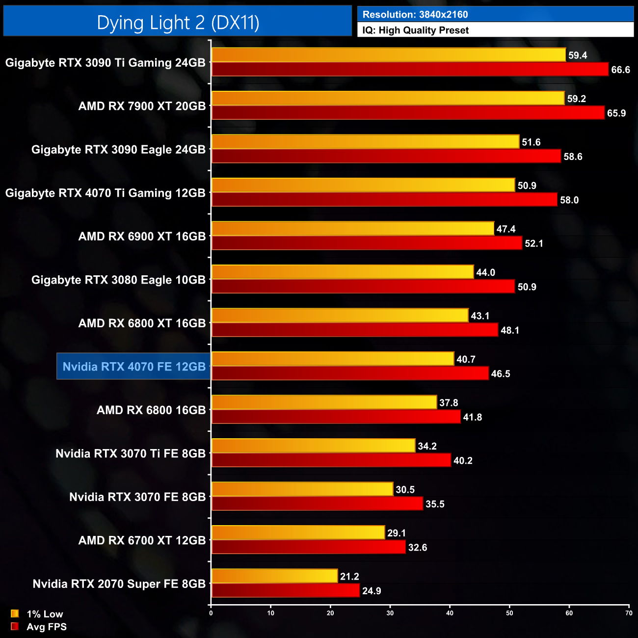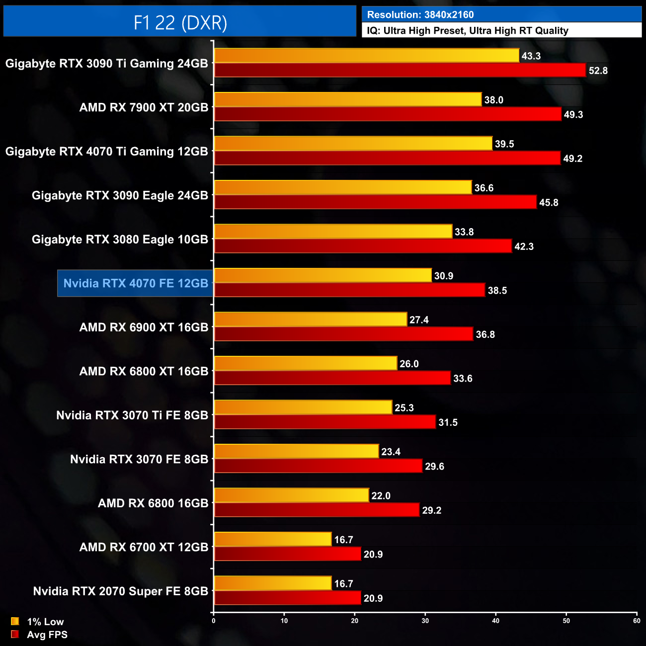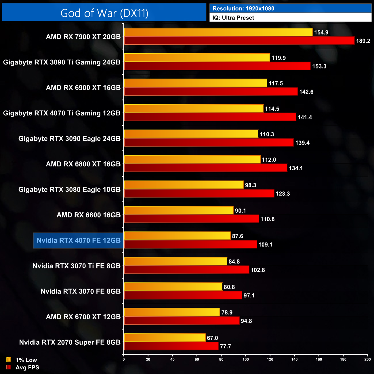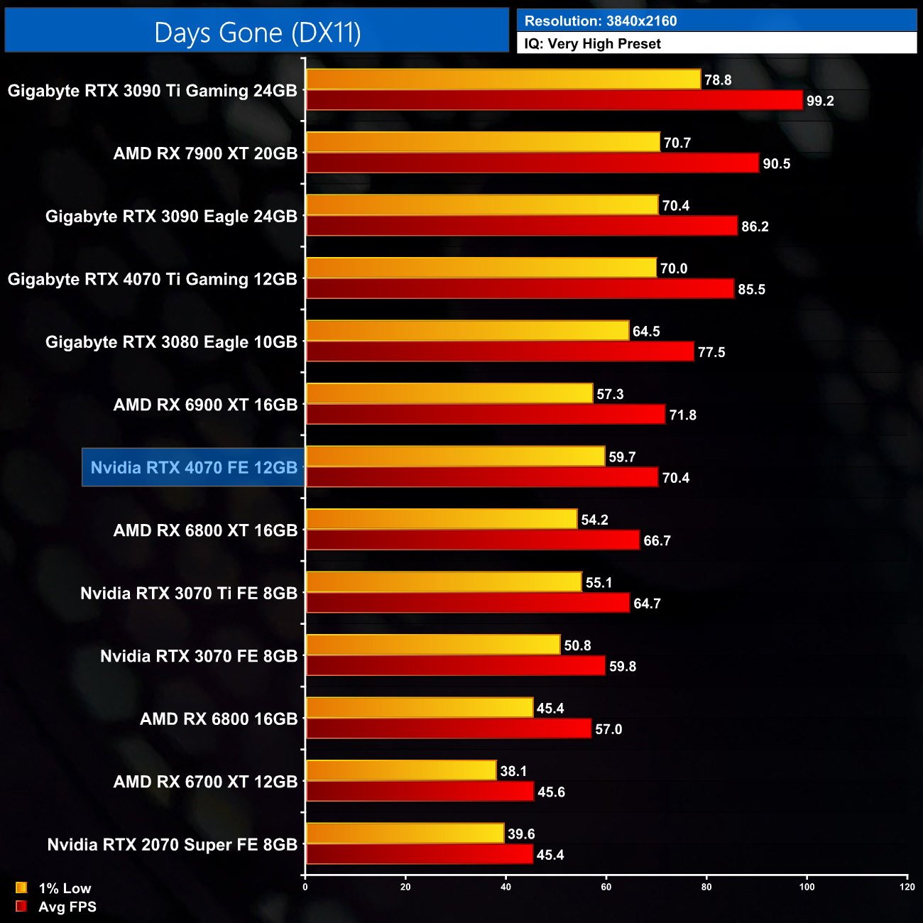 Even at 1440p we see a frame rate north of 87FPS, with the 4070 now just 5% slower than the 7900 XT – although its 1% lows aren't quite so smooth. Versus the 3070 Ti, we're looking at a 22% margin of victory for the Ada GPU.