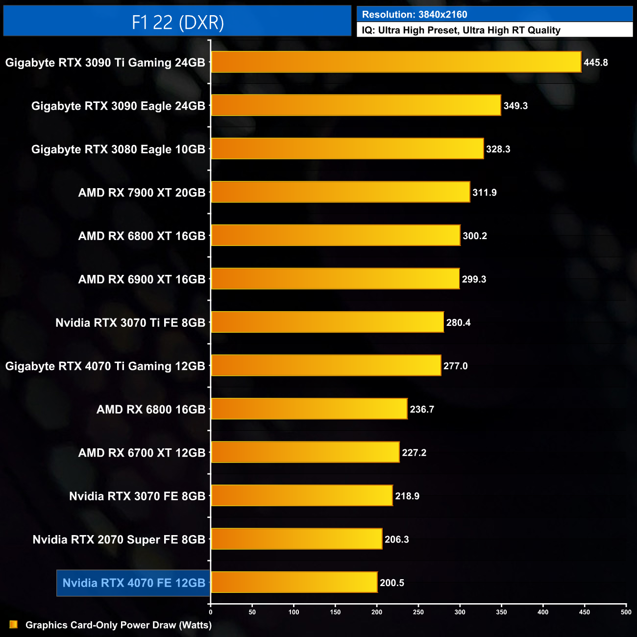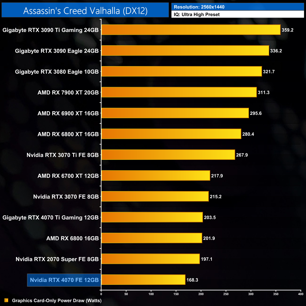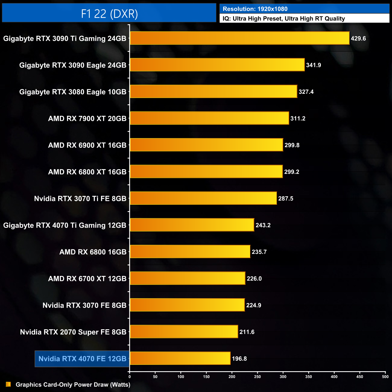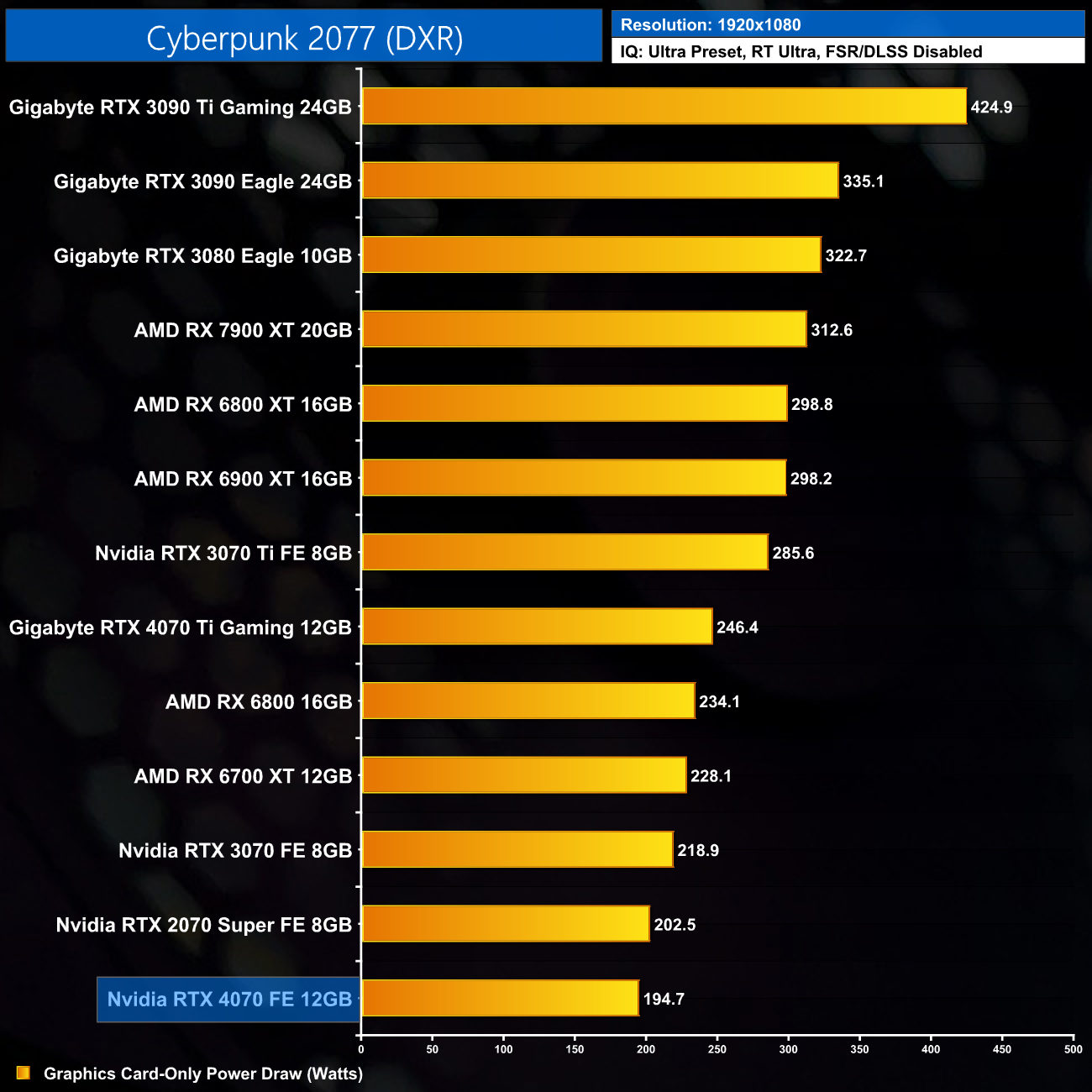 Power draw for the RTX 4070 is nice and low, averaging 186W at 1080p. That's almost a 100W reduction versus the RTX 3070 Ti, though it's still 35W lower than the RTX 3070 too.