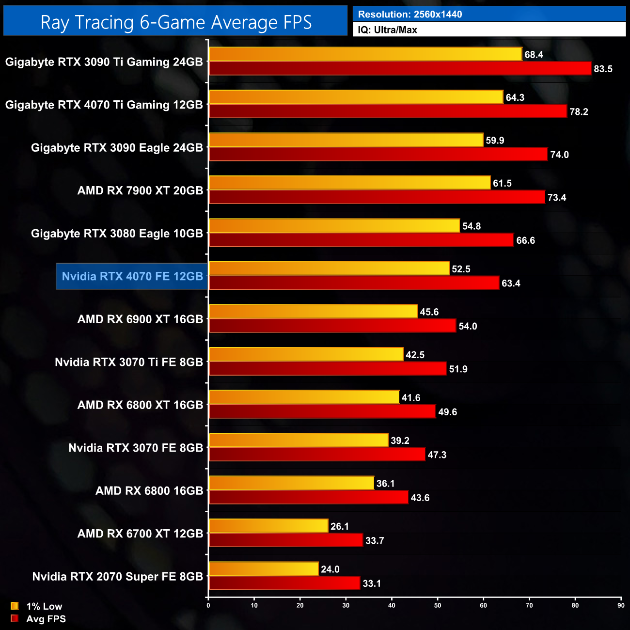 For ray tracing, the 4070 is still looking at a 60% uplift versus the RTX 3080. The increase in efficiency over the 7900 XT is lower than it was at 1080p, but is still a healthy 33% in favour of the 4070.