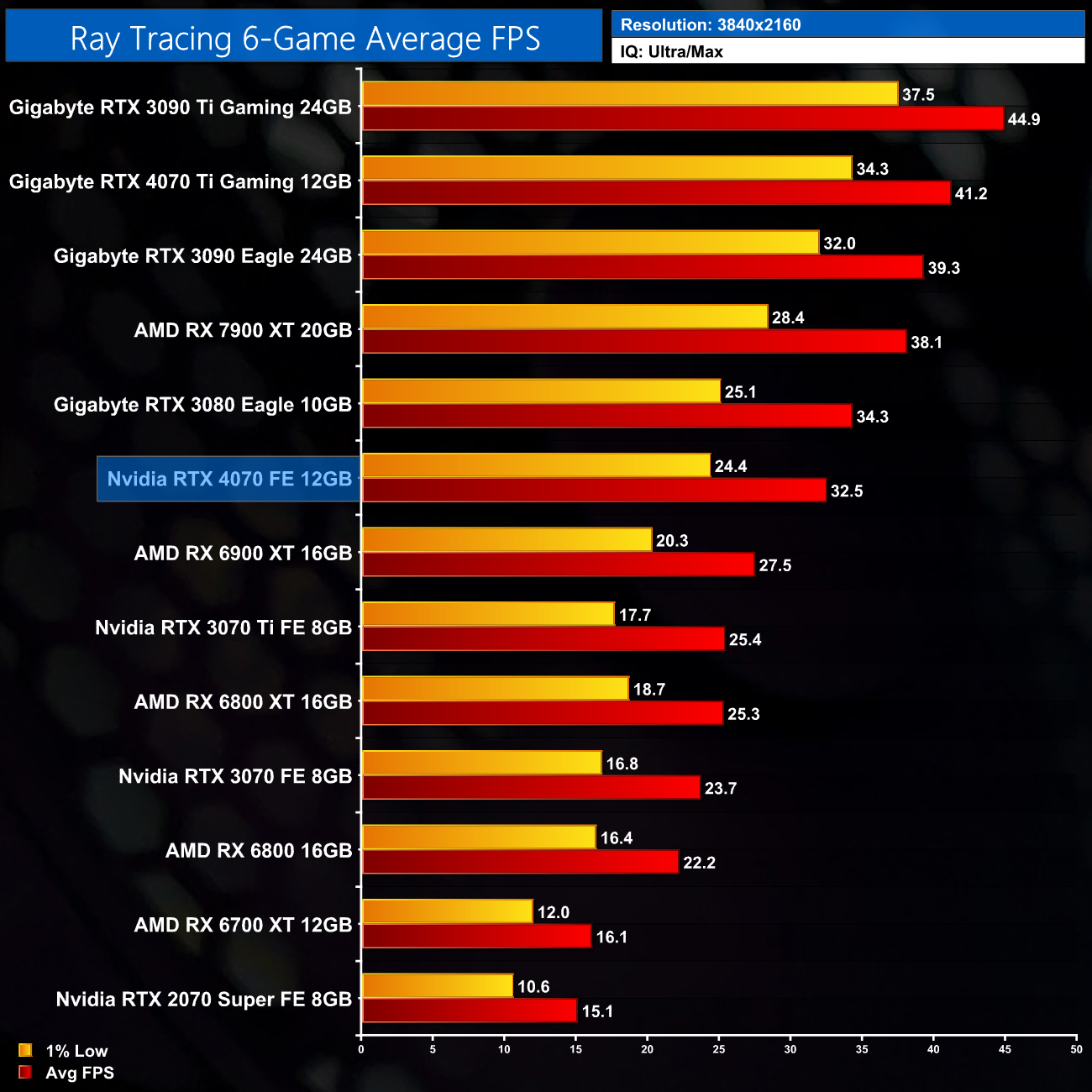 Over the 6 games with ray tracing that we benchmarked, performance of the RTX 4070 scales closely in line with the RTX 3080, with just a 3% margin between the two cards at 1080p. The 4070 is once more 21% faster than the 3070 Ti, but it's faster than the RX 6900 XT by 17%, which goes to show Nvidia still has a clear lead in terms of ray tracing performance.