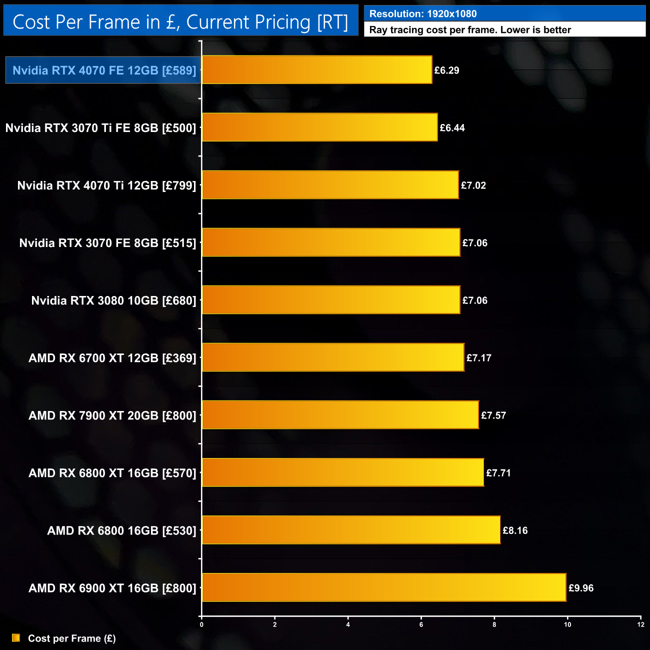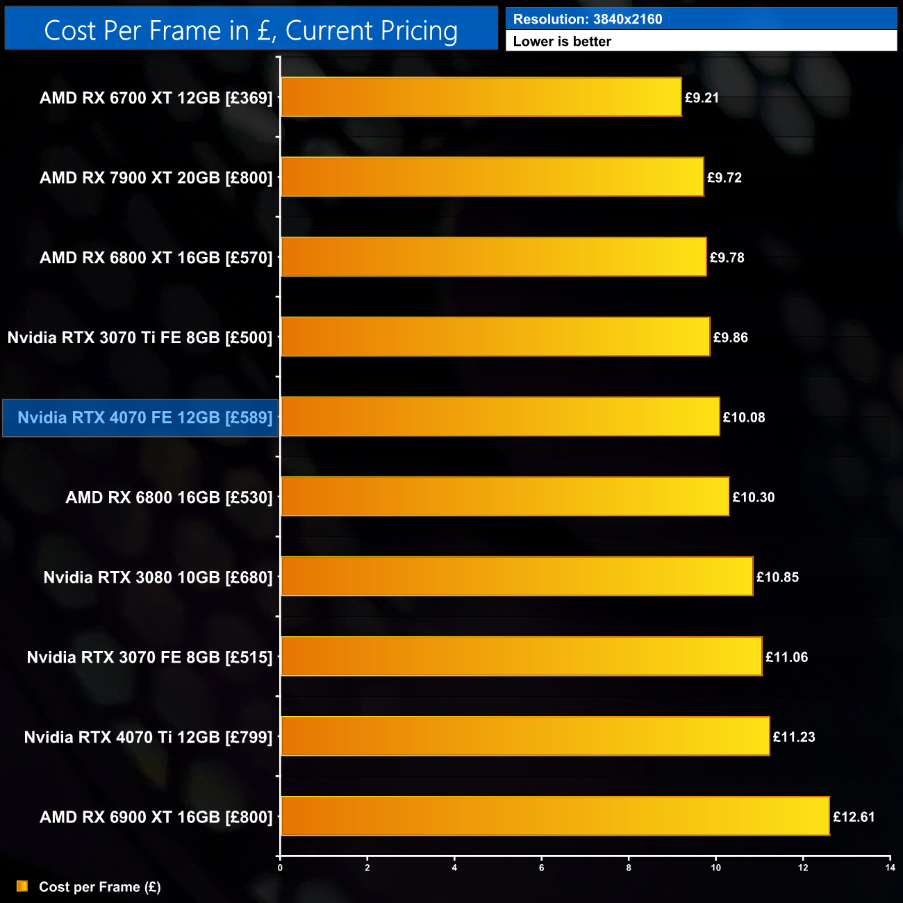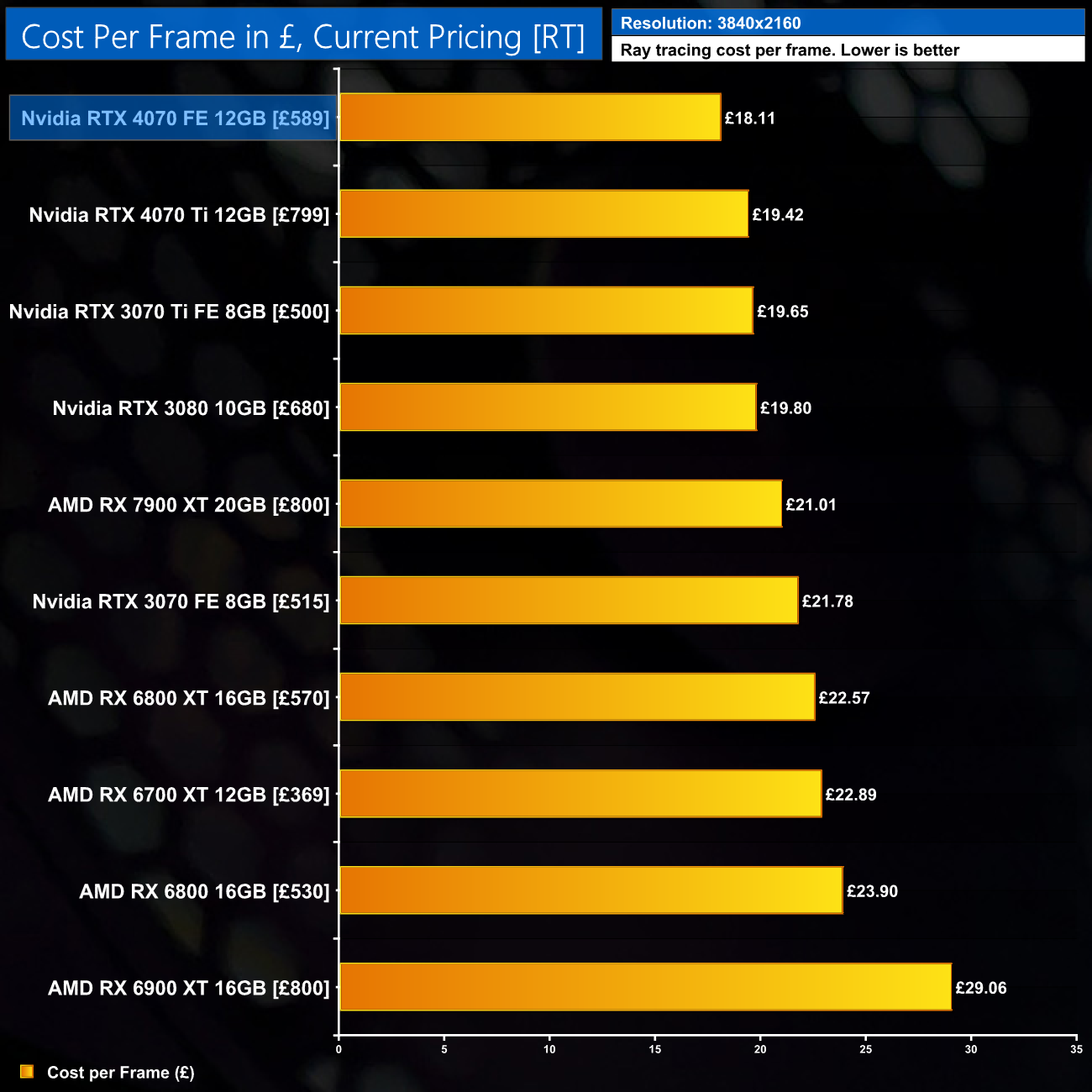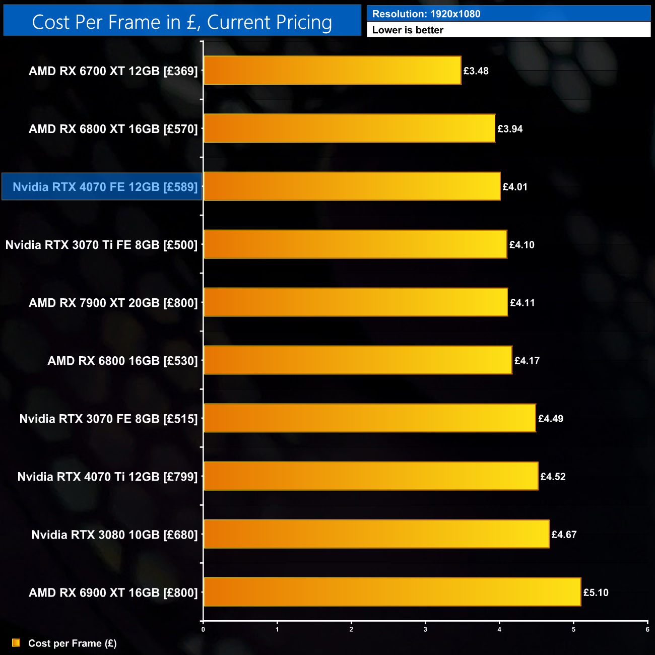 Then again, an extra 15-20% performance over the RTX 3070 Ti is hardly much to get excited about, in fact it is pretty lacklustre it has to be said. That's on top of an 11% price hike over the £529 MSRP for the 3070 Ti, negating a lot of that performance improvement. Cost per frame is just not moving forward from the previous generation, in fact several deals on RDNA 2 GPUs result in a better cost per frame for the likes of the RX 6700 XT and RX 6800 XT than what we get from the RTX 4070, though admittedly RDNA 2's ray tracing performance is a fair bit behind the 4070.
