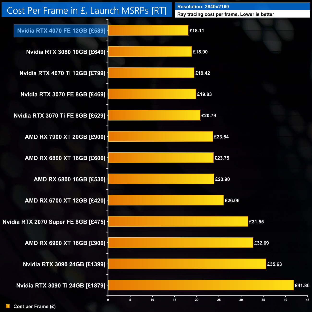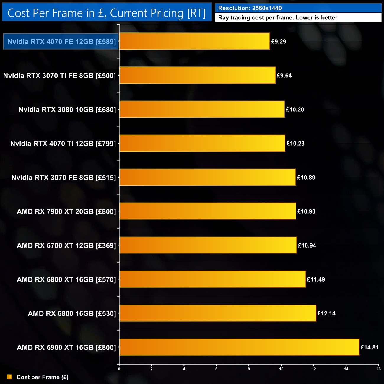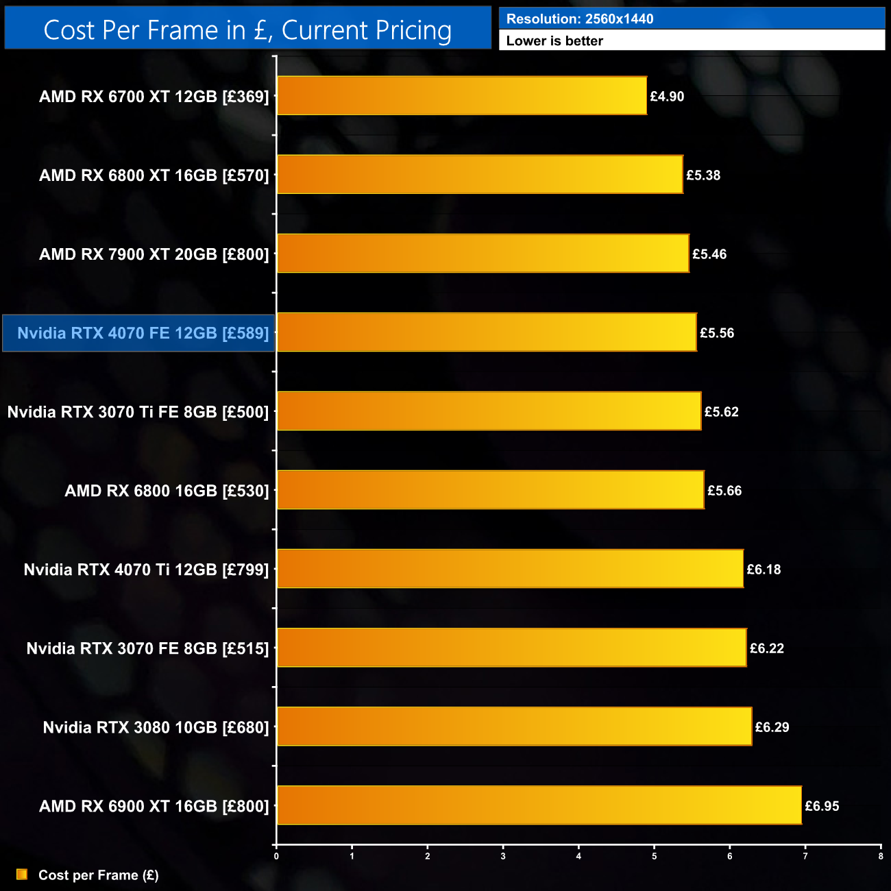 Then again, an extra 15-20% performance over the RTX 3070 Ti is hardly much to get excited about, in fact it is pretty lacklustre it has to be said. That's on top of an 11% price hike over the £529 MSRP for the 3070 Ti, negating a lot of that performance improvement. Cost per frame is just not moving forward from the previous generation, in fact several deals on RDNA 2 GPUs result in a better cost per frame for the likes of the RX 6700 XT and RX 6800 XT than what we get from the RTX 4070, though admittedly RDNA 2's ray tracing performance is a fair bit behind the 4070.