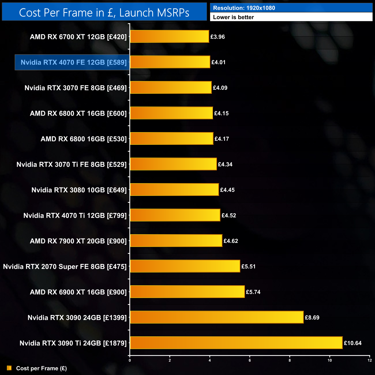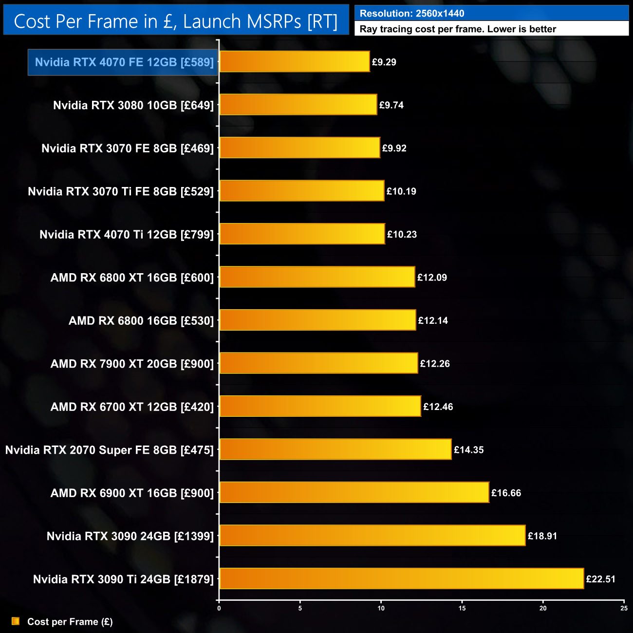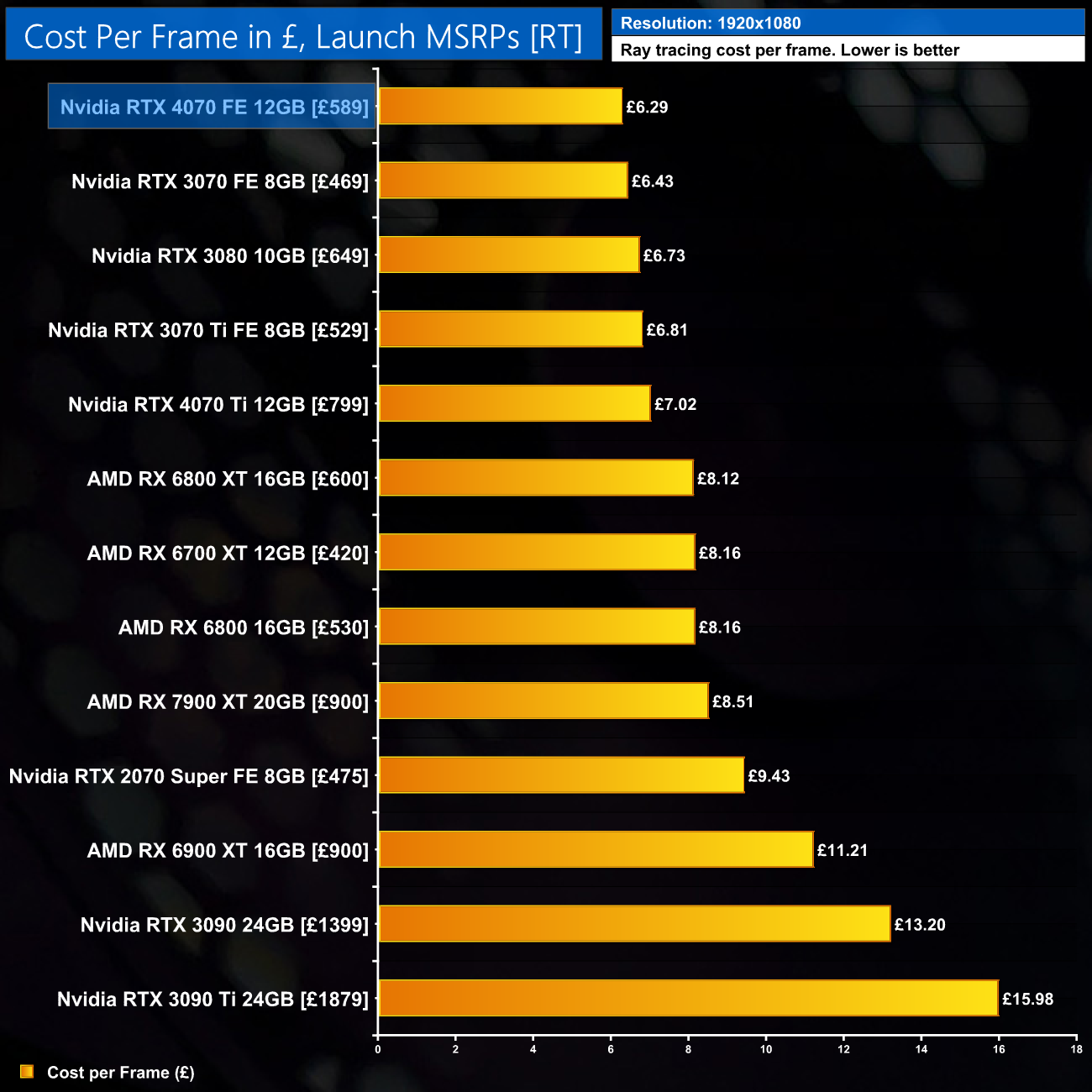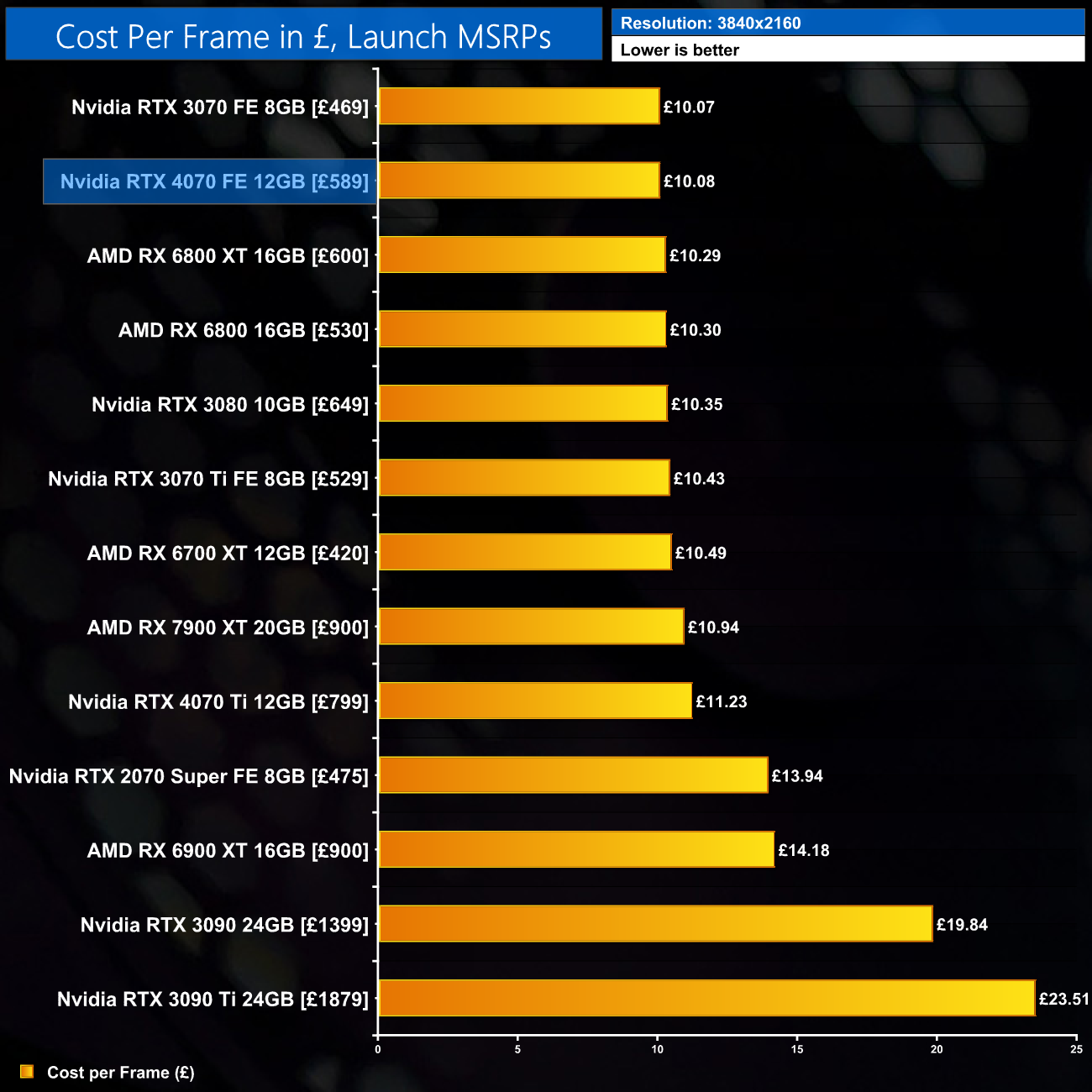 Then again, an extra 15-20% performance over the RTX 3070 Ti is hardly much to get excited about, in fact it is pretty lacklustre it has to be said. That's on top of an 11% price hike over the £529 MSRP for the 3070 Ti, negating a lot of that performance improvement. Cost per frame is just not moving forward from the previous generation, in fact several deals on RDNA 2 GPUs result in a better cost per frame for the likes of the RX 6700 XT and RX 6800 XT than what we get from the RTX 4070, though admittedly RDNA 2's ray tracing performance is a fair bit behind the 4070.