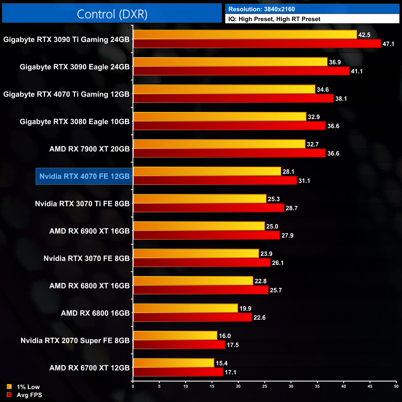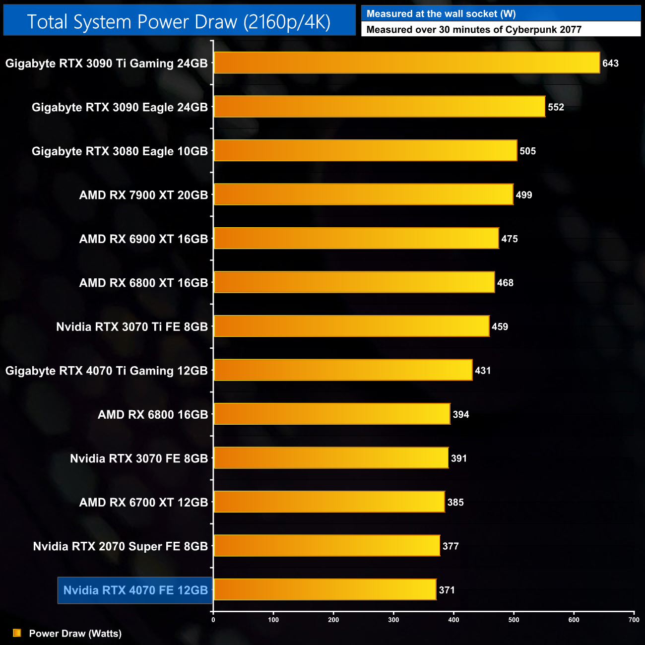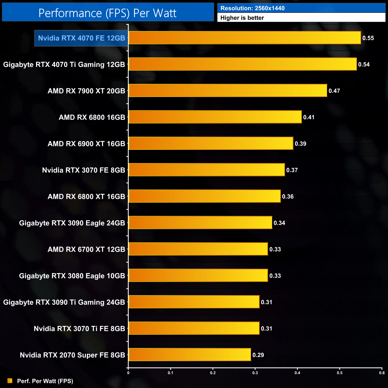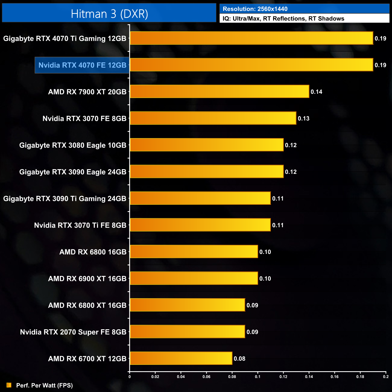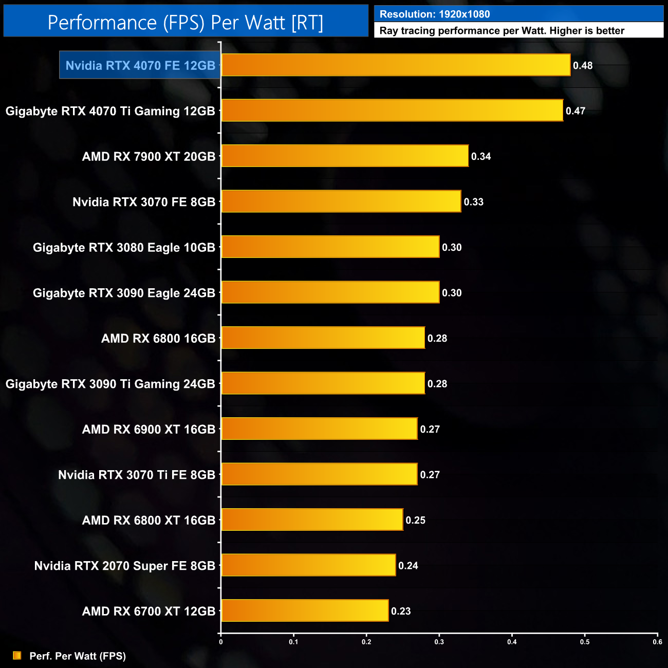 Interestingly, when looking at performance per Watt for our ray traced games, the gain for the 4070 over the RTX 3080 is slightly smaller, with a 60% increase in efficiency on show. Compared to the RX 7900 XT though, the RTX 4070 offerings 41% more performance per Watt for ray traced gaming.
