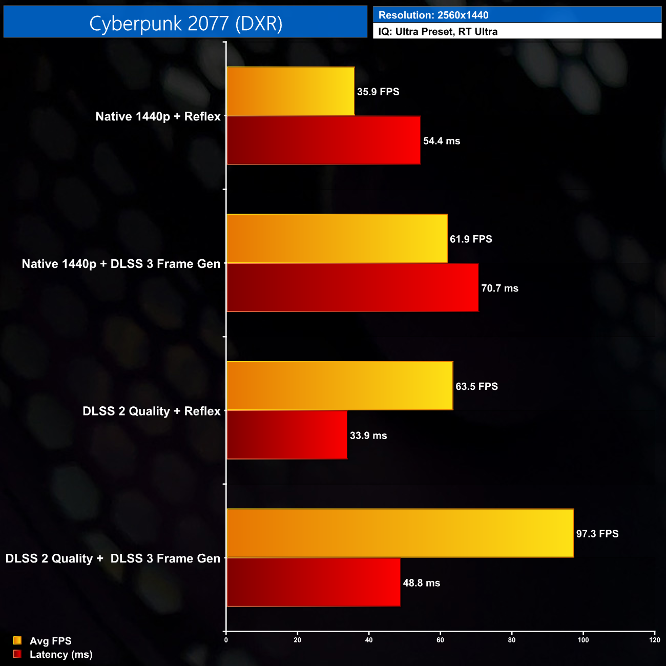 Engaging DLSS 3 Frame Generation at 1440p brings an FPS boost similar to engaging DLSS 2 Quality, but of course you can enable both features at the same time – almost tripling FPS versus native resolution. Of course, latency is part of the equation, with just an 11% reduction in latency when using both DLSS 2 + DLSS 3 Frame Generation compared to native 1440p with Reflex enabled, despite the 270% increase to frame rates.