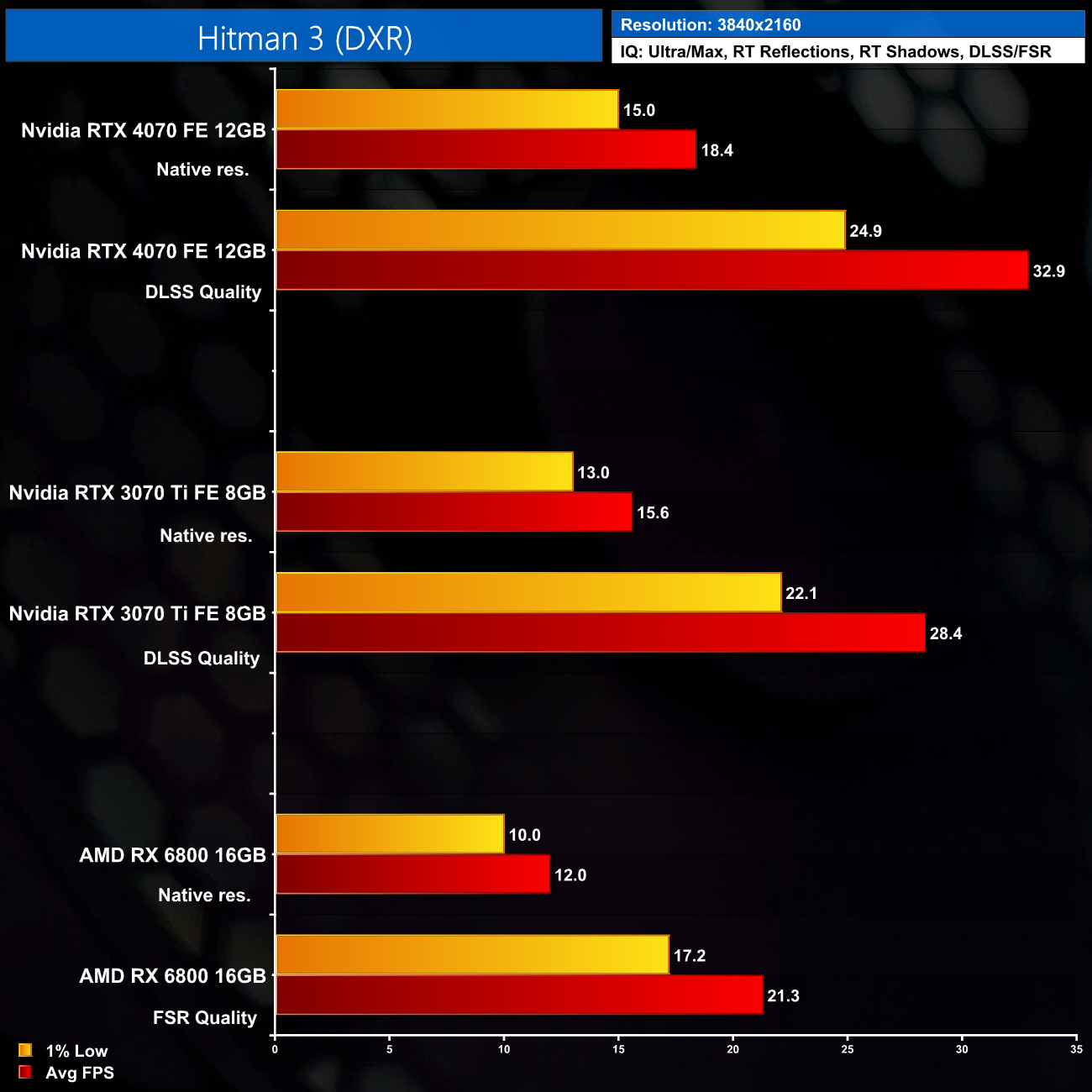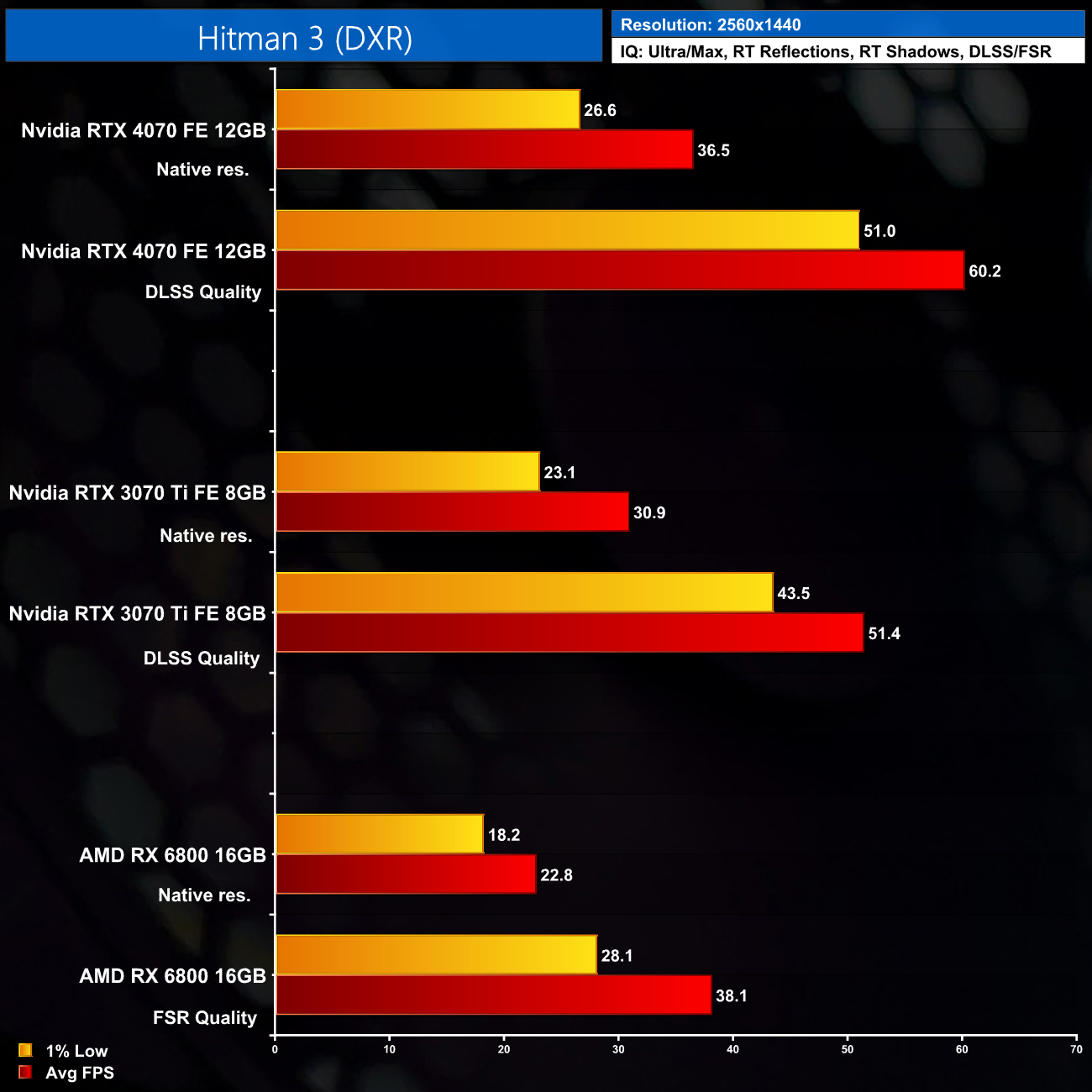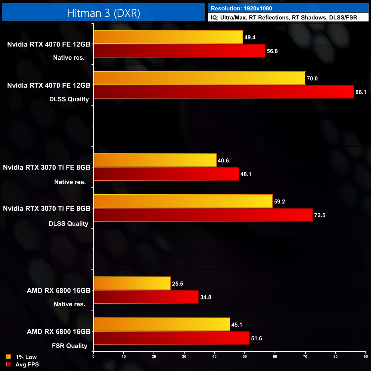 Hitman 3 is another title tested with DLSS 2 Quality mode. At 1080p it offers a 52% performance uplift for the RTX 4070, enabling an average frame rate of 86FPS with ray tracing enabled. That increases at 1440p, with DLSS 2 Quality now resulting in a 65% frame rate boost. For comparison, the 3070 Ti at 1440p sees a 66% boost from DLSS, so the 4070 is still 17% faster when both GPUs use DLSS 2.