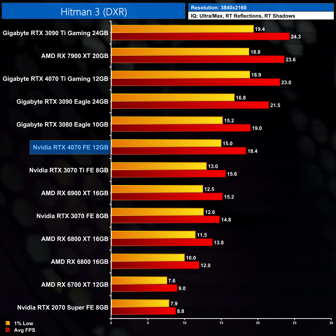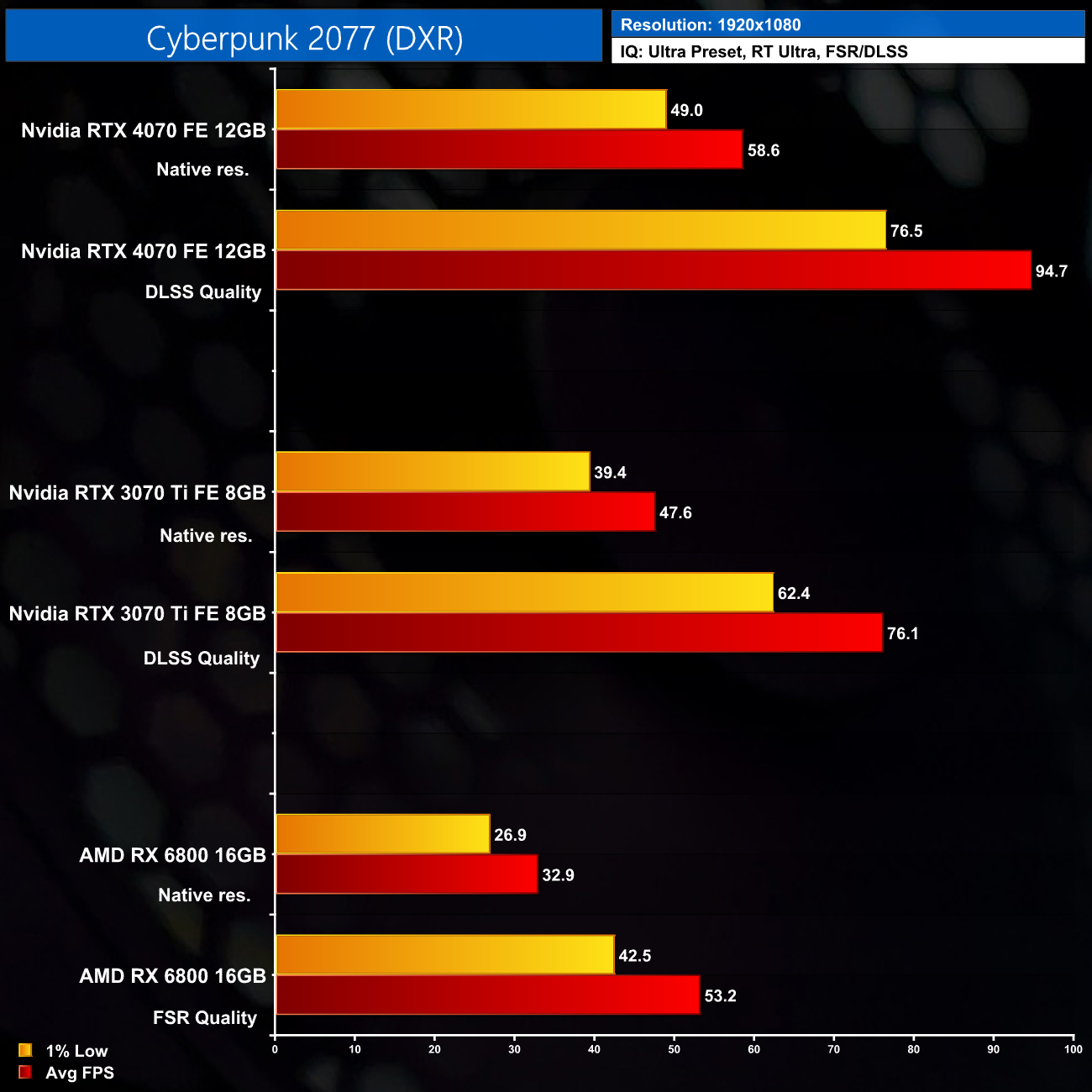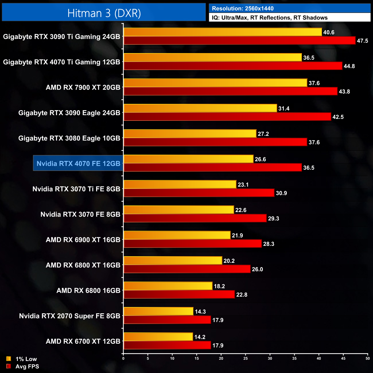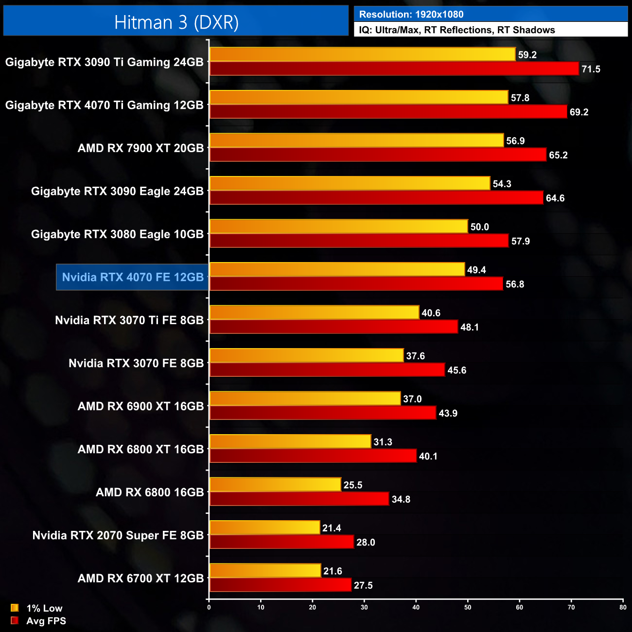 Hitman 3 is another title tested with DLSS 2 Quality mode. At 1080p it offers a 52% performance uplift for the RTX 4070, enabling an average frame rate of 86FPS with ray tracing enabled. That increases at 1440p, with DLSS 2 Quality now resulting in a 65% frame rate boost. For comparison, the 3070 Ti at 1440p sees a 66% boost from DLSS, so the 4070 is still 17% faster when both GPUs use DLSS 2.