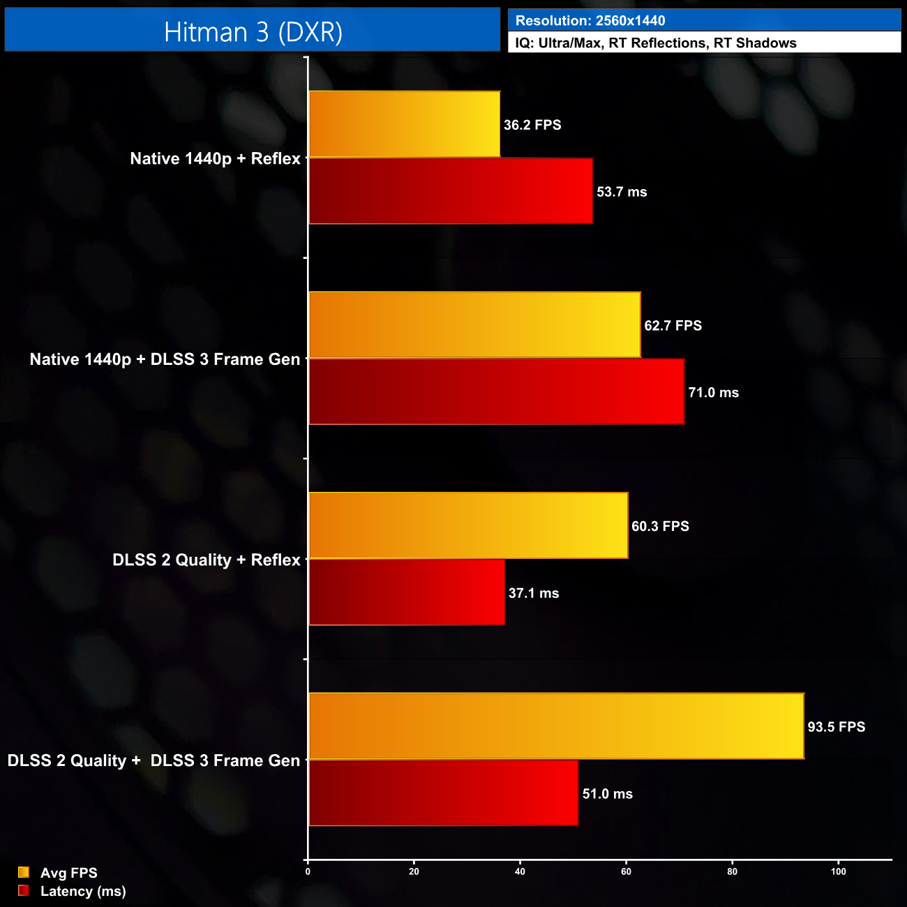 We also toggled on DLSS 3 Frame generation in Hitman 3, with results similar to Cyberpunk 2077. With both DLSS 2 and DLSS 3 Frame Gen enabled, frame rates hit 93.5FPS, compared to 36FPS at native resolution.
