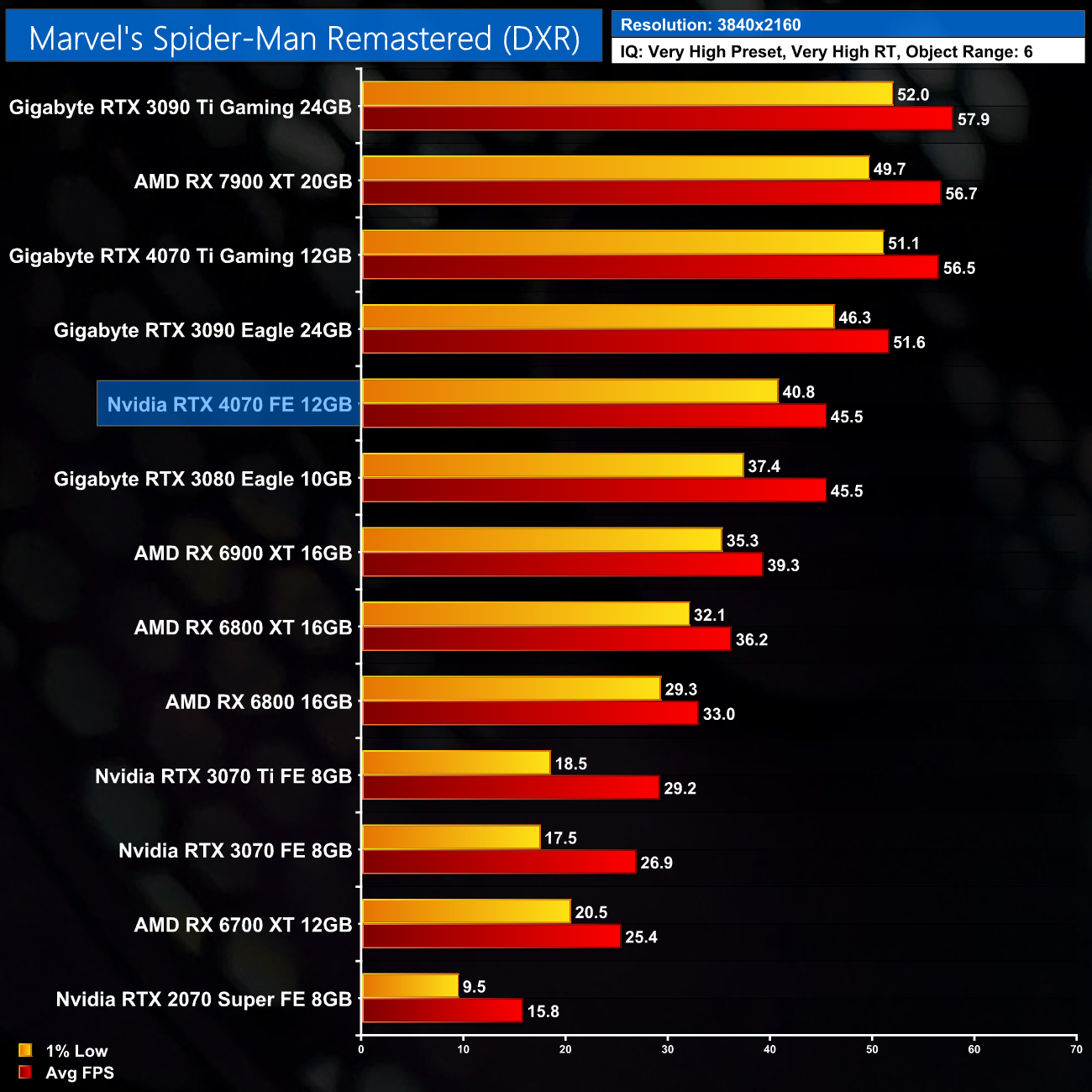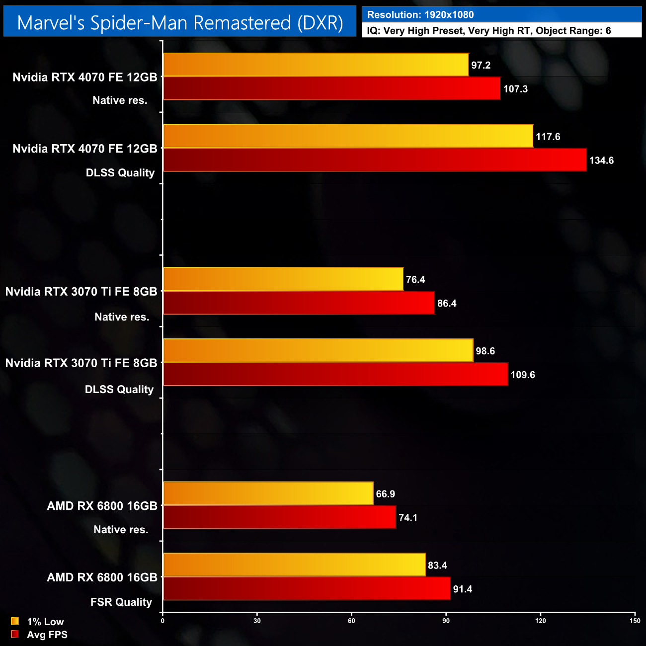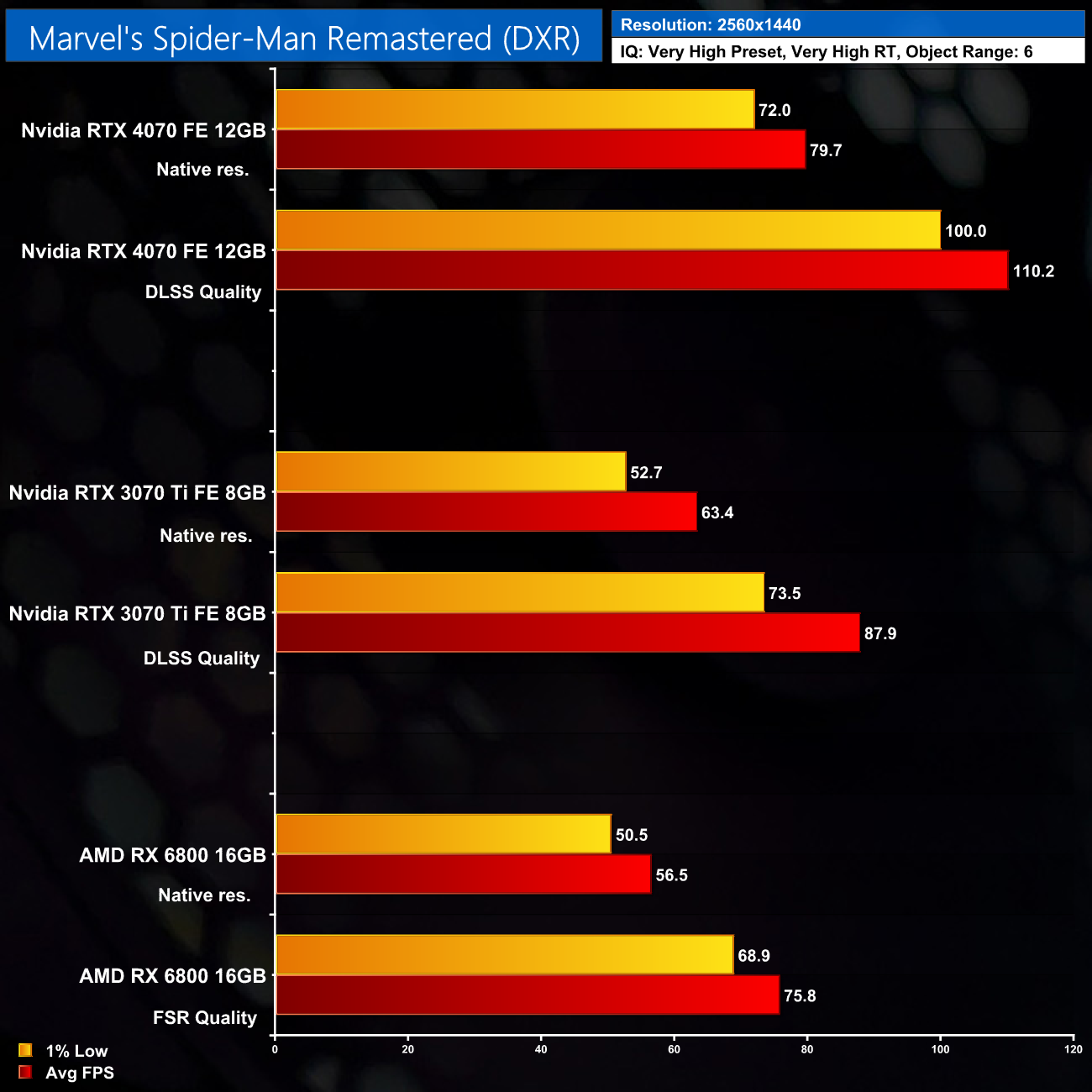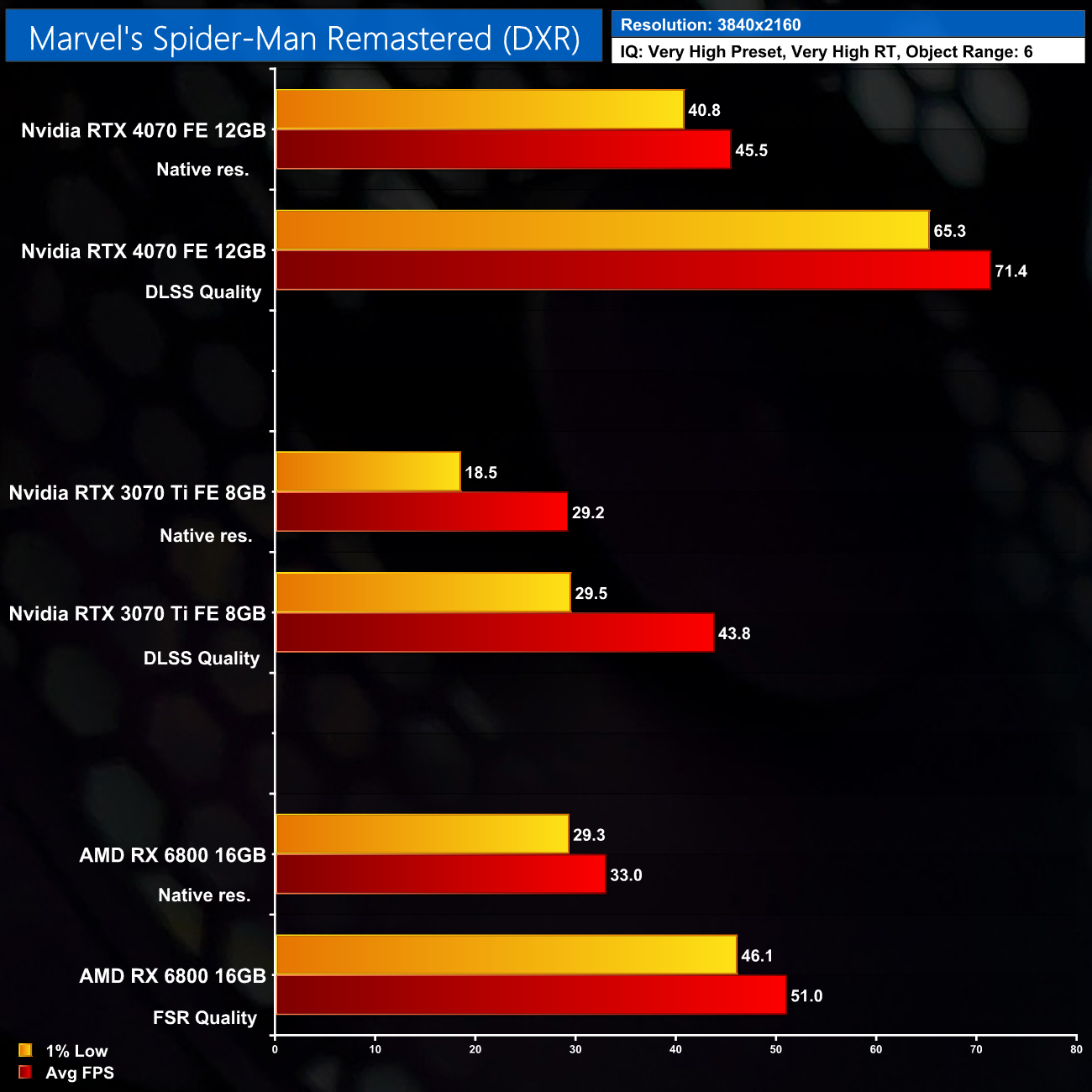 DLSS 2 Quality has a slightly tougher time in Spider-Man, as frame rates are already higher, but here it's a great tool to turn the 4070 into a 4K card – it averages 45.5FPS at native resolution, but manages to hit 71FPS with DLSS 2 Quality enabled, a boost of 57%. Even with DLSS 2 Quality, the 3070 Ti is running into framebuffer issues at the same resolution, with the 1% lows still hovering below 30FPS, despite a 50% increase to the average frame rate.