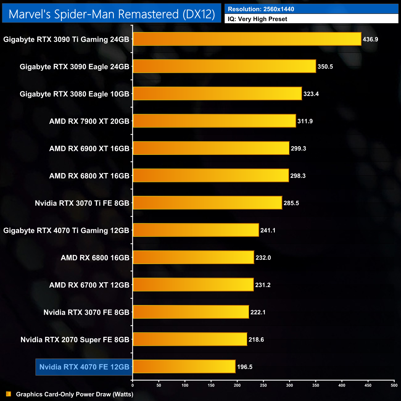 It's not much different at 1440p with ray tracing engaged either, with the 4070 now averaging 197.6W.