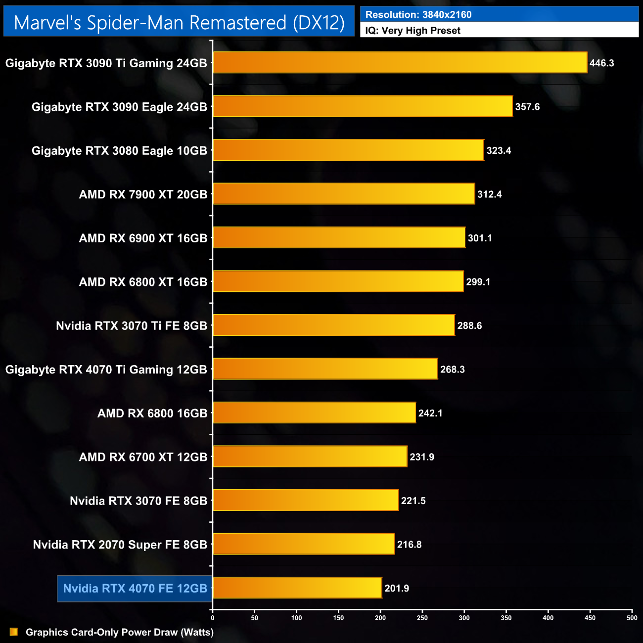 Although not an ideal 4K gaming GPU, the 4070 pulls 200W almost exactly at this resolution, averaging 199.8W to be exact.