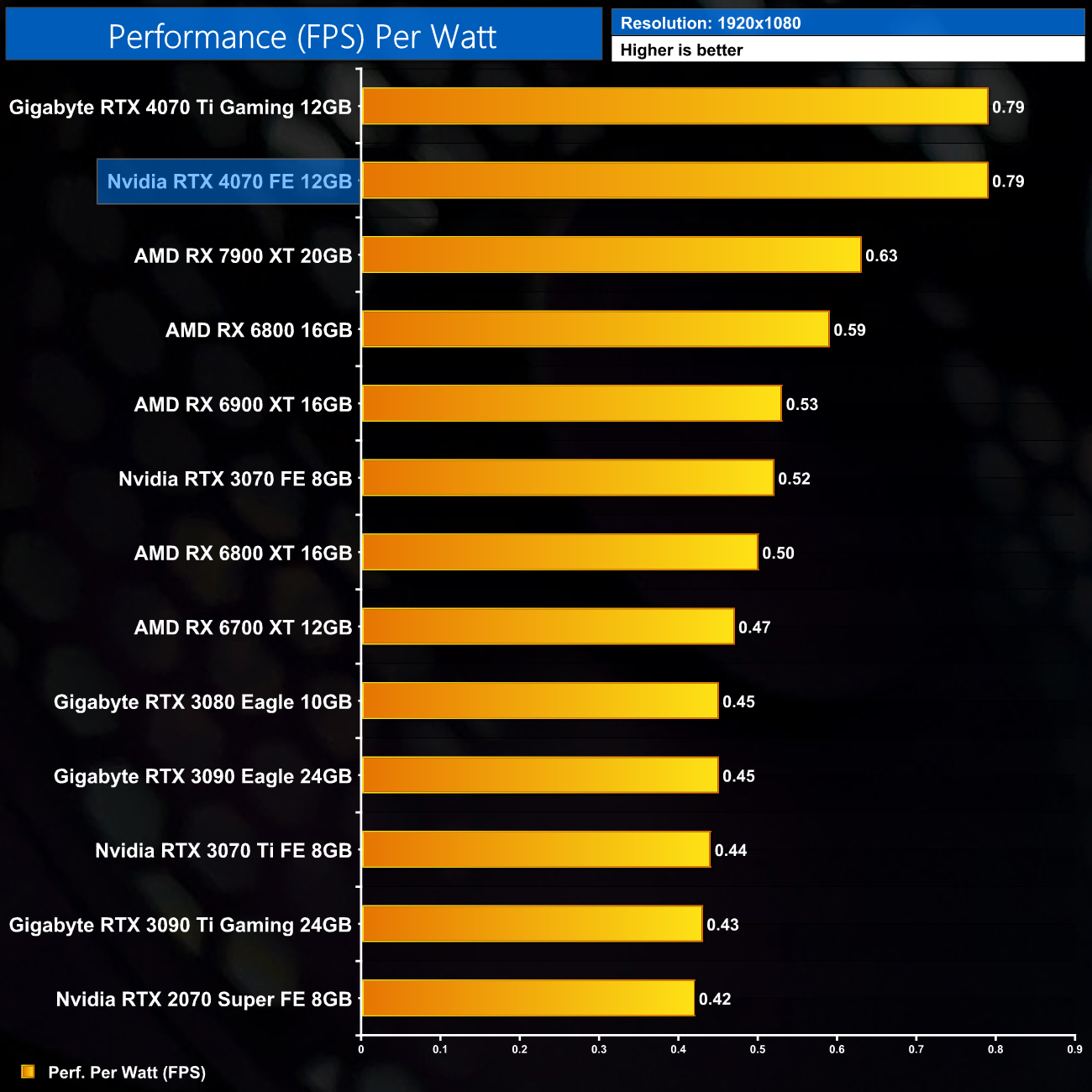 Performance per Watt is much improved for the 4070 versus the 30-series. Despite offering very similar performance to the RTX 3080, the 4070 can do so at significantly less power, resulting in a 76% increase to performance per Watt for this Ada GPU. It's dead level with the RTX 4070 Ti in this regard.