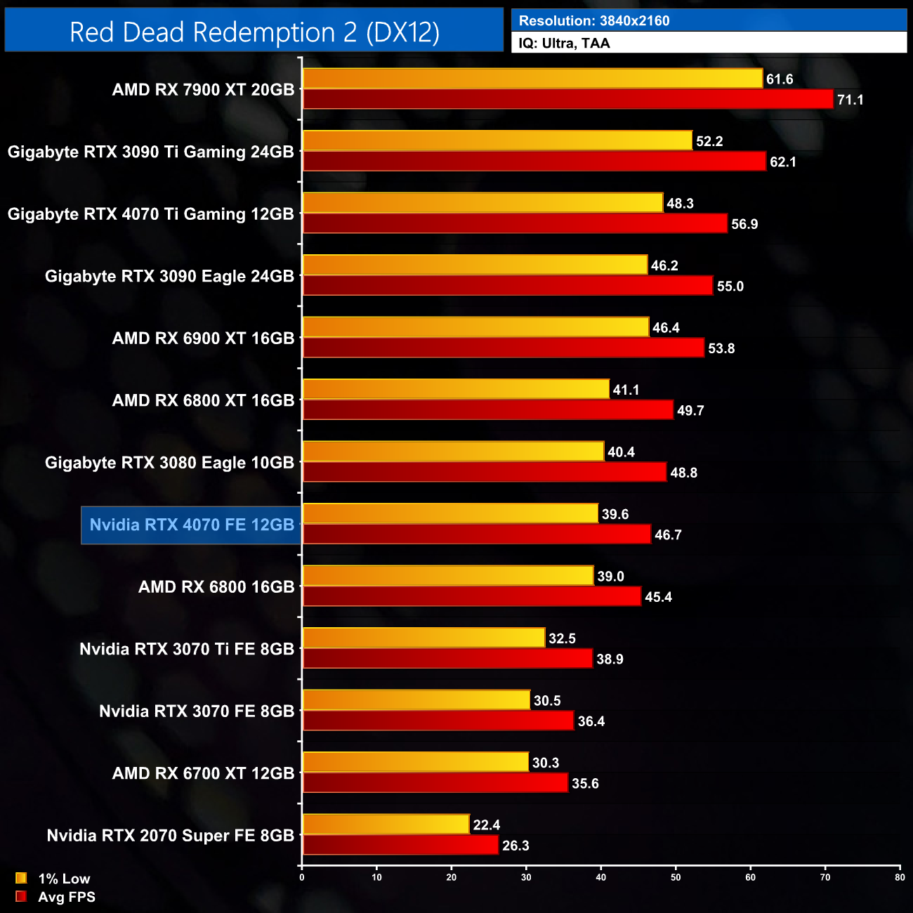 Lastly, we finish up with a look at Metro Exodus Enhanced Edition. Despite a large amount of ray tracing, this game is still very performant, with the 4070 hitting over 120FPS at 1440p, where it's within 2% of the 3080 and is within 8% of the RX 7900 XT.