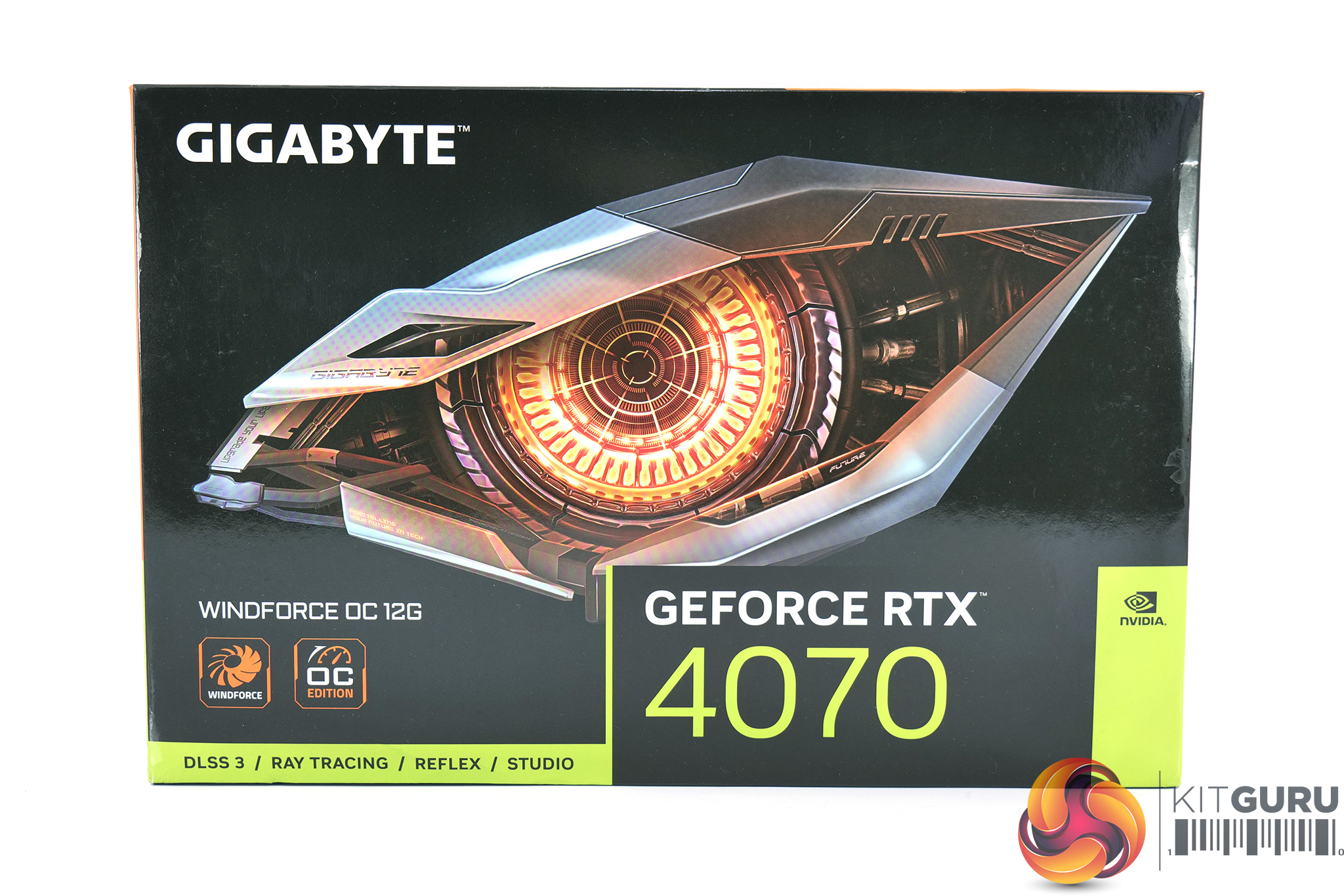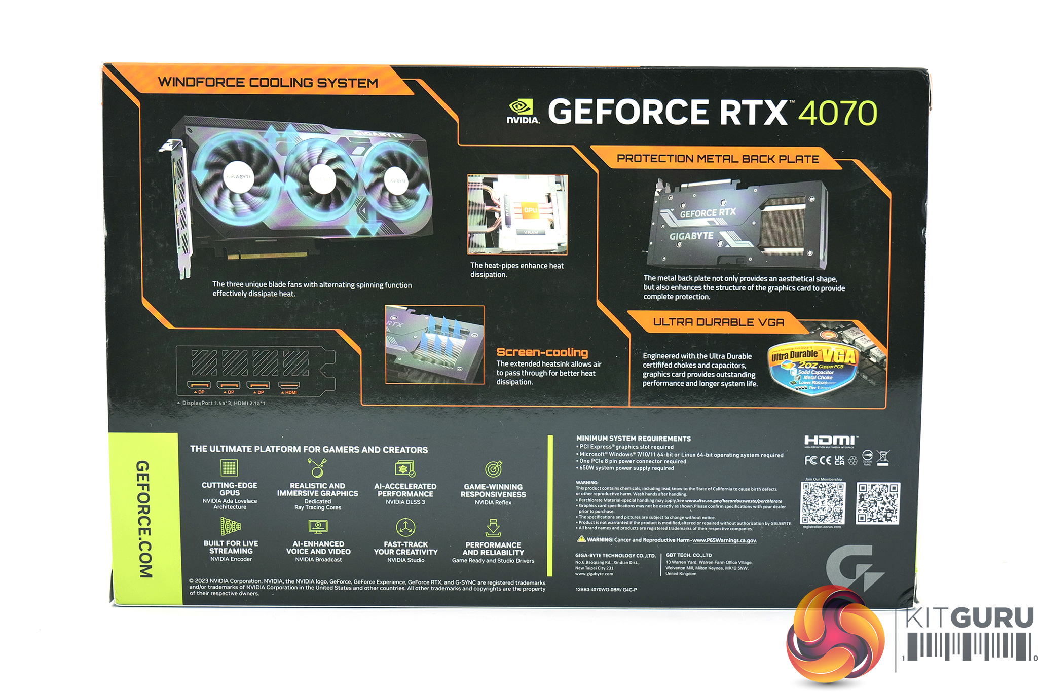 The Gigabyte RTX 4070 Windforce OC ships in a very familiar-looking box, with a large robotic eye visible on the front along with the GeForce branding. On the back, Gigabyte highlights a number of key features.
