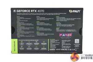 Palit's RTX 4070 Dual ships in a black box, with some blue accents on the front – you can also make out the two fans, hence the name ‘Dual'. On the back, Palit highlights some key information in multi-lingual text.