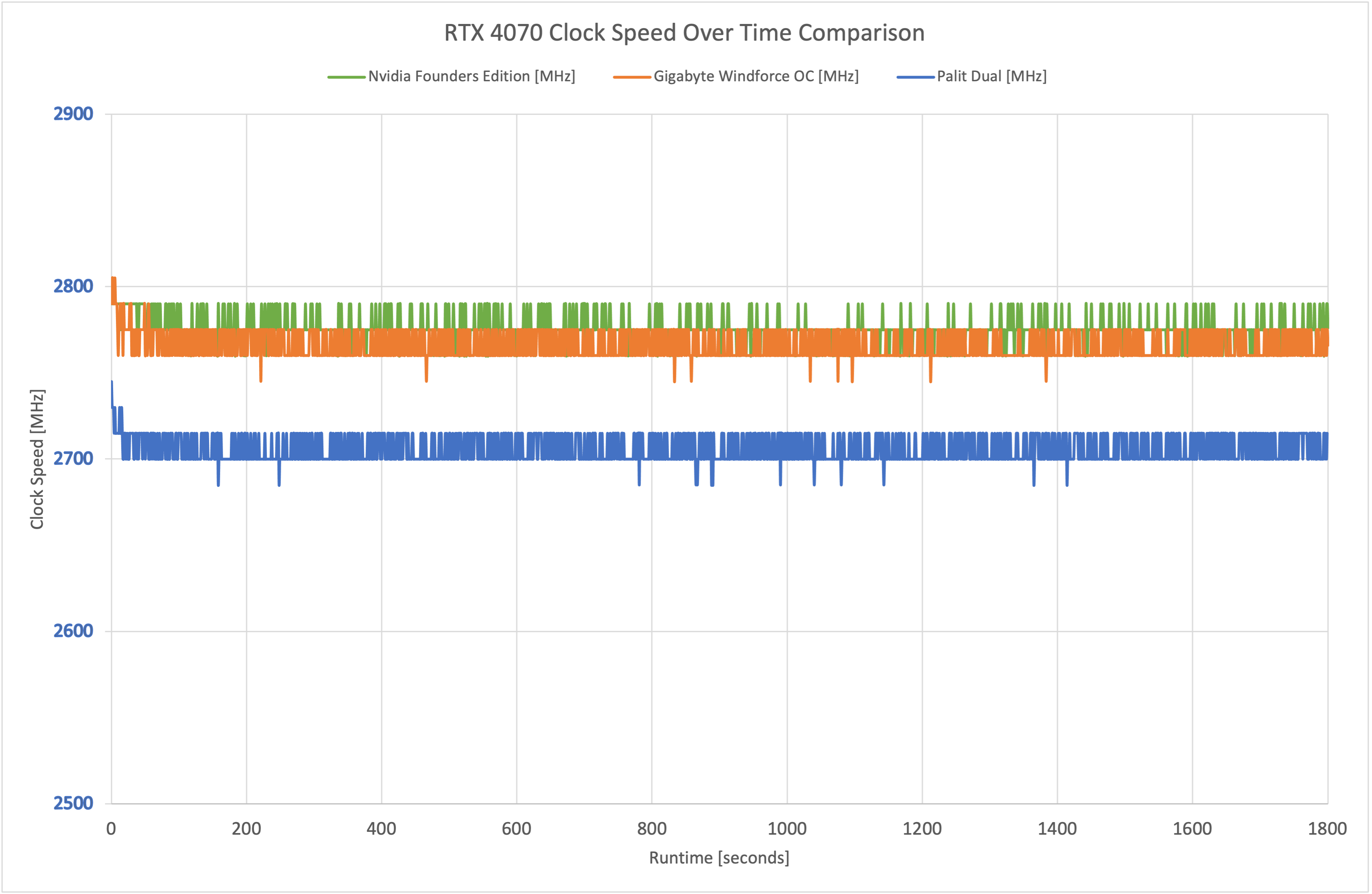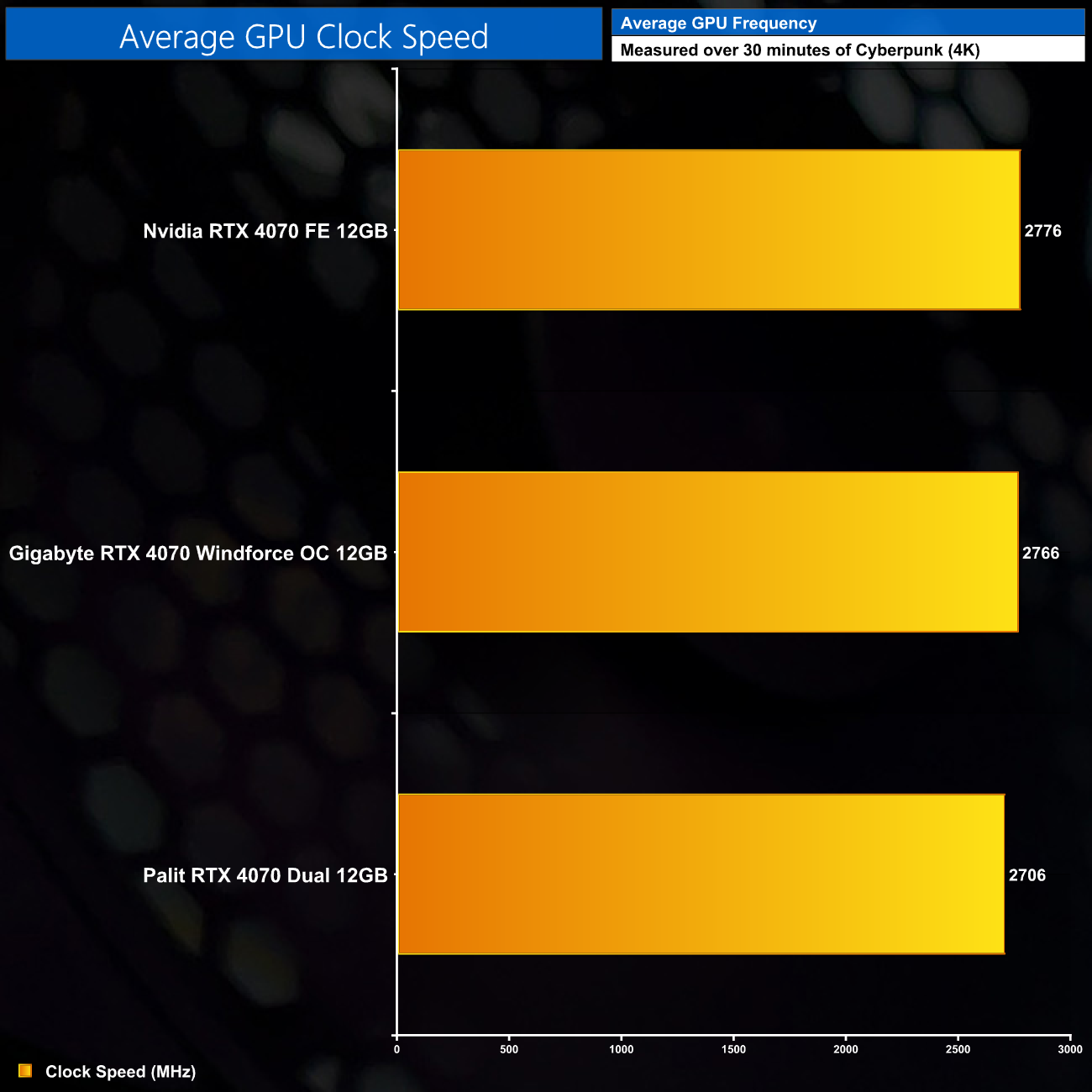We run a 30 minute stress test to log the operating frequency of the GPU. It's interesting to note that the Gigabyte Windforce OC and Nvidia Founders Edition run at very similar clock speeds, while the Palit Dual is a touch slower – despite sharing the same rated boost clock as the Founders Edition. Still, the differences aren't huge (70MHz on average) but it's worth noting.