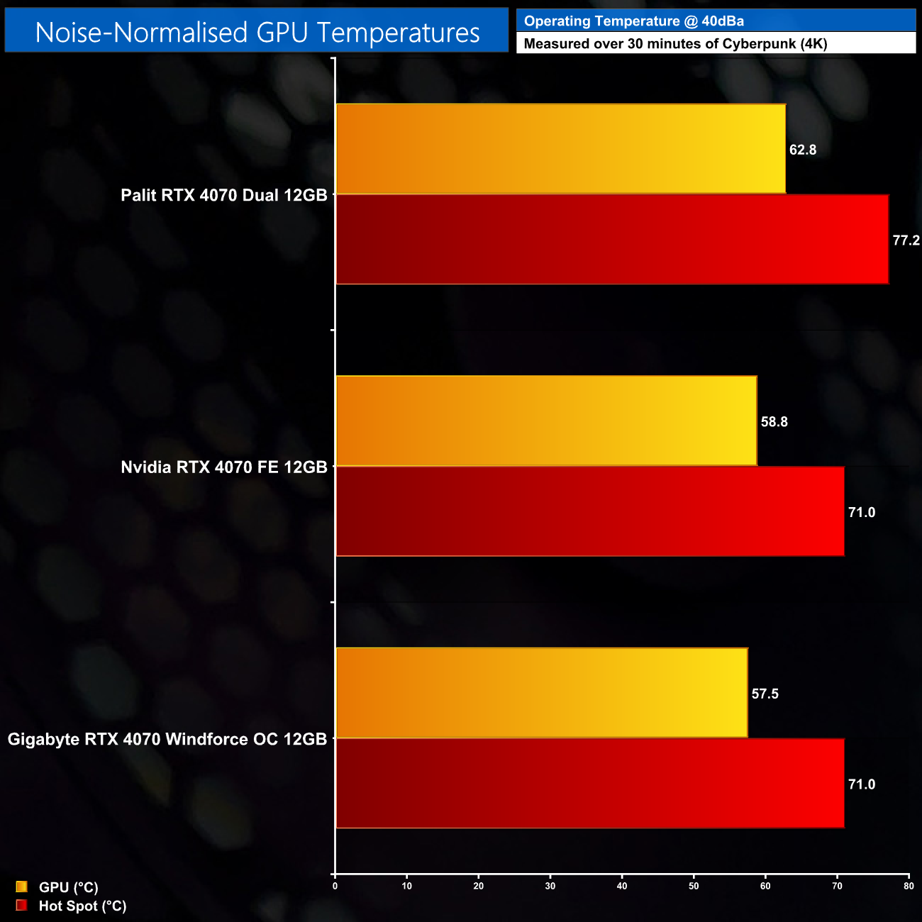 Normalising noise output to 40dBa and then re-testing thermals results in a small victory for the Windforce OC – its GPU temperature came in 1.3C cooler than the Founders Edition, but with both GPUs hitting a hot spot of 71C. Even though the Palit Dual did run the hottest, its thermal levels are still more than adequate – the cooler just isn't quite so efficient as the Windforce.