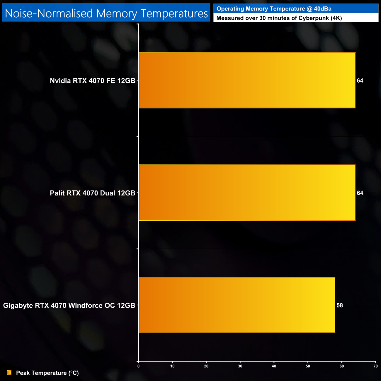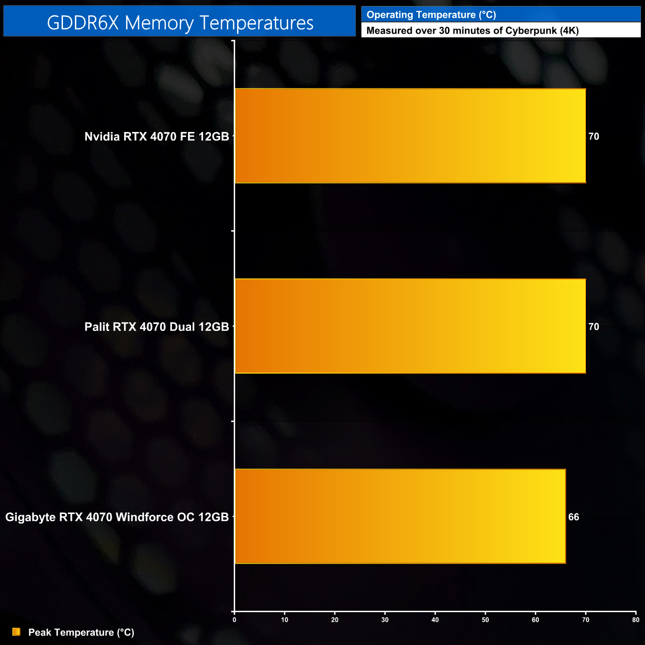 GDDR6X memory temperatures leave very little to be desired, with both the Founders Edition and Palit Dual hitting 70C. 30-series Founders Editions had some real problems with GDDR6X cooling, so it's good to see Nvidia has improved things this time around. Gigabyte's Windforce model ran the coolest out of the box, with the memory peaking at 66C.
