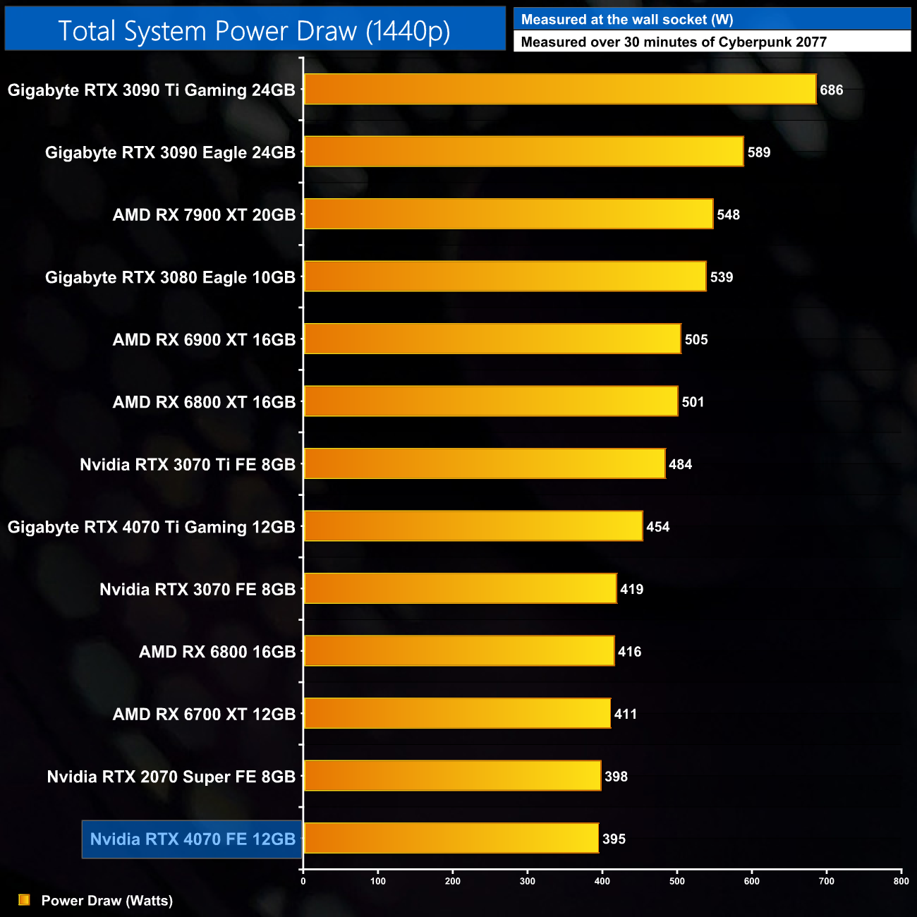 At 1440p, the 4070 remains a highly efficient GPU, now just about edging ahead of the RTX 4070 Ti. It's still 67% more efficient than the RTX 3080, while offering a 17% improvement in performance per Watt versus the RX 7900 XT.
