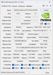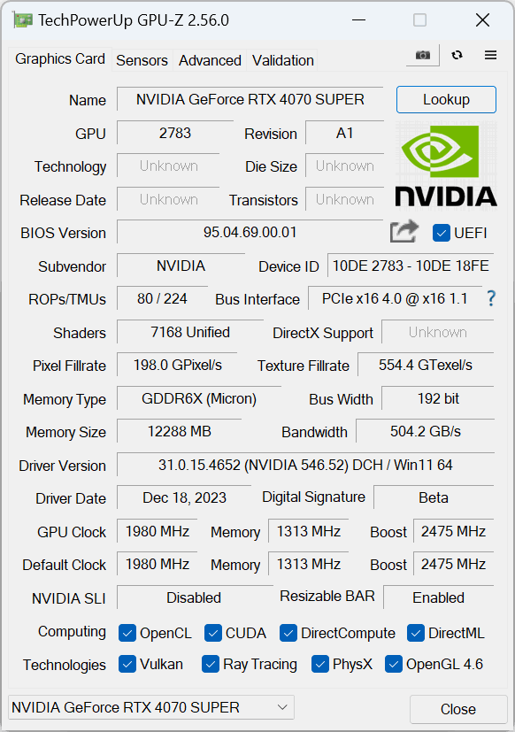 First, a quick spec recap. Just like the RTX 4070 Ti and RTX 4070, the new 4070 Super uses a cut-down AD104 die, measuring 295mm2. The fundamental building blocks are still the same of course, with the RTX 4070 Super offering a total of 56 Streaming Multiprocessors (SMs), each housing 128 CUDA Cores, for a total of 7168. We also find 56 RT cores, 224 Tensor cores, 224 Texture Units, and 80 ROPs.