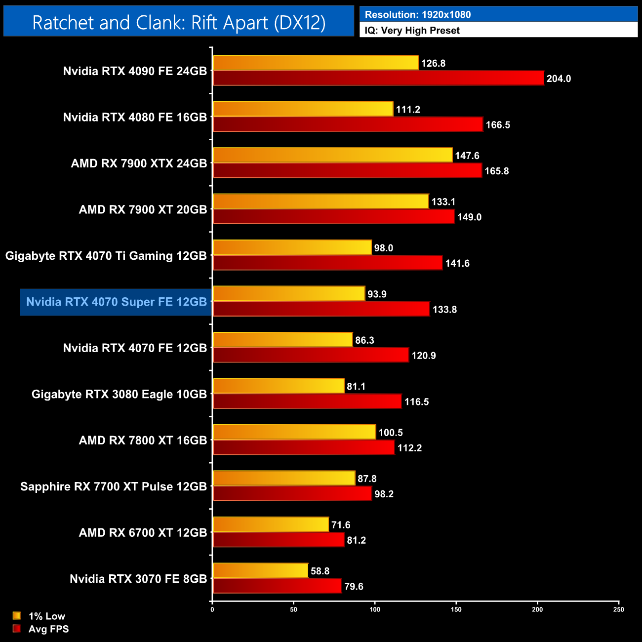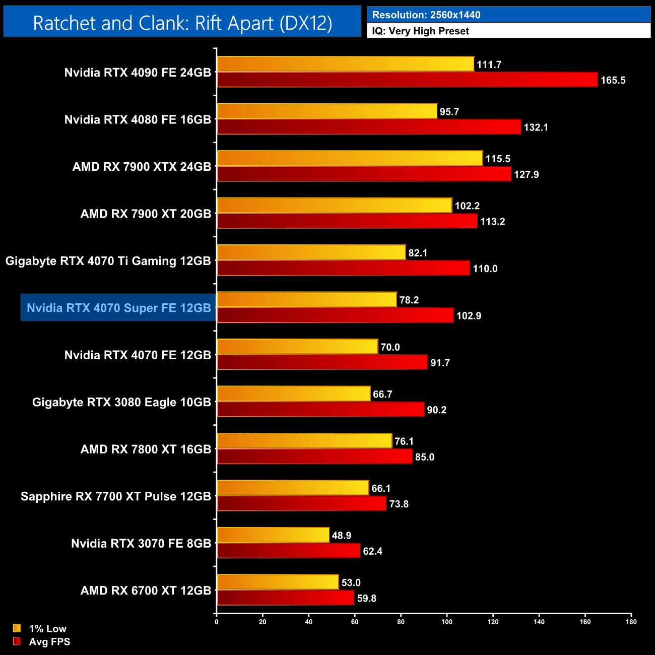 As for Ratchet and Clank, Nvidia GPUs still struggle with the 1% lows in this game, which we had previously heard was due to the game's DirectStorage implementation. A workaround is possible but we test without modifying any game files. At 1440p for instance, the 4070 Super is 21% faster than the RX 7800 XT on average, but barely any faster in terms of the 1% lows.