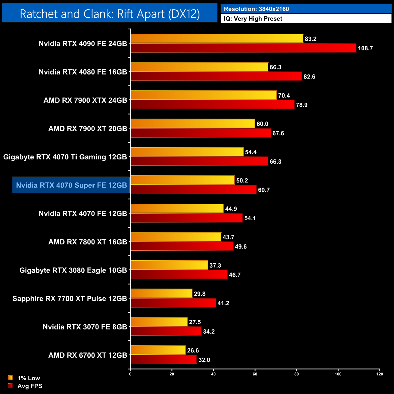 This does improve at 4K however, where the 4070 Super is 22% faster than the 7800 XT on average but now 15% ahead in terms of the 1% lows. We're again looking at a boost in the 12% region relative to the vanilla 4070.