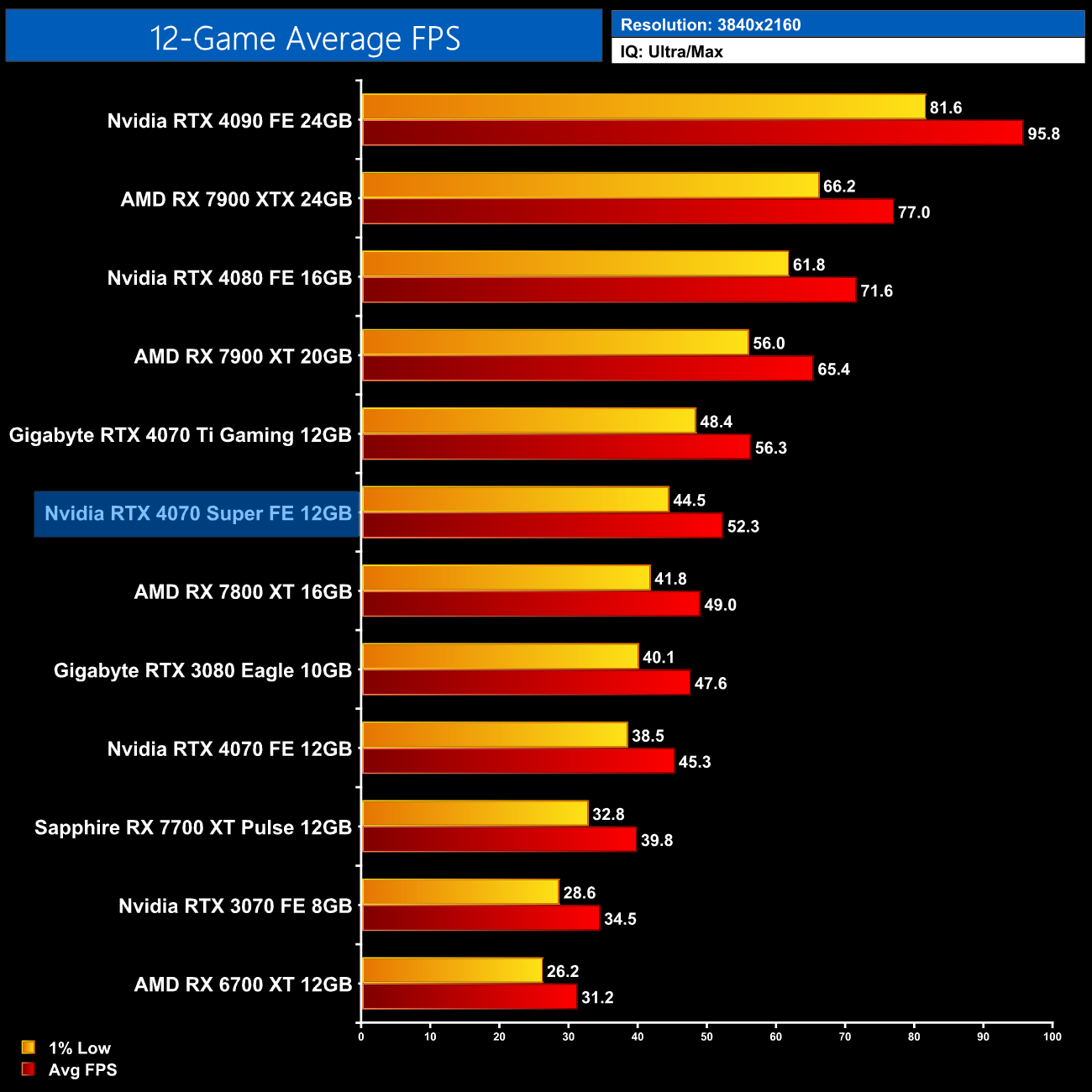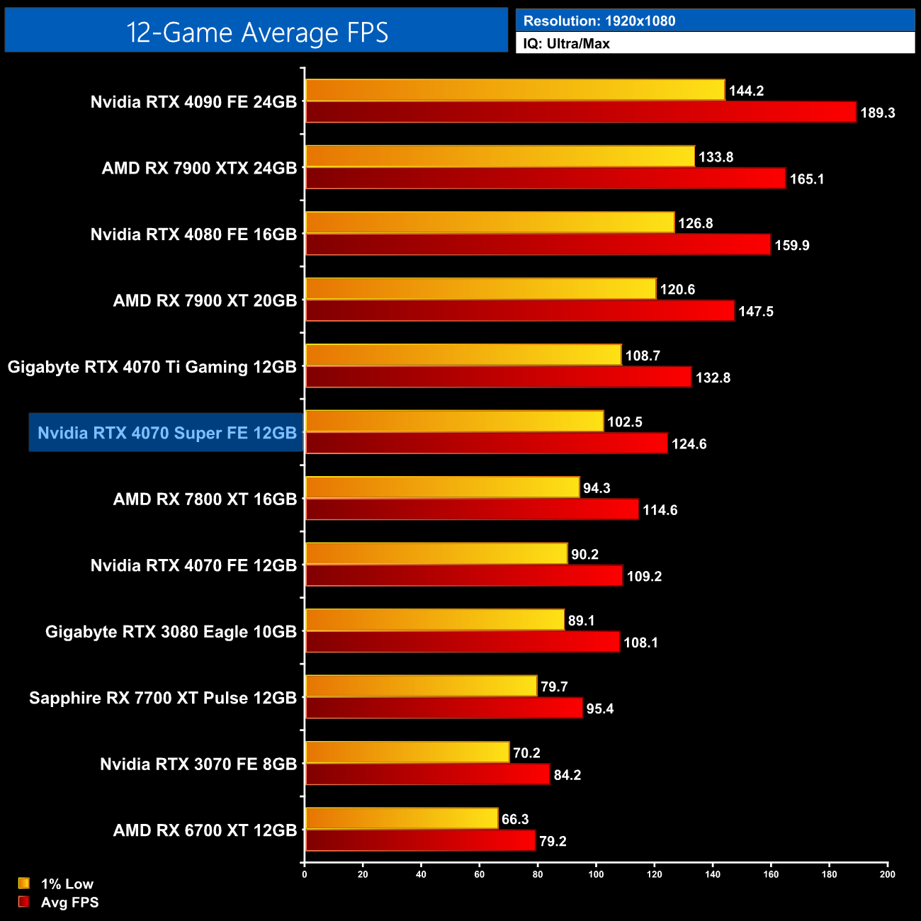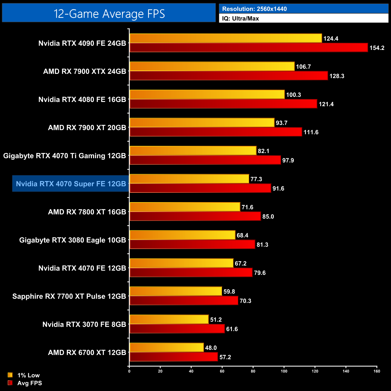 After 12 games, the results are pretty much what we expected given the specs – the RTX 4070 Super slots between the original RTX 4070 and the RTX 4070 Ti, though it is much closer to the latter GPU than it is the former. That's because, at 1440p, it is on average 15% faster than the 4070 but just 6% slower than the 4070 Ti. That also makes it 8% faster than the RX 7800 XT, 13% ahead of the RTX 3080 10GB, but still 18% slower than the RX 7900 XT.