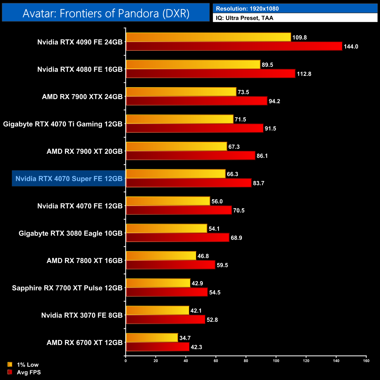 Avatar: Frontiers of Pandora is another new game today that has ray tracing baked into the core of the engine. The 4070 Super delivers 57FPS, and that's a typical 16% uplift versus the RTX 4070. It's also 35% faster than the 7800 XT, and only a handful of frames slower than the 7900 XT.