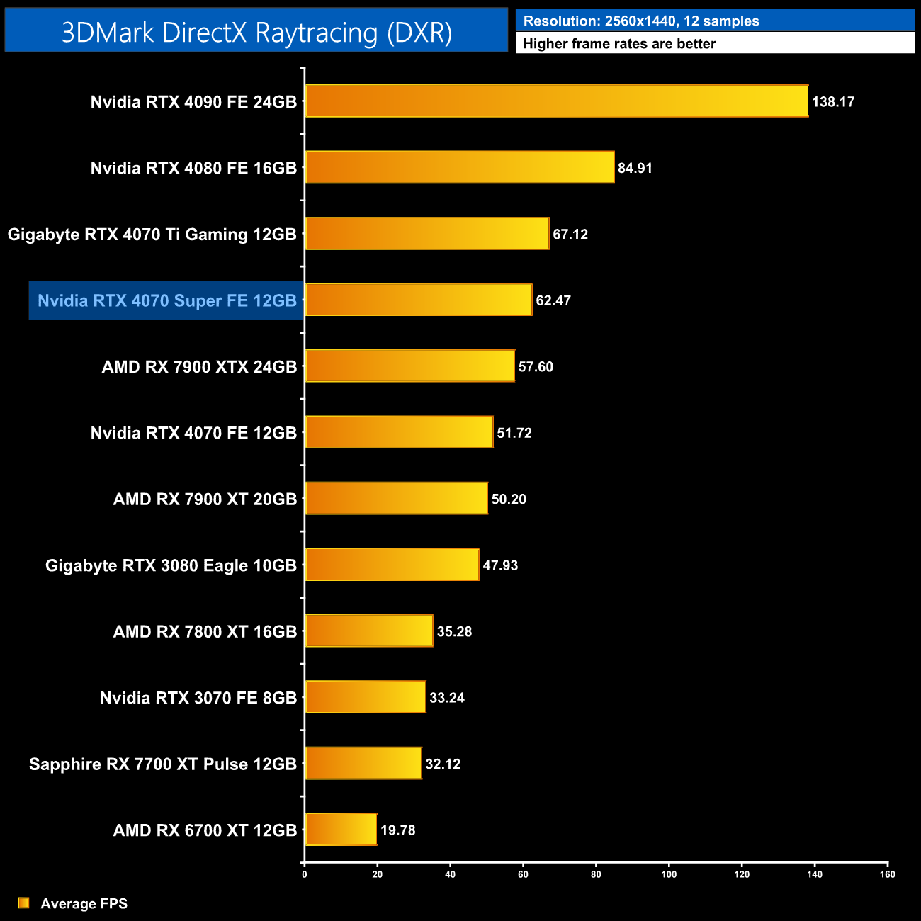 3DMark's DXR feature test slots the 4070 Super just 7% behind the RTX 4070 Ti, while it outperforms even the flagship RX 7900 XTX from AMD.