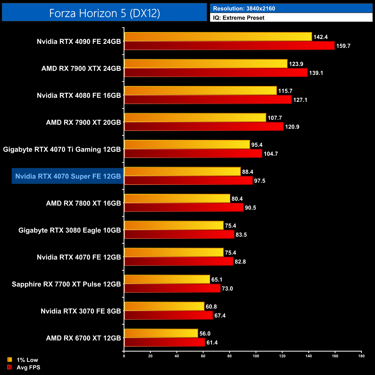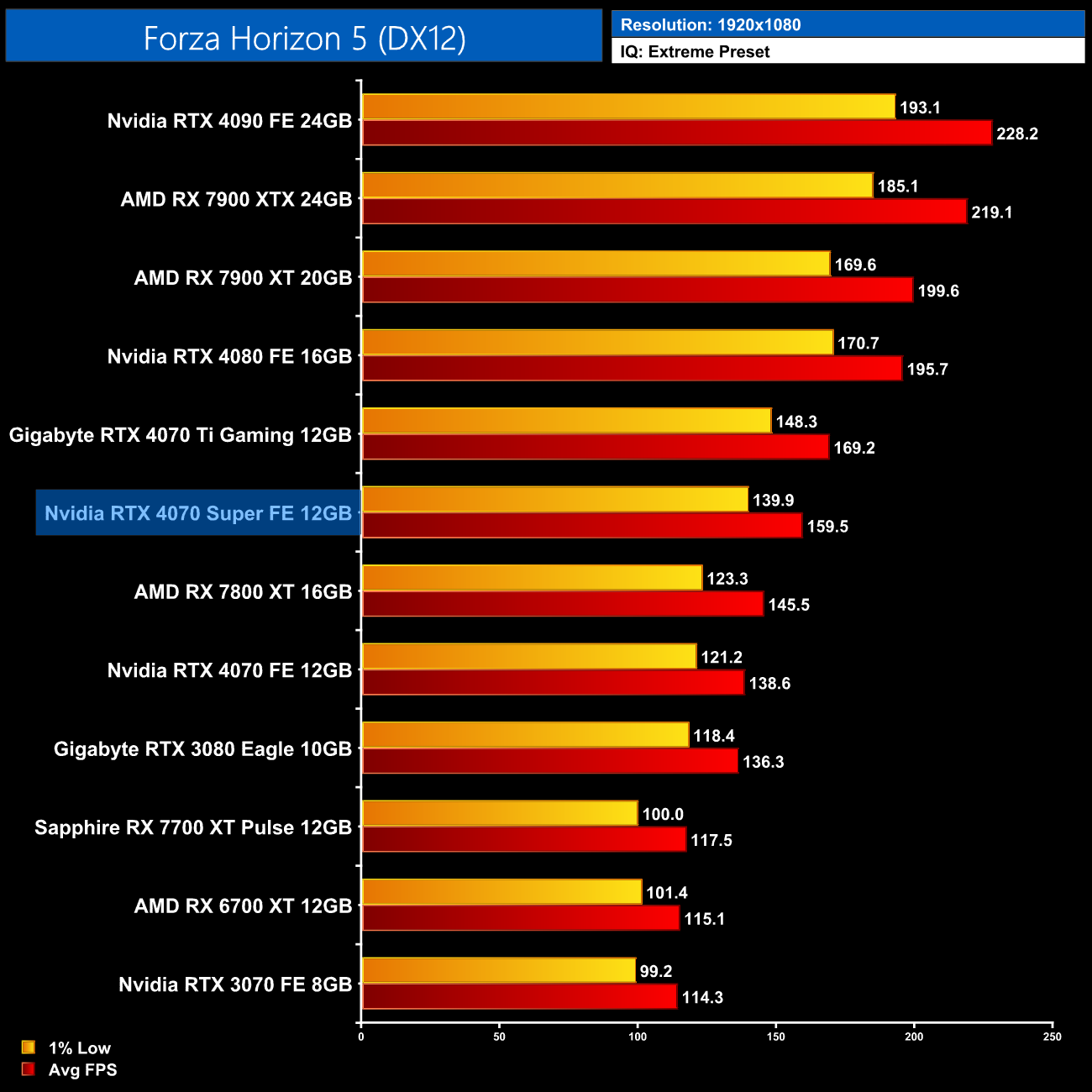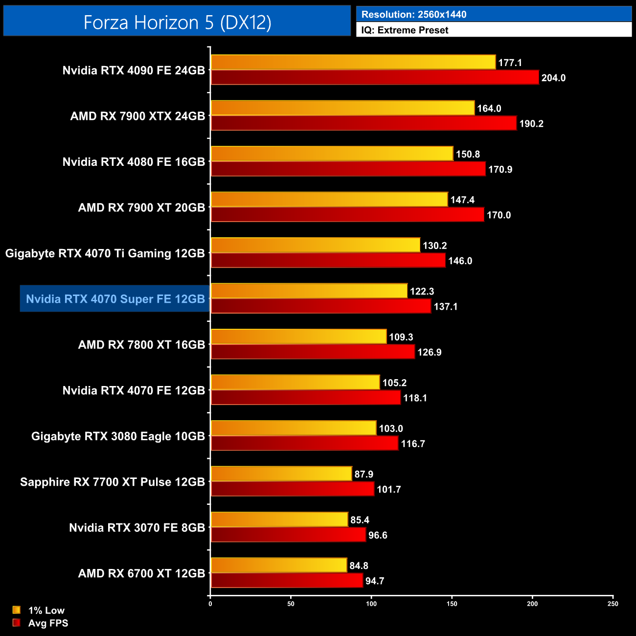 Moving onto Forza Horizon 5, the 4070 Super speeds through this one, delivering 137FPS at 1440p, and that's a 16% lead over the RTX 4070. It's also 8% faster than the 7800 XT and 6% slower than the 4070 Ti.