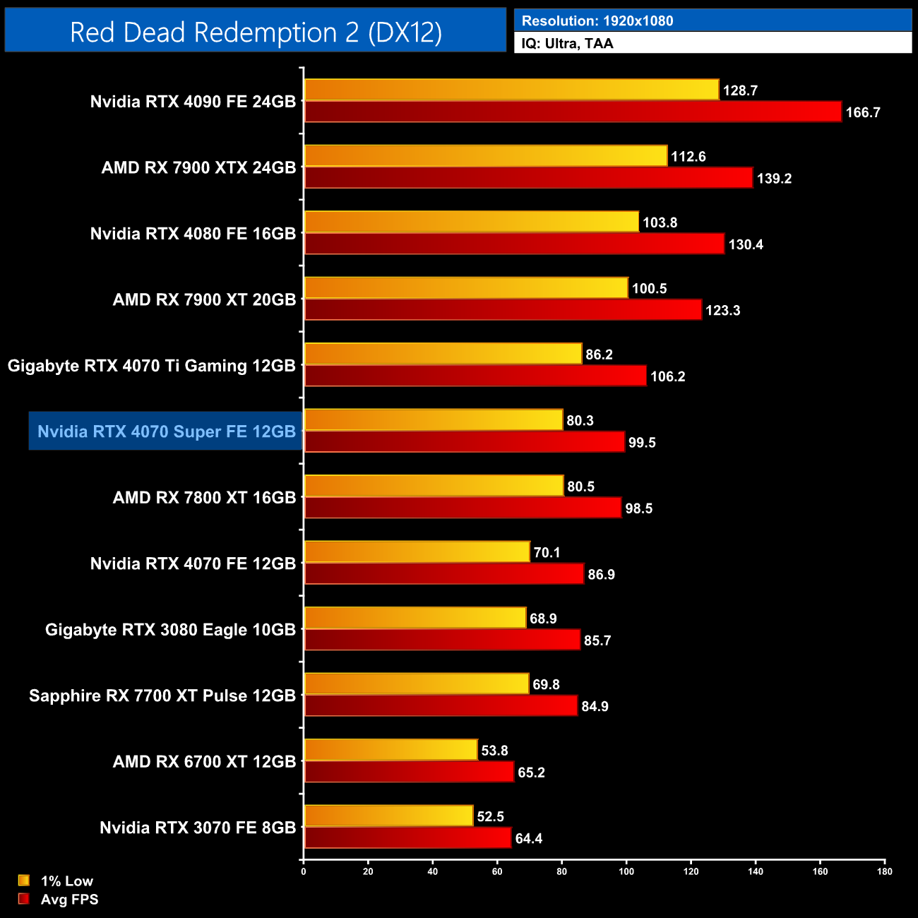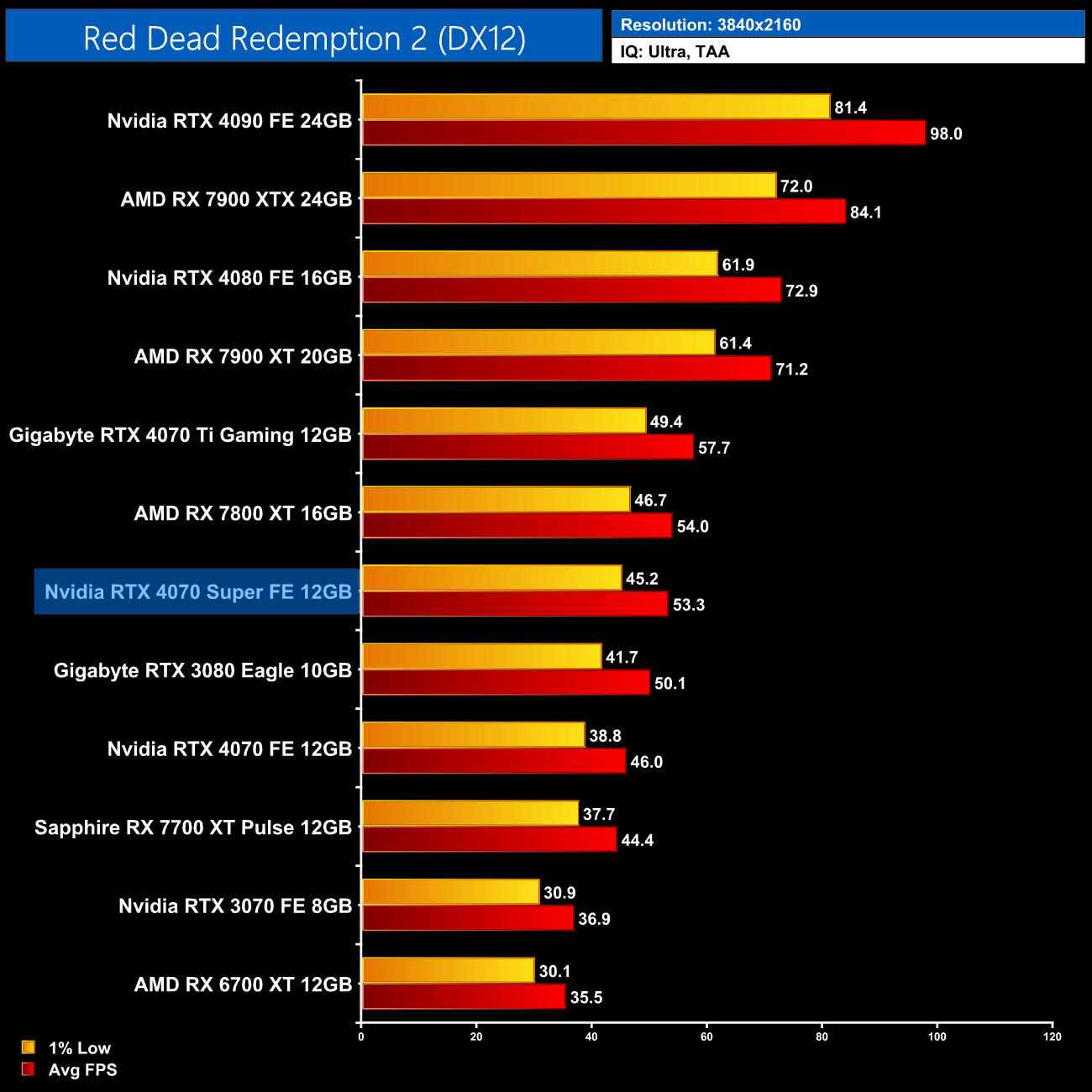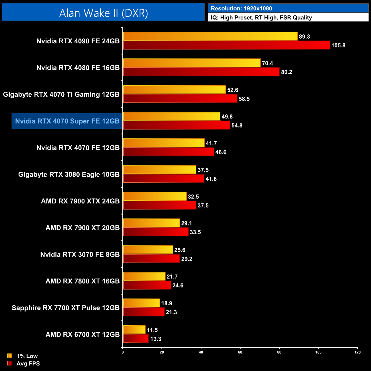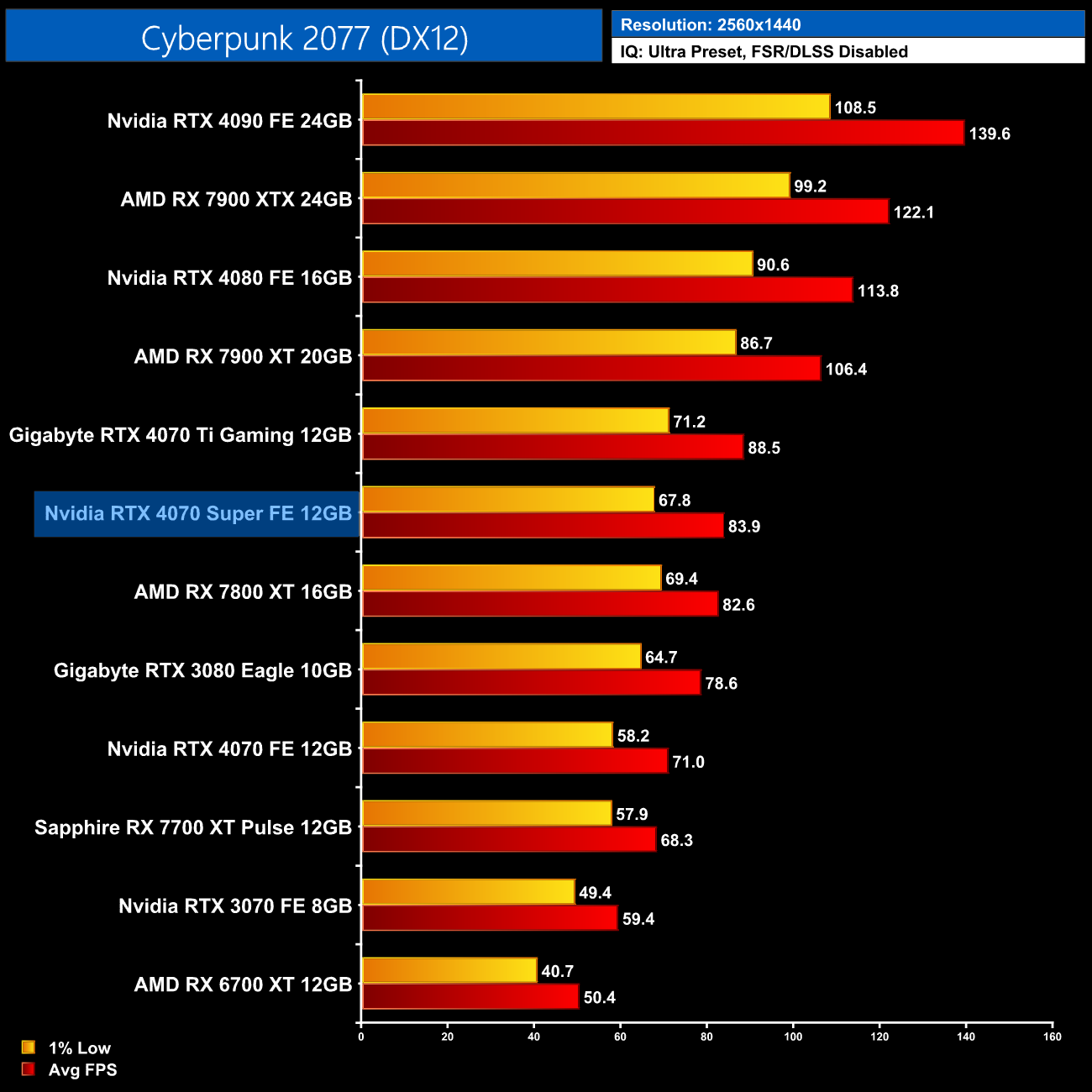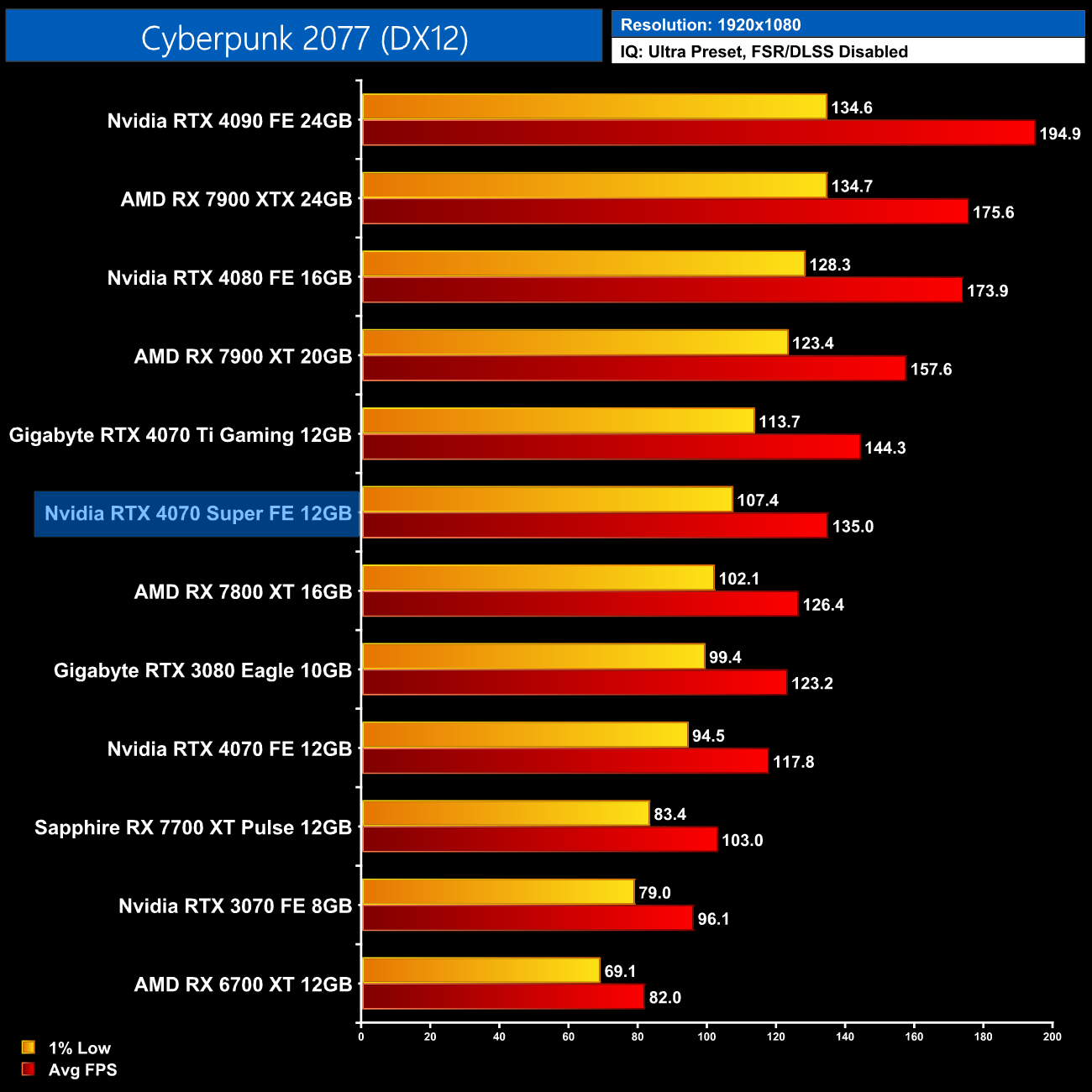 As for Cyberpunk 2077, we're on using the RT Ultra preset here – not the path-traced RT Overdrive mode – but it's still very punishing, bringing the 4070 Super to just 43FPS on average without any form of upscaling. That still makes it faster than the RX 7900 XTX though, and it's the usual 17% faster than the 4070.
