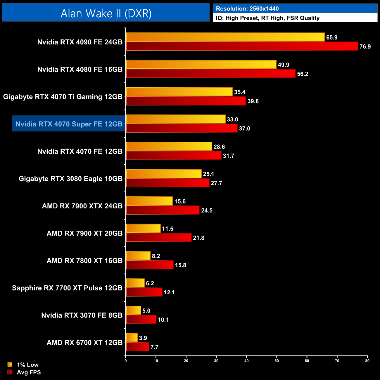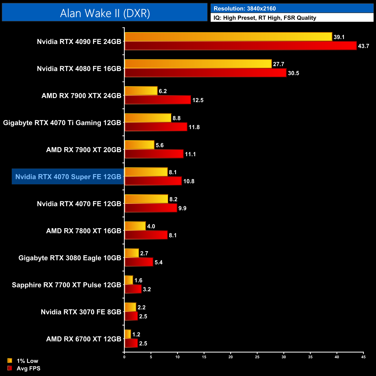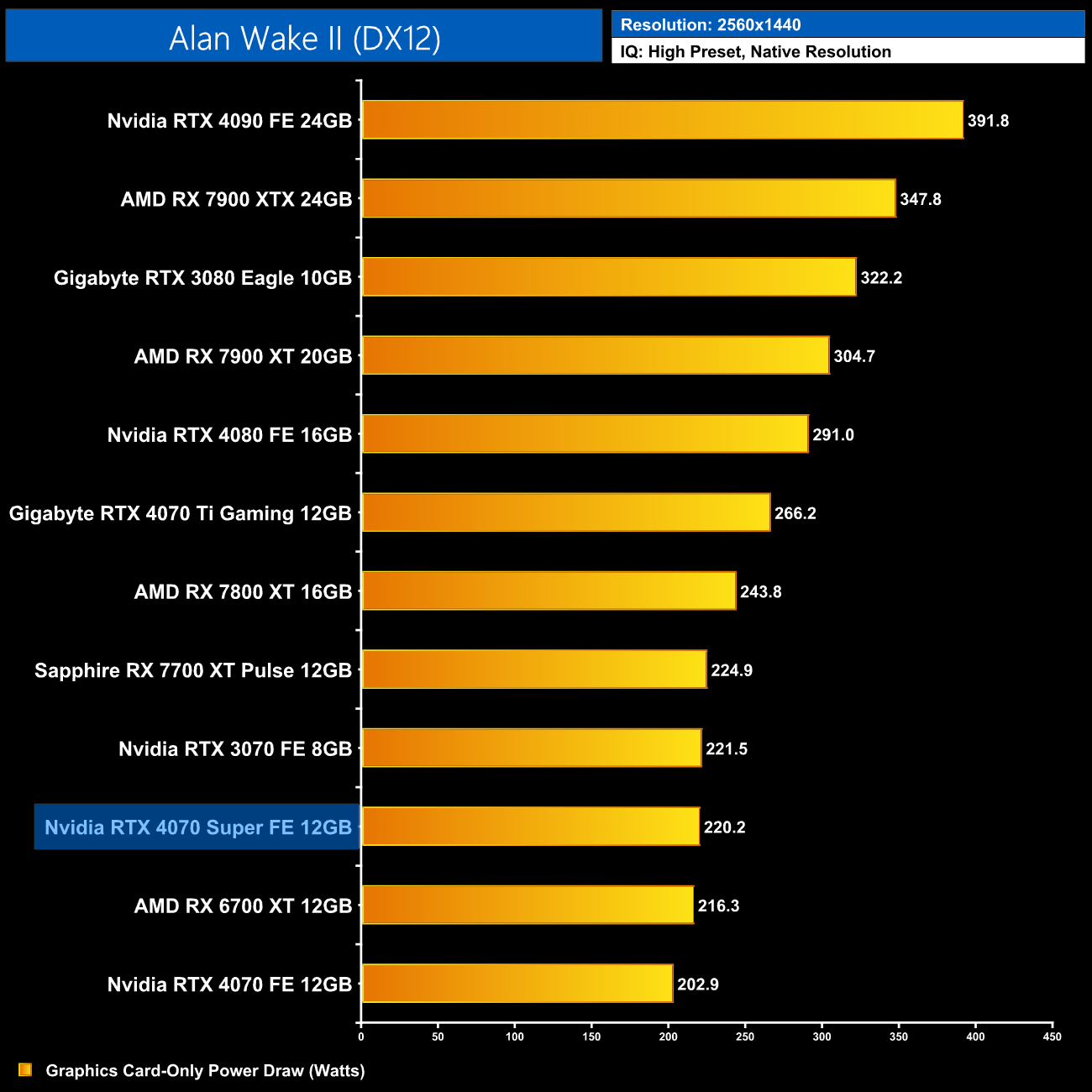 Interestingly, average power draw drops at 4K when looking at the ray traced games. This is mainly due to Alan Wake II, which chokes the 4070 Super at 4K with maximum ray tracing details – the GPU appears to be memory bandwidth or possibly VRAM starved, dropping power draw significantly.
