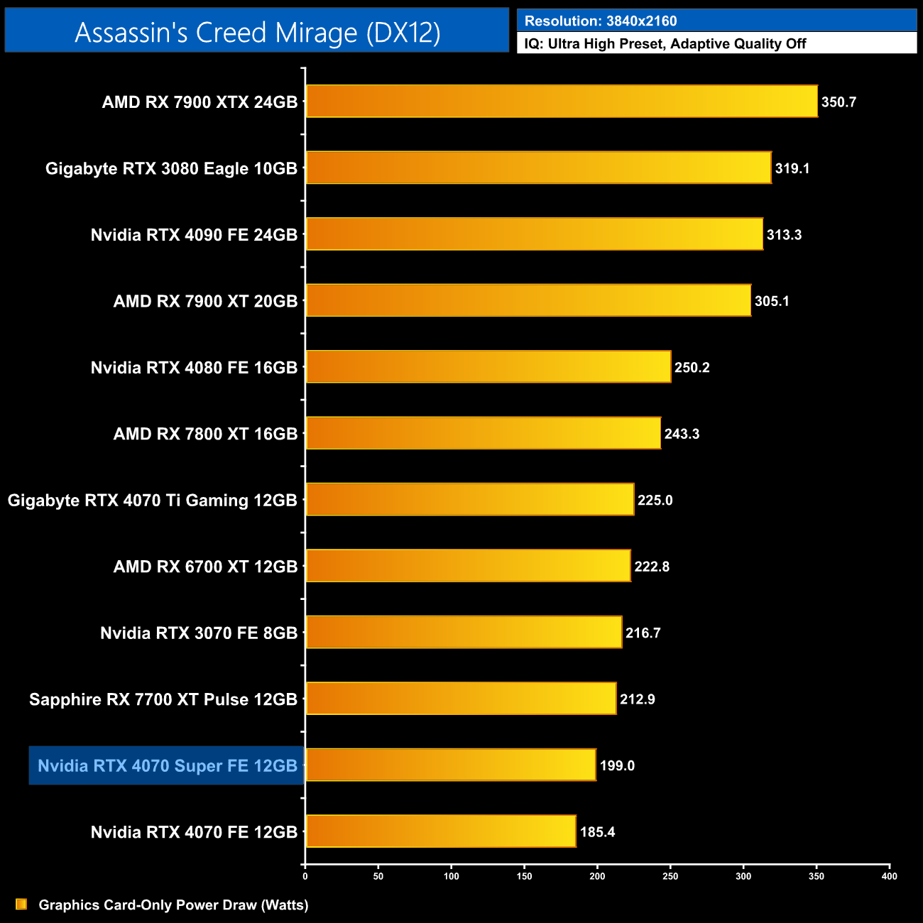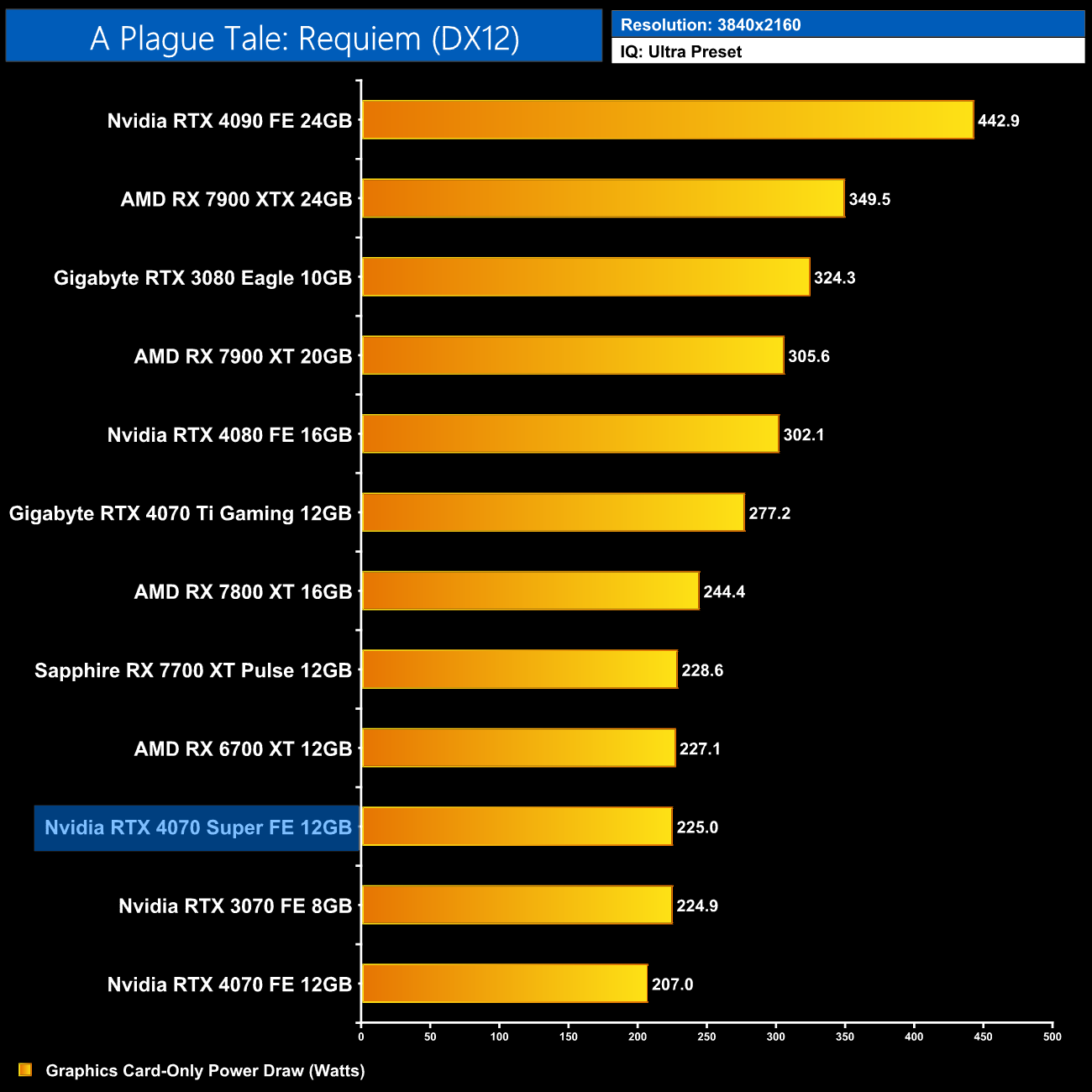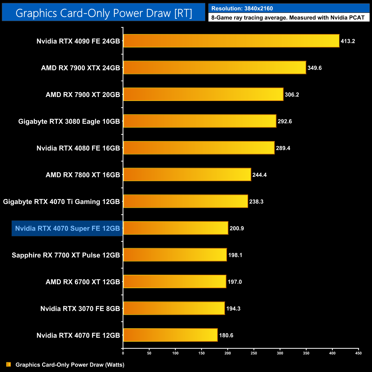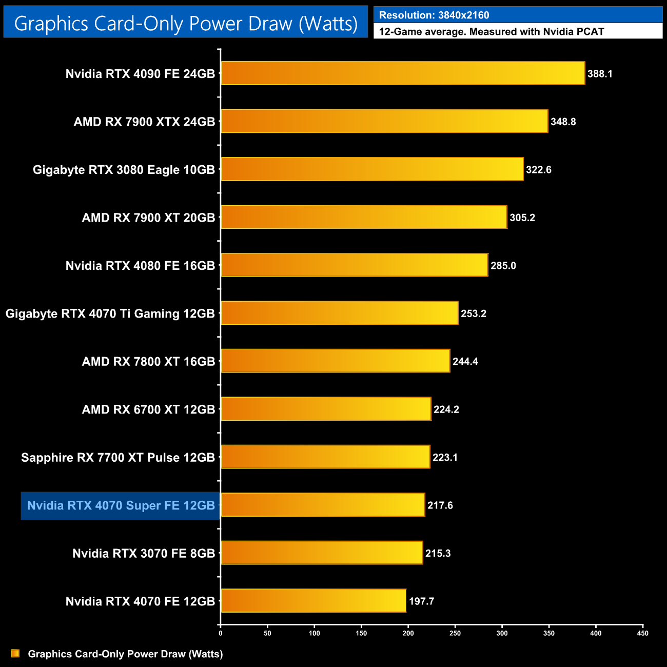 Here we present power draw figures for the graphics card-only, on a per-game basis for all twelve games we tested at 2160p (4K). This is measured using Nvidia's Power Capture Analysis Tool, also known as PCAT. You can read more about our updated power draw testing methodology HERE.