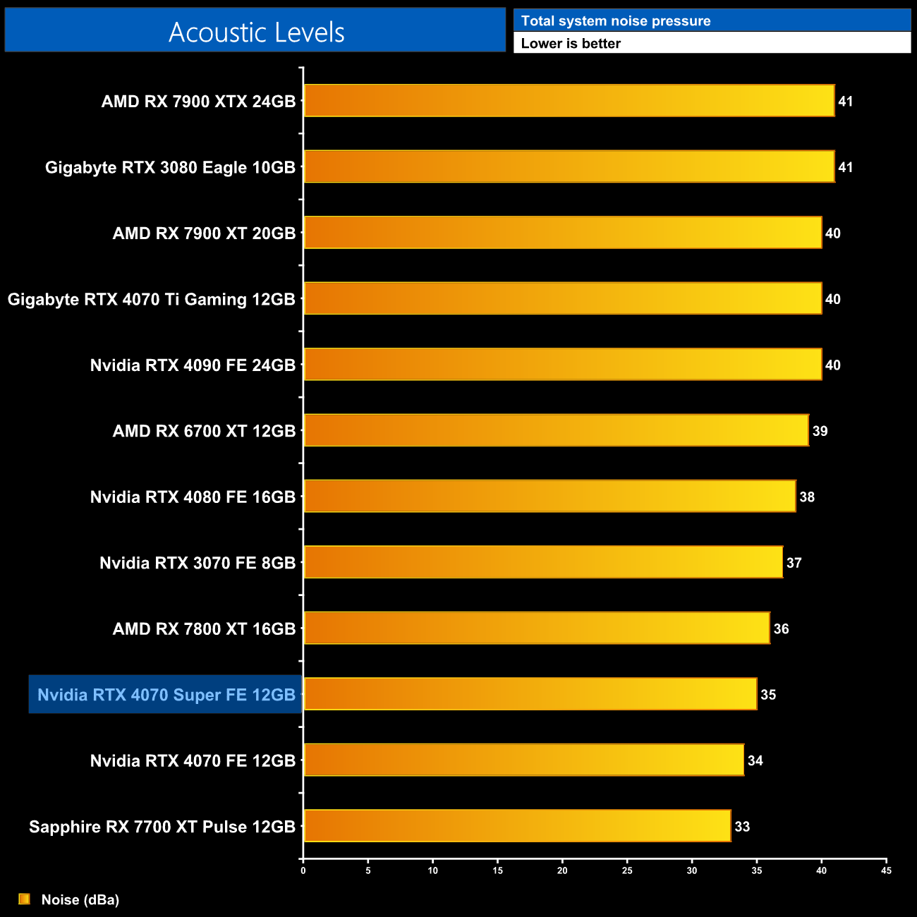 We take our noise measurements with the sound meter positioned 1 foot from the graphics card. I measured the noise floor to be 32 dBA, thus anything above this level can be attributed to the graphics cards. The power supply is passive for the entire power output range we tested all graphics cards in, while all CPU and system fans were disabled. A reading under load comes from running Cyberpunk 2077 for 30 minutes.
