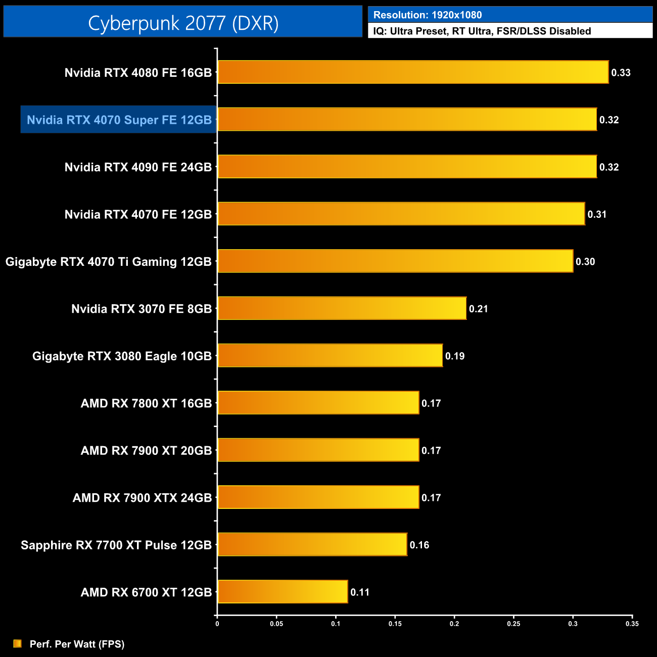 At 1440p, average performance per Watt has increased by 5% compared to the vanilla RTX 4070. The 4080 remains the most efficient GPU we've tested, but compared to RDNA 3, there is a clear lead for Nvidia's Ada architecture on show – the 4070 Super is 19% more efficient than AMD's RX 7900 XT and 7900 XTX.