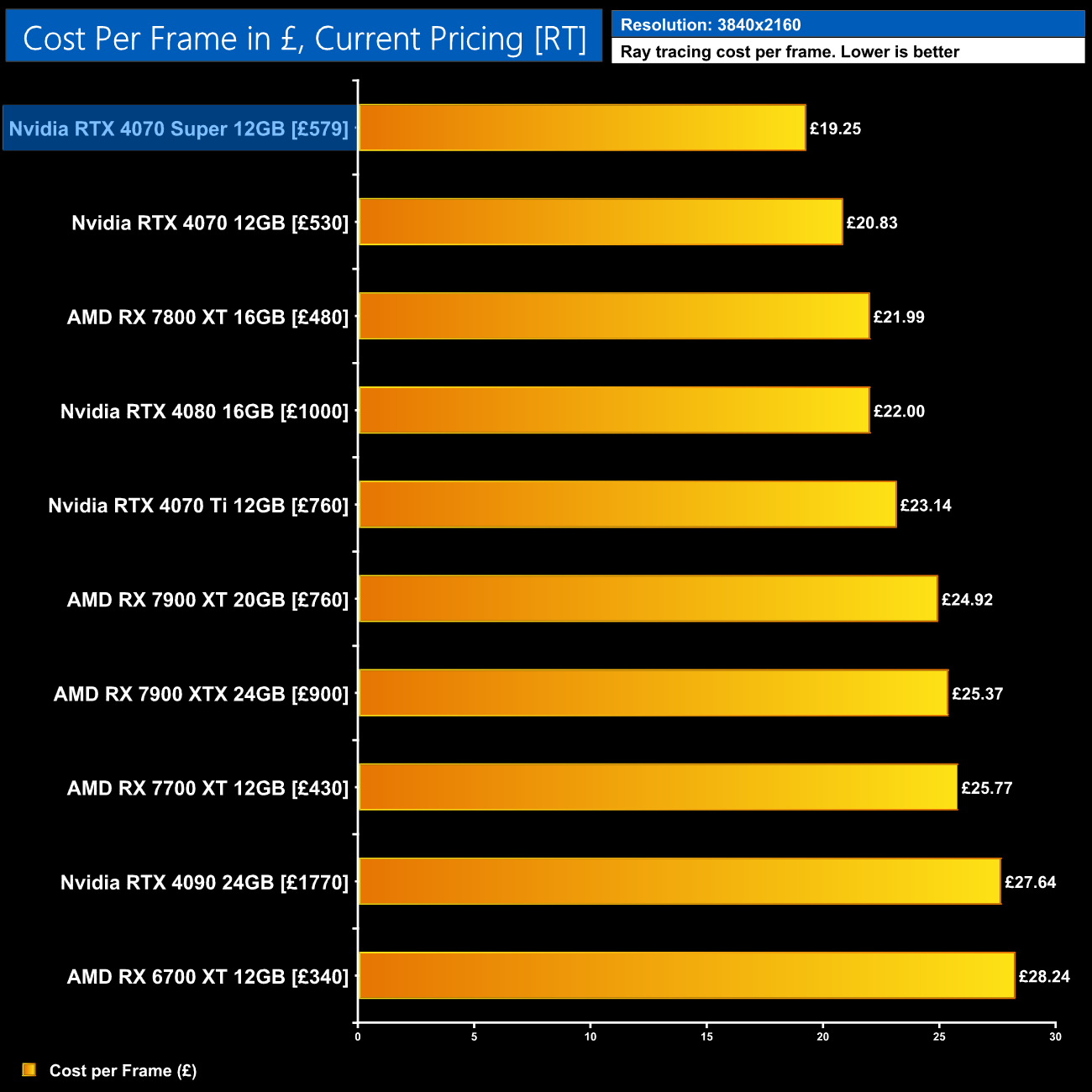 Even with the RTX 4070 on sale for as little as £530, the 4070 Super at £579 would represent a 6% improvement in ray tracing cost per frame when looking at the 1440p data using current retail prices.