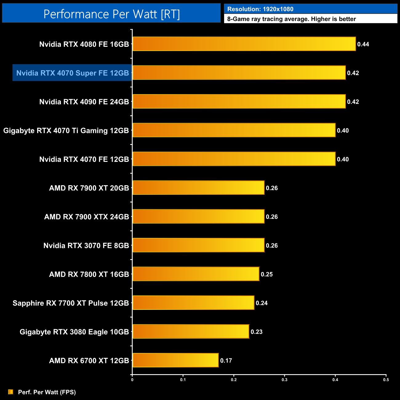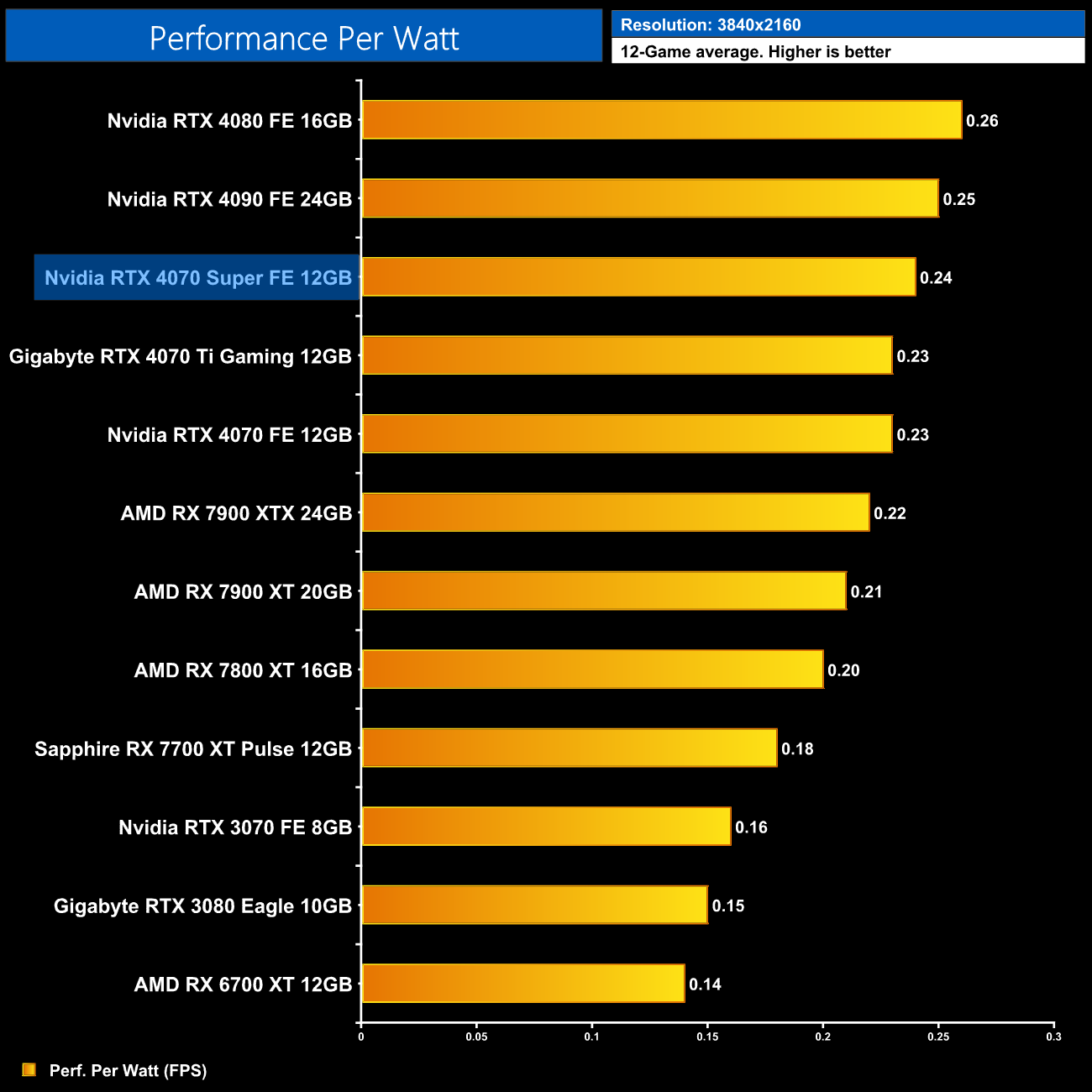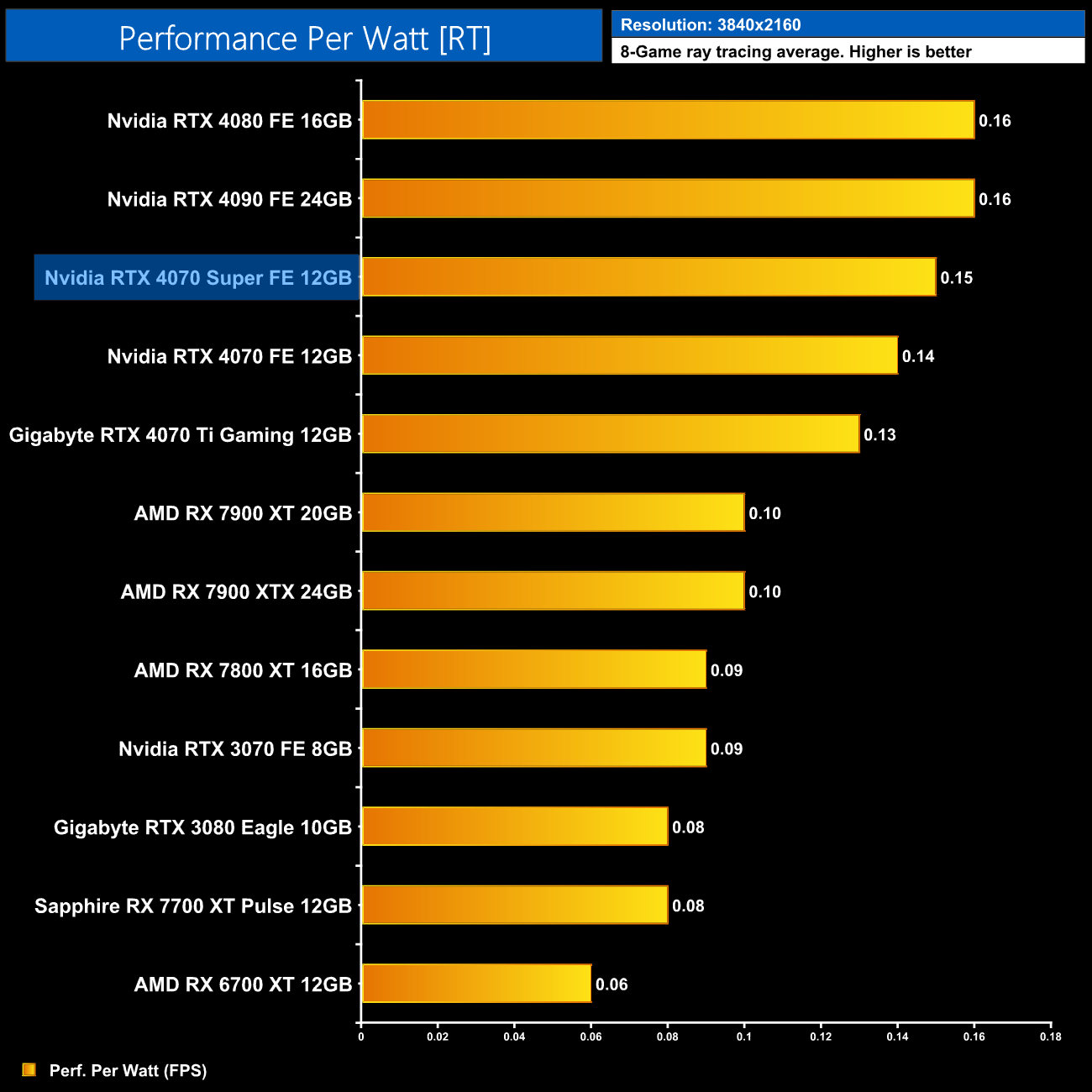 Lastly, at 4K, we see very similar results to the 1440p data, with the 4080 and 4090 still being a touch more efficient than the 4070 Super, but this new GPU is right up there.