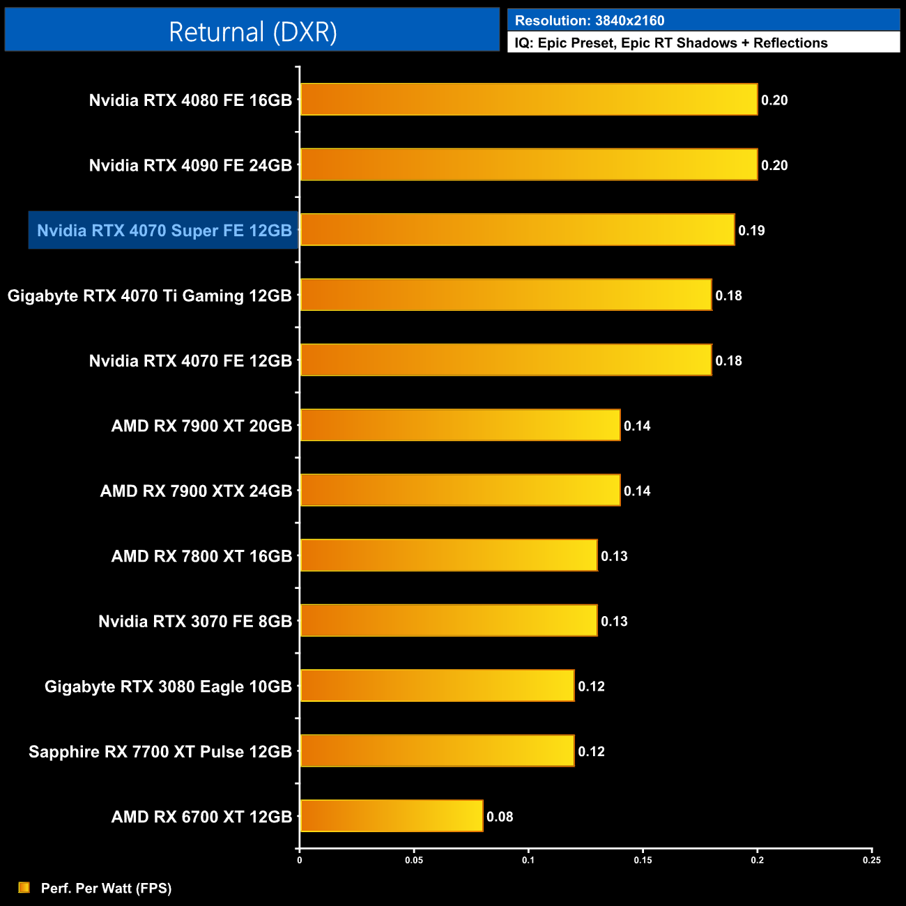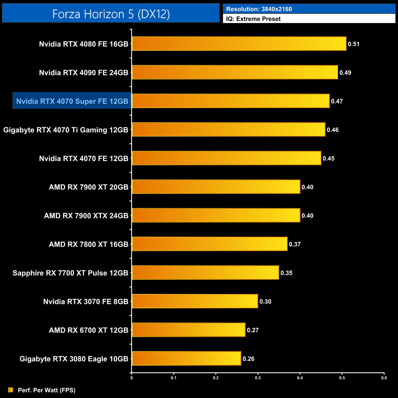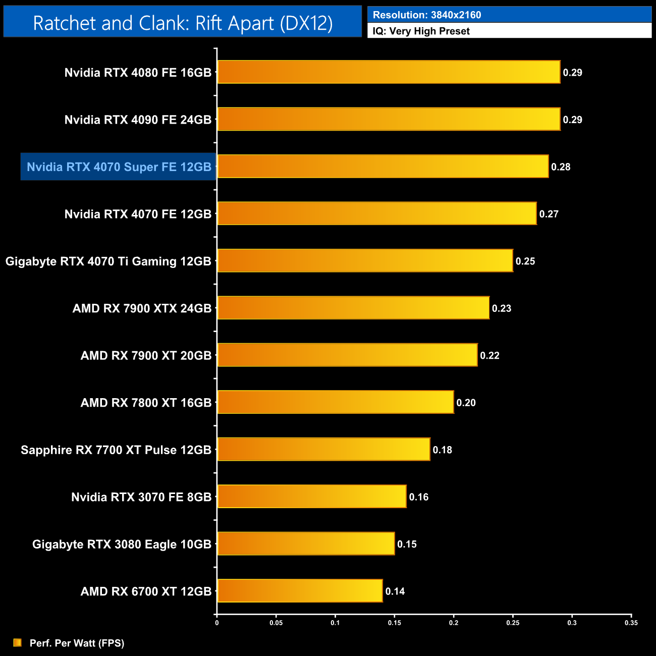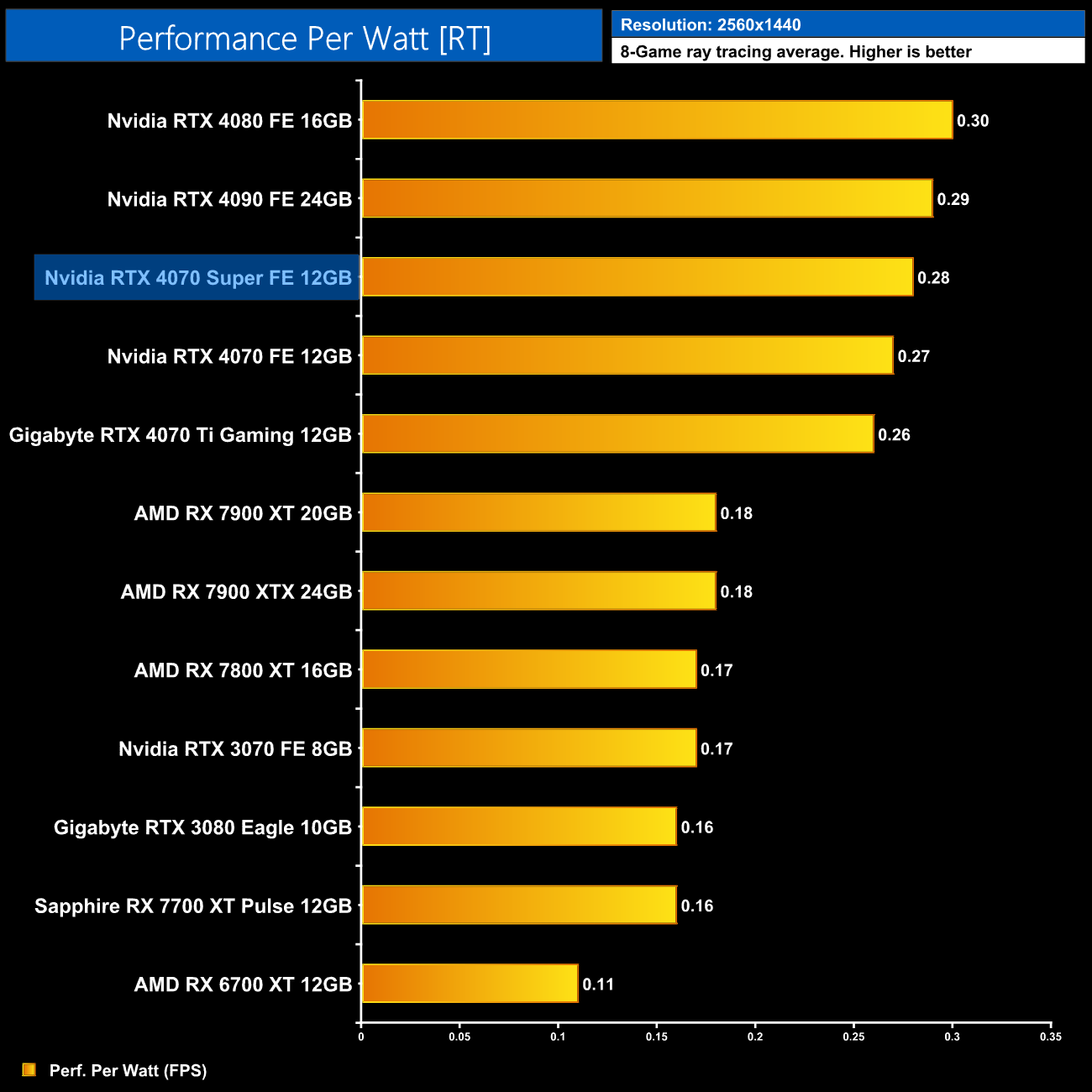 Lastly, at 4K, we see very similar results to the 1440p data, with the 4080 and 4090 still being a touch more efficient than the 4070 Super, but this new GPU is right up there.